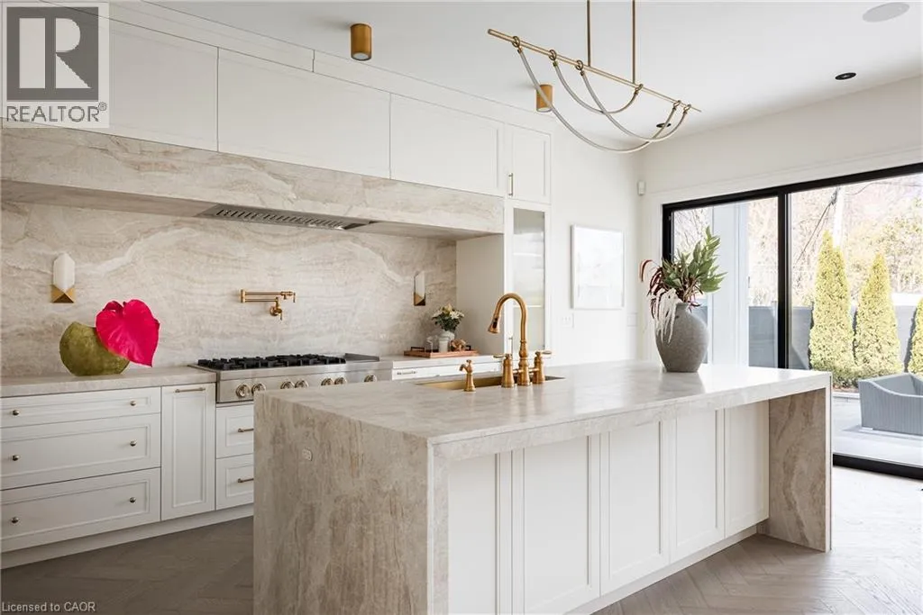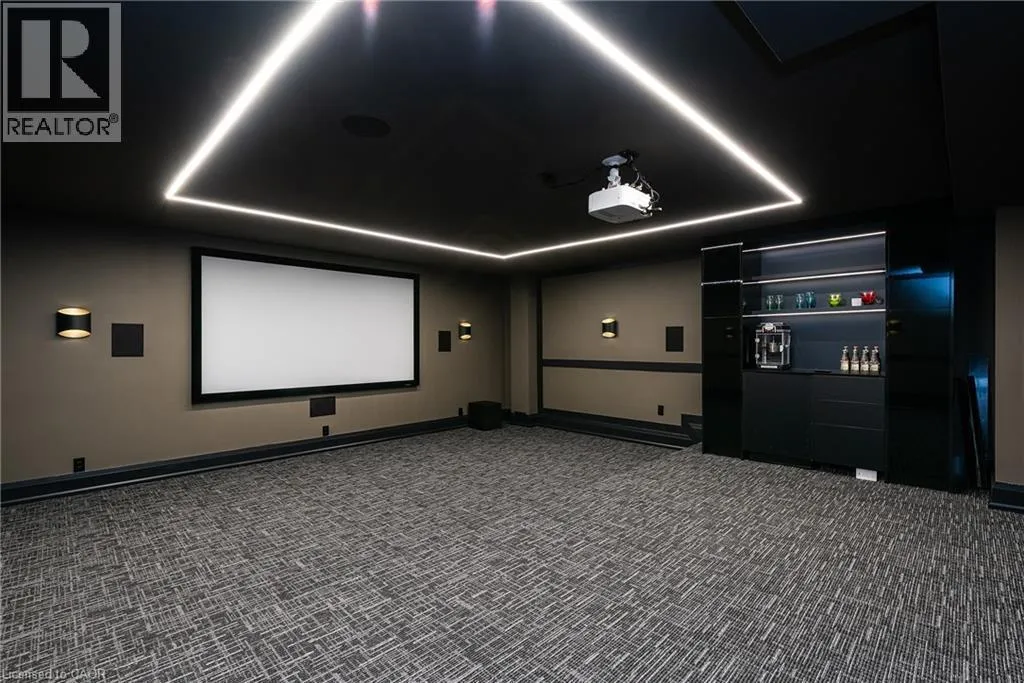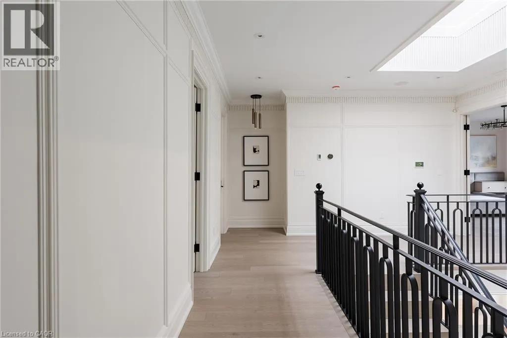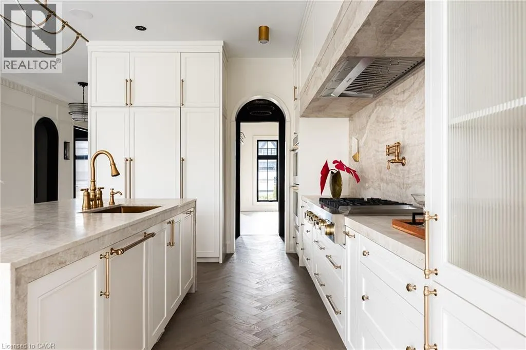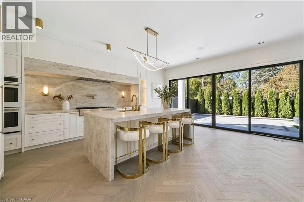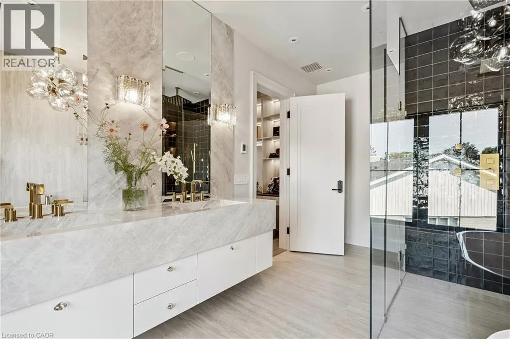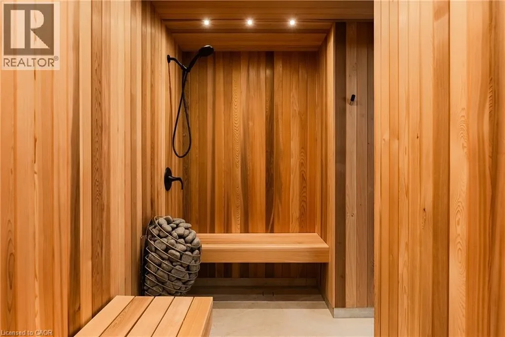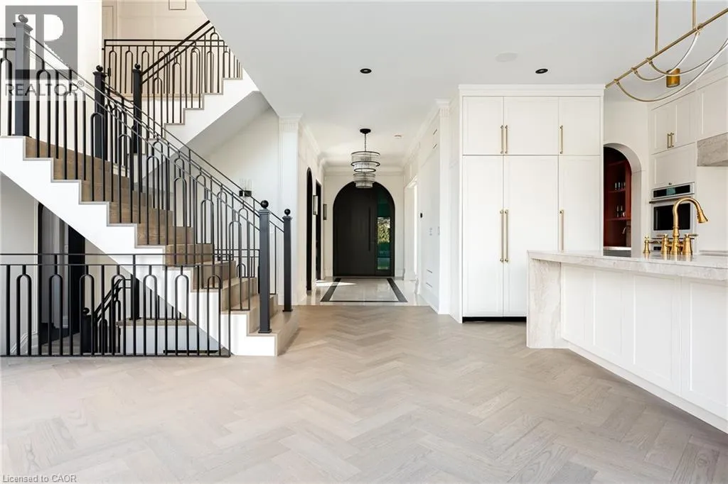 Stunning home upgraded and finished to the highest level, with French Chateauâinspired curb appeal and landscaped grounds. Luxurious finishes and attention to detail throughout. Big, bright windows, custom cabinetry, wall paneling and mouldings, curated stone and tile selections, hardwood herringbone flooring, integrated vents, and a skylight over the central staircase. Interior design by Mia Coroza. Landscaping by Kanawi Landscaping, with top trades from across the GTA. Mirage engineered oak flooring in herringbone. Red oak stairs with wrought iron railings by Deluxe Stairs. A beautifully appointed kitchen features leathered Taj Mahal natural stone quartzite countertops and island. Walk through the servery with walk-in pantry to the dining room with a built-in wine rack. The two-storey great room offers massive windows, a matte porcelain fireplace surround, and a custom ethanol fireplace. A stylish office includes French door entry, built-in wall unit, and sconces. All four bedrooms feature private ensuites. The primary suite includes a fireplace, walk-in closet with custom organizers, and an ensuite with heated floors, designer plumbing fixtures, stand-alone tub, and dual sinks. A laundry room is equipped with LG front-load washer and dryer. Each additional bedroom offers its own design, with closets featuring sensor lighting. Nine-foot ceilings and large window wells enhance the lower level. A bar area features leathered Titanium Gold natural stone quartzite countertops. The home theatre is positioned beneath the garage. Additional spaces include a home gym with custom mats, fifth bedroom, three-piece bath with curbless shower, and rec room. White cedar sauna completes the level. Walk out from the kitchen to a covered porch overlooking grounds inspired by a European garden, with fountains finished in exterior porcelain, landscape lighting, and a cabana with water and gas roughed-in. Aluminum composite fencing and a walk-up from the basement complete this setting. (id:27476)