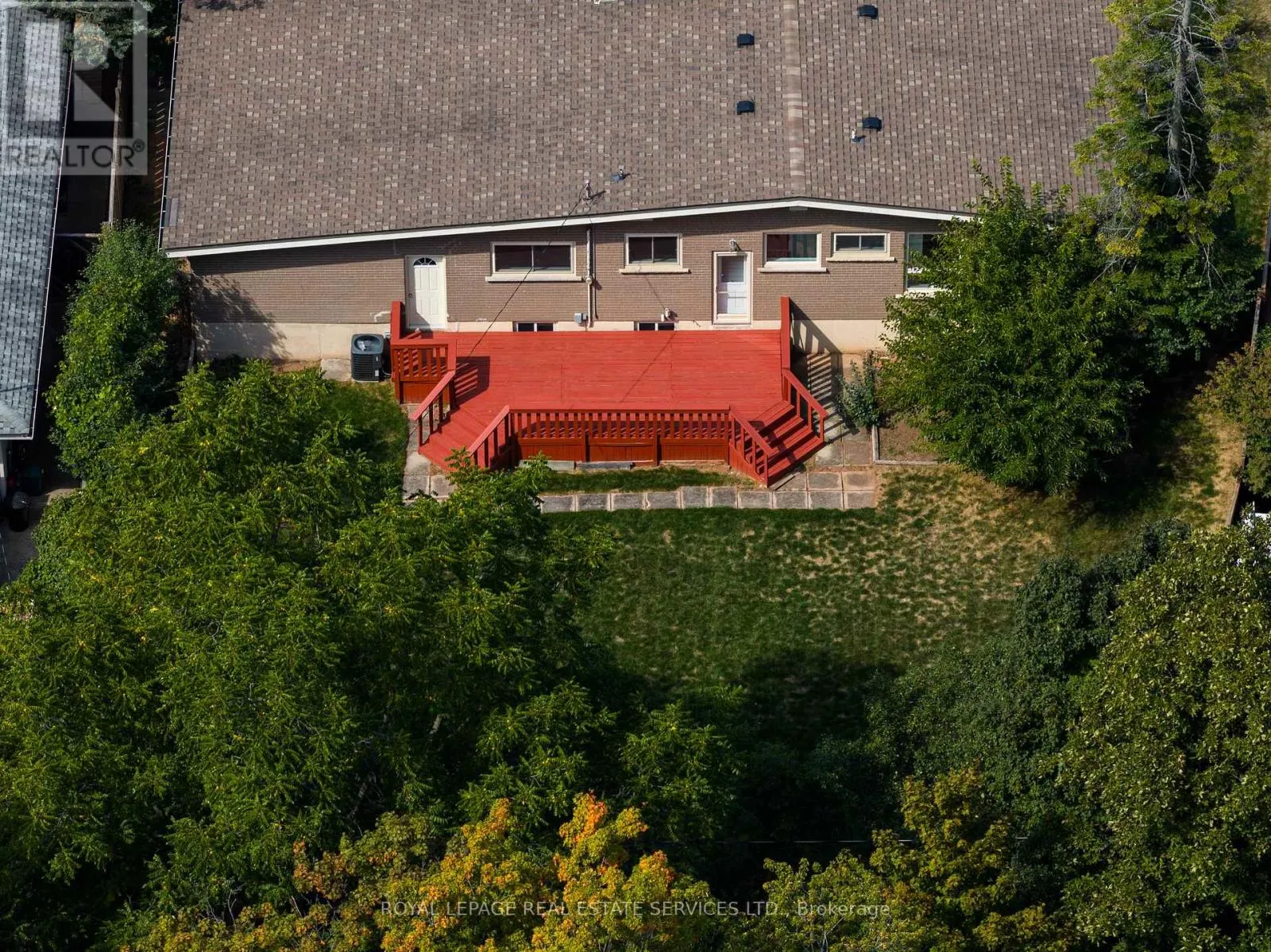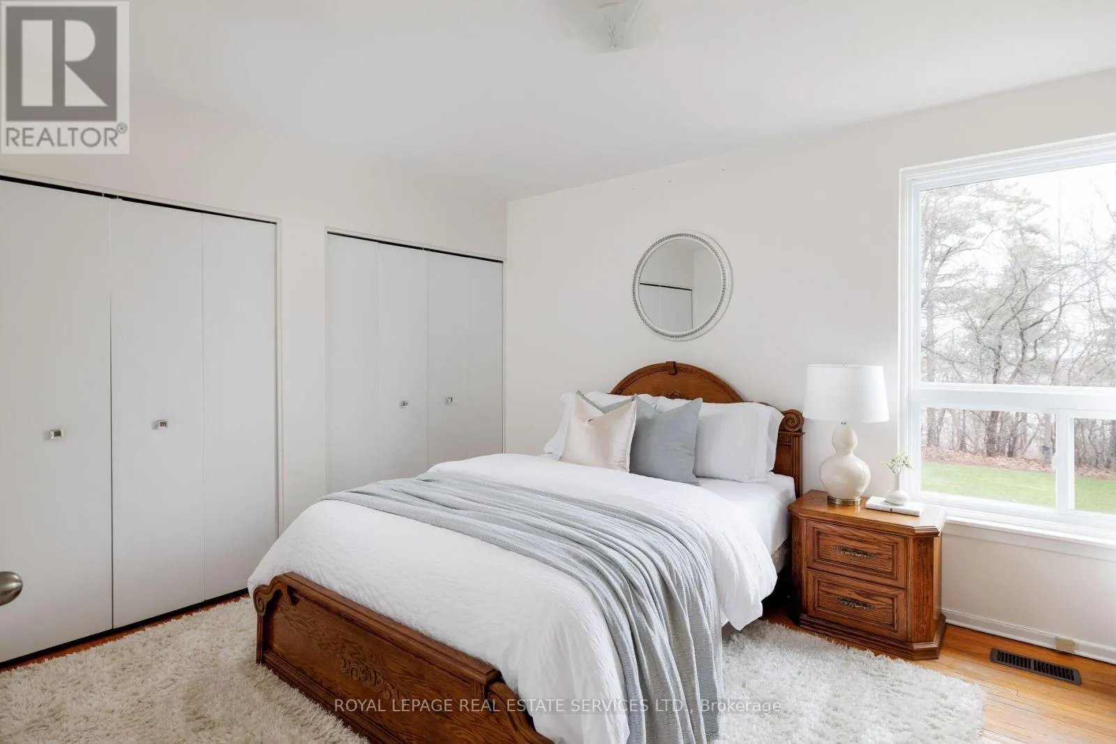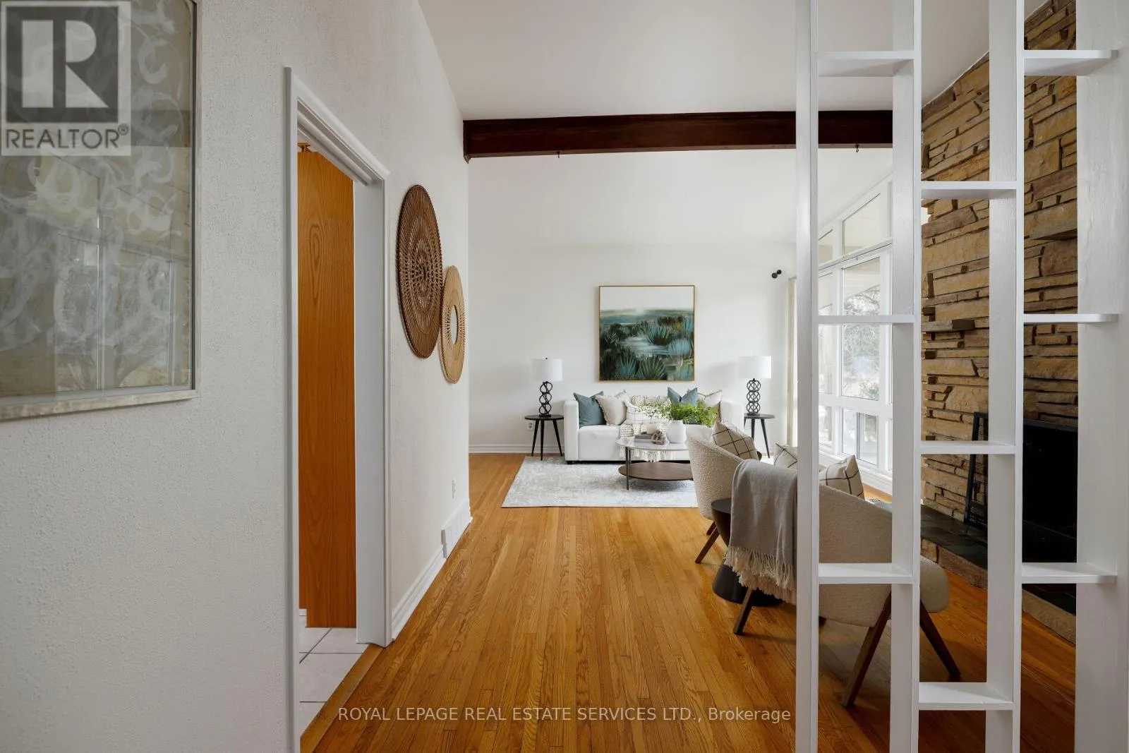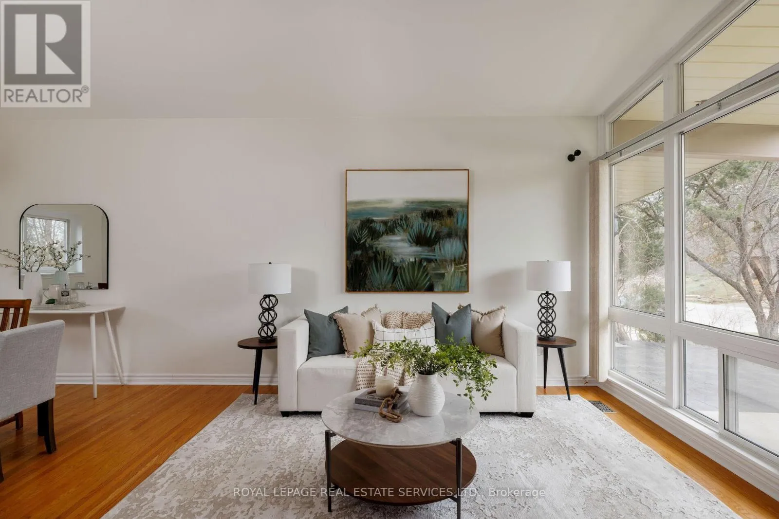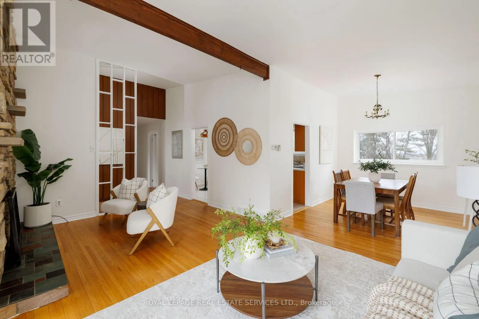 8th Line- Falgarwood Dr (near Elgin) Perfect choice in sought-after Falgarwood! This charming 3-bedroom bungalow is set on a rare premium 93' frontage with a deep, private lot backing onto lush woodlands-offering a peaceful, nature-inspired setting that is increasingly hard to find in Oakville. Located in a mature, established neighbourhood surrounded by scenic parks and trails, this home delivers both tranquility and everyday convenience. Just minutes to Upper Oakville Shopping Centre for groceries, dining, and daily essentials, close to Oakville Place Mall, and with quick access to the QEW/403 and Oakville GO Station, the location is ideal for commuters and families alike.Beautifully maintained with inviting curb appeal, the property features an oversized driveway accommodating up to 6 vehicles, plus a double car garage. Mature trees create a private backyard retreat, where a spacious deck offers the perfect setting for outdoor relaxation or entertaining. Inside, the home showcases unique architectural details including cathedral ceilings, two wood-burning fireplaces, and hardwood flooring with updated baseboards throughout the main level.The L-shaped living and dining area is ideal for both formal entertaining and relaxed family living. The bright kitchen offers ample cabinetry, stainless steel appliances, and a cozy breakfast area with walkout to the freshly painted deck and serene backyard. The main floor includes three well-proportioned bedrooms, all with hardwood flooring, a 4-piece bathroom, and a private 2-piece ensuite in the primary bedroom.The finished lower level expands the living space with a freshly painted, oversized recreation room complete with a built-in bar-perfect for hosting gatherings or creating a comfortable family retreat. A wonderful opportunity to own a solid bungalow on a premium lot in one of Oakville's most established and desirable communities. (id:27476)