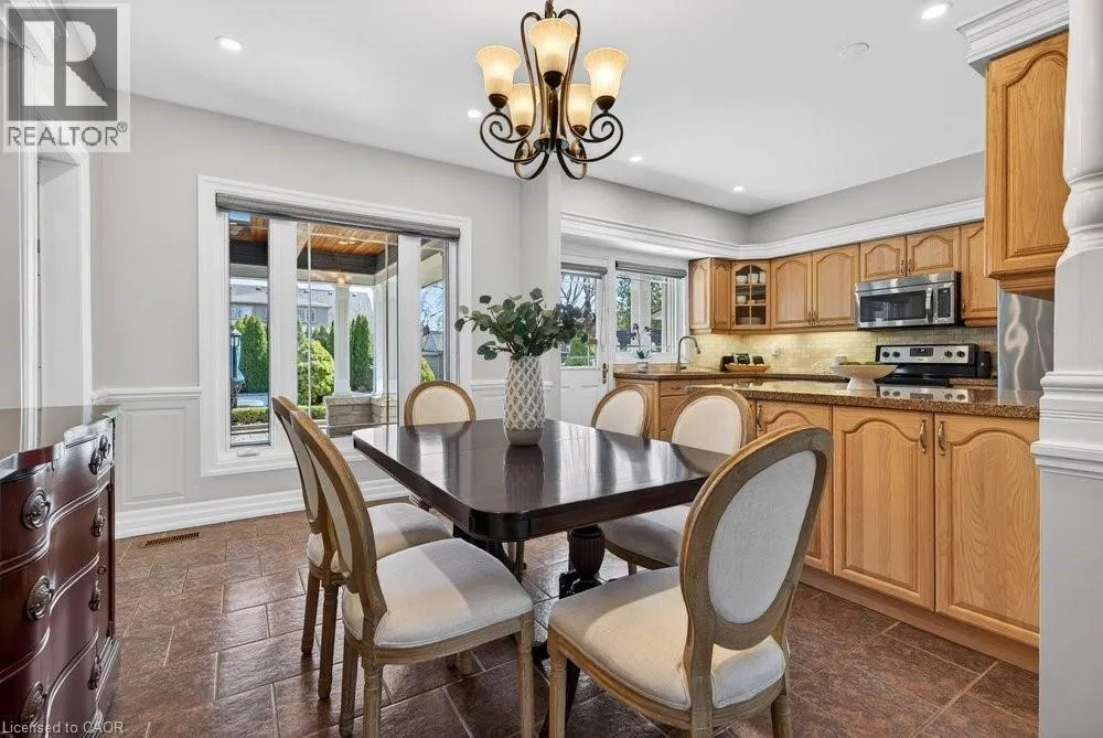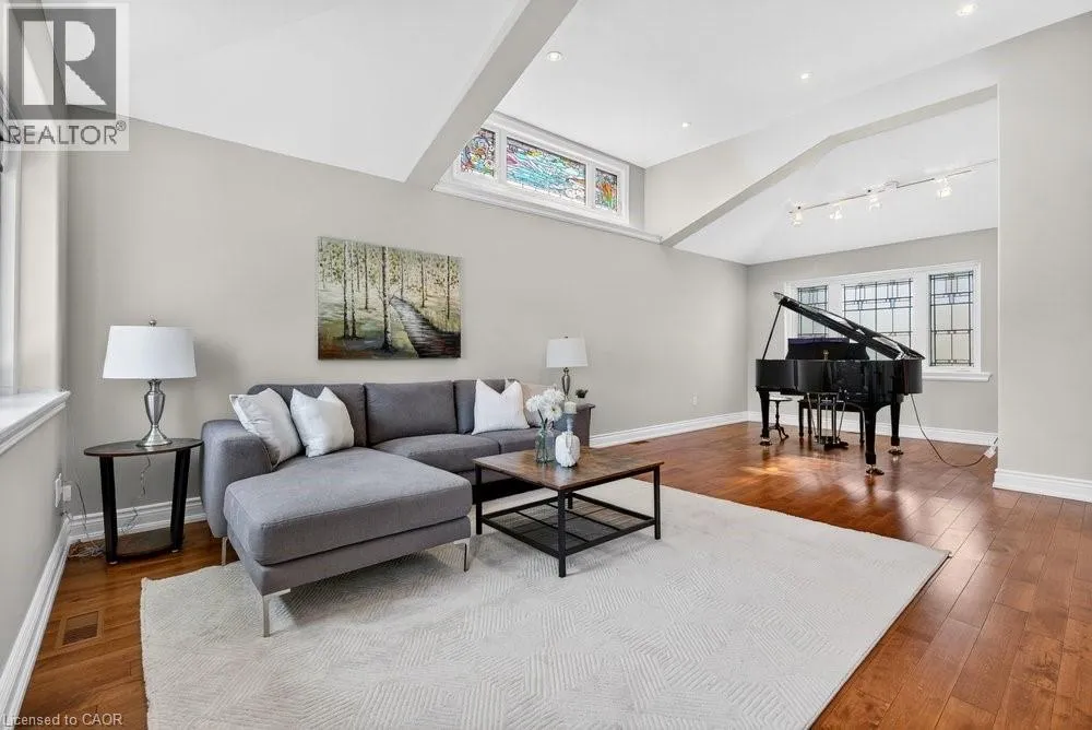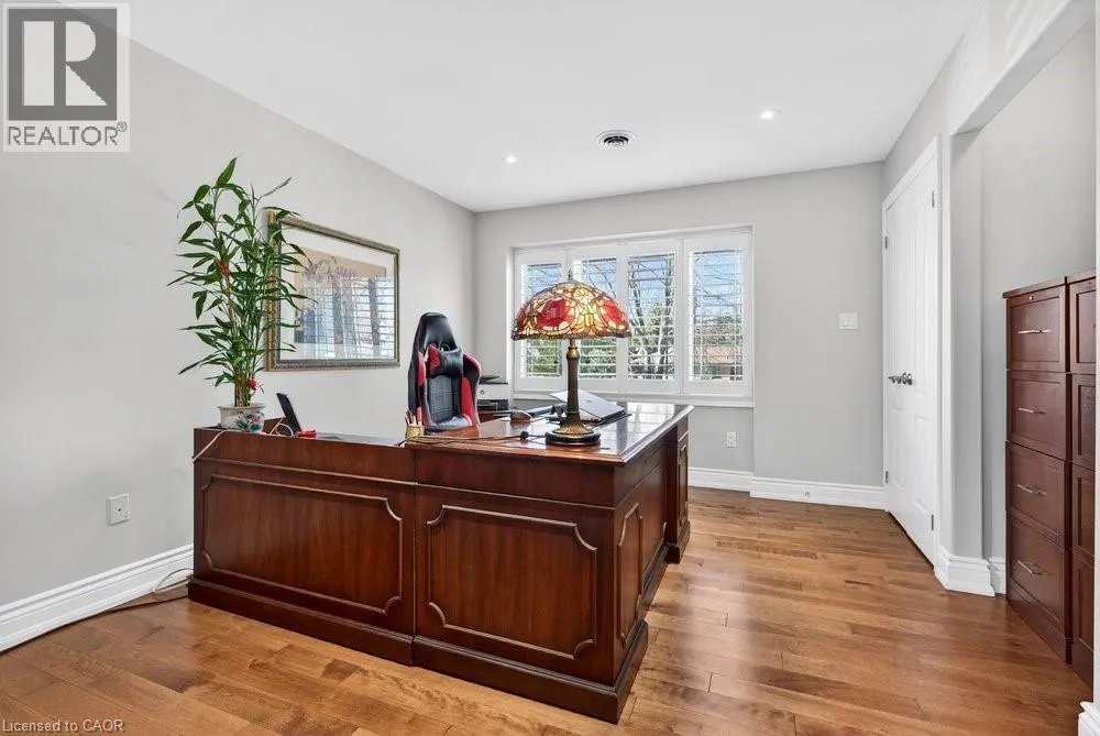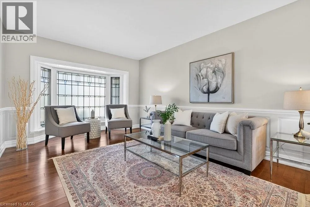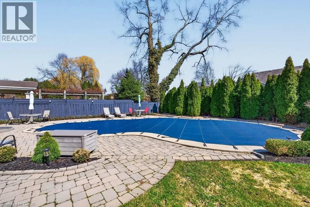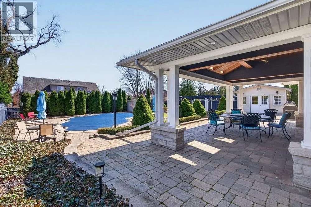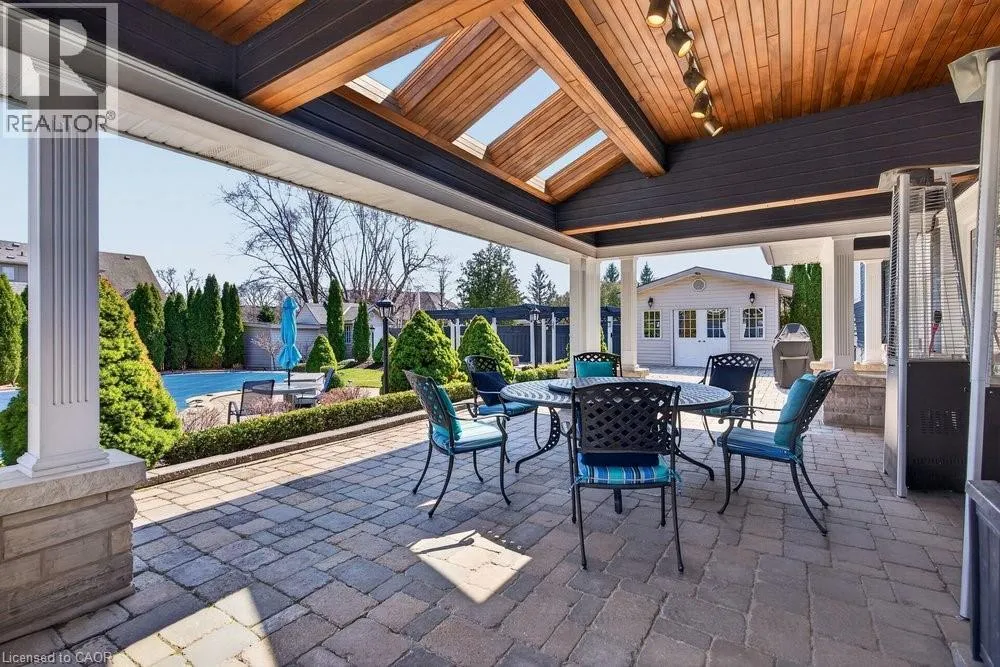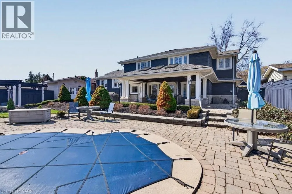 This meticulously renovated, 5-bedroom home, seamlessly blends architectural elegance with a resort-like backyard sanctuary. Sitting on over 1/4 acre (75.71ft x 150.27ft), the private, mature backyard is a masterclass in landscape design, framed by a lush triple-layer of emerald cedars that ensures total seclusion for the salt-water pool and its sophisticated lounging terrace. A striking vaulted covered patio with an intricate wood-inlay ceiling plus 3 skylights, offers a luxurious element and an elevated vantage point over the manicured grounds and pool. Inside, the layout is designed for both effortless entertaining and multi-generational living. The 2-storey home includes a unique side-split level with an open great room/family room that boasts an 11'7 ceiling height, and a conveniently-placed laundry room that serves both the main and upper quarters. On the main level, the gourmet kitchen, living and dining areas, transition openly with windows overlooking the stunning backyard and a walk-out to patio. There is an additional, versatile 'wing' on the main floor that features the fifth bedroom, a pristine 3-pc bath, a separate entry, plus the inside entry to the two-car garage - all accessible without stairs. The second level features four spacious, sunny bedrooms, including a separate primary suite distinguished by a stately coffered ceiling and 5-pc ensuite bathroom, plus there is a 4-pc bathroom on this level. The front windows in the foyer, living room, and family room have been beautifully enhanced with custom-made stained-glass windows for ultimate privacy and distinction. The lower level features a mirror-panelled exercise room/recreation room with a rubber-floor overlay (the equipment is negotiable) with windows on both ends of the room. Rich solid-oak flooring throughout the above-grade levels, and the whole home is carpet-free. Come see this very special home and property in a quiet, friendly neighbourhood of south-west Oakville. (id:27476)