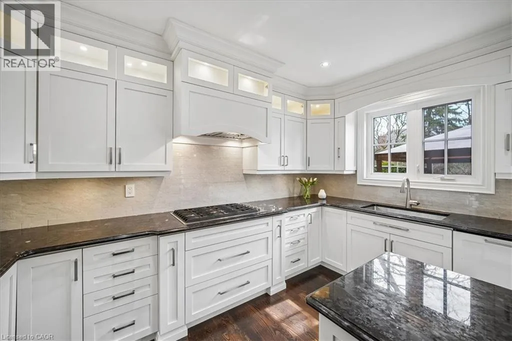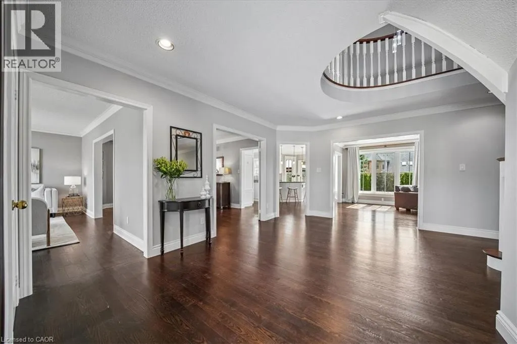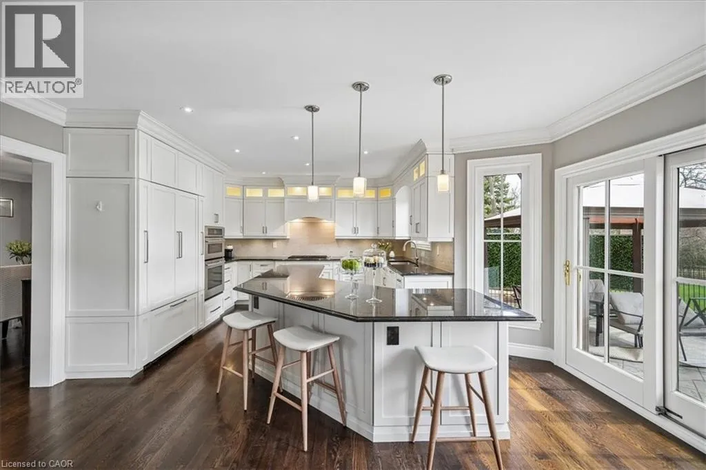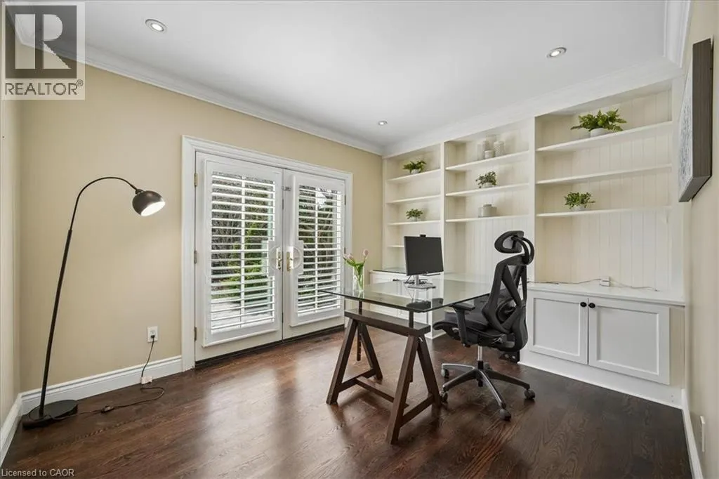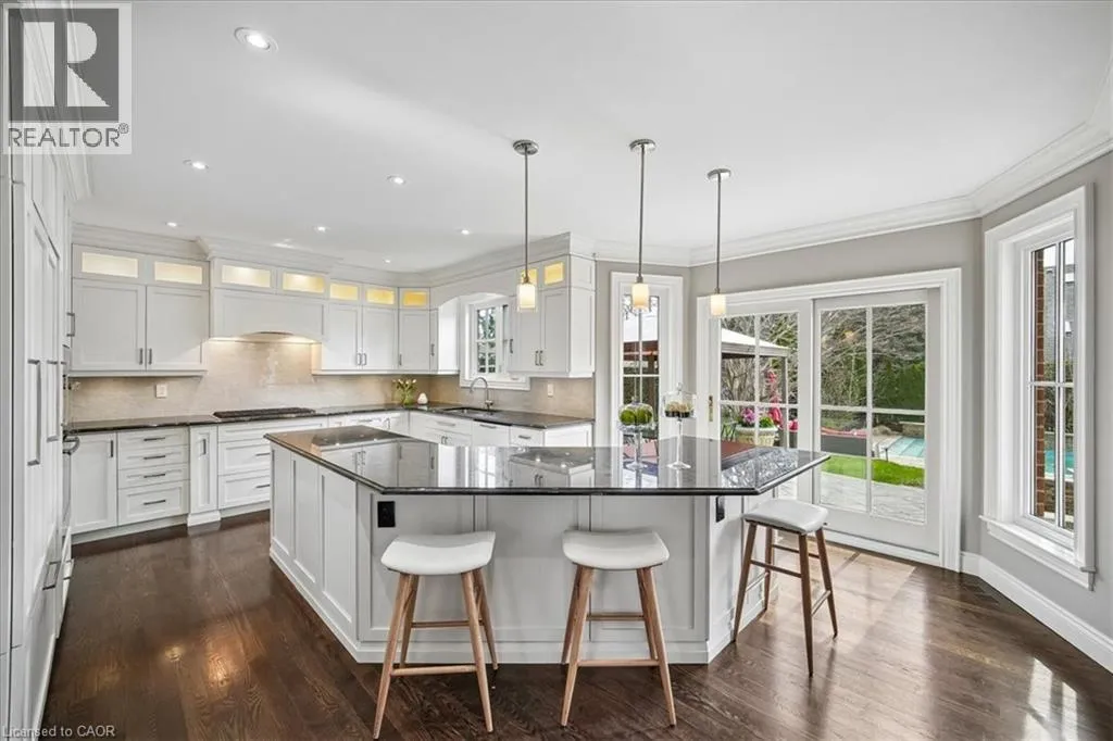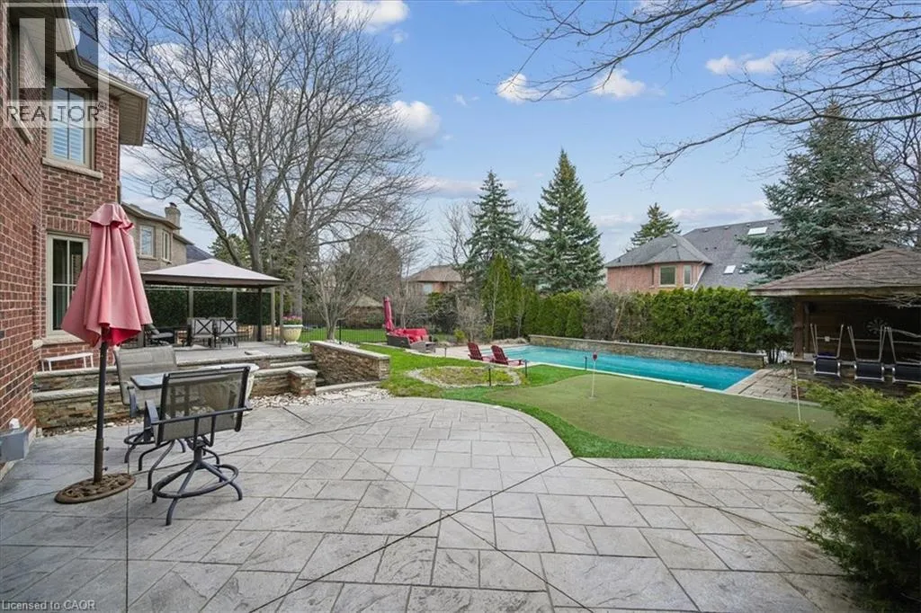Dorval to Fairway Hills Blvd to The Links Dr Welcome to 1494 The Links in the Fairway Hills, Glen Abbey Golf Course community. This 4 plus 1-bedroom executive home has been renovated with high end custom finishes throughout. Fabulous kitchen with custom cabinets and center island with built-in Jenn Air appliances including French door refrigerator, double wall oven/convection microwave, 6 burner gas cooktop, Miele Dishwasher, and beverage fridge. Granite counters and linear mosaic marble backsplash. Kitchen is open to family room with fireplace - both overlooking the backyard. Private office with access to backyard and custom white built-in cabinets and glass desk. Updated windows, doors and carriage style garage doors. Finished onsite oak hardwood through the main floor. Spacious living room and separate dining room. Second floor has large primary bedroom with decadent renovated spa like 6-piece ensuite bathroom. Three other spacious bedrooms and fully renovated main bathroom. Both bathrooms have heated floors. Hardwood throughout second floor. Fully finished lower level has walk out/up to backyard, entertainment area, games area, fifth bedroom and 3-piece bathroom with heated floors, custom wine cellar and kitchenette. Perfect for nanny or in-law suite. Tons of storage! Backyard with heated salt-water pool, cabana, putting green, and pergola. Professional landscaping and hardscaping in front and rear yards. Perfect move in ready family home. (id:27476)