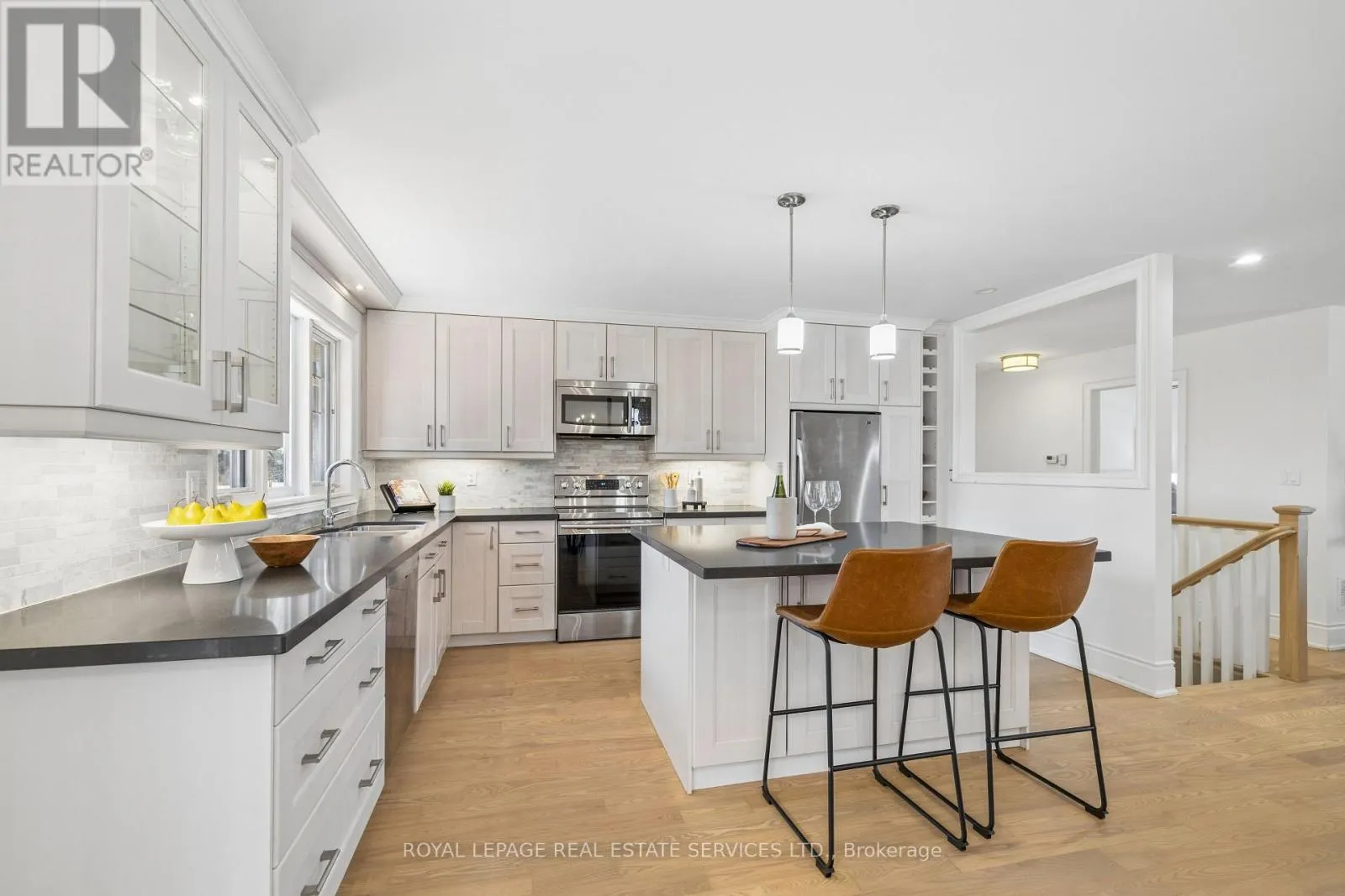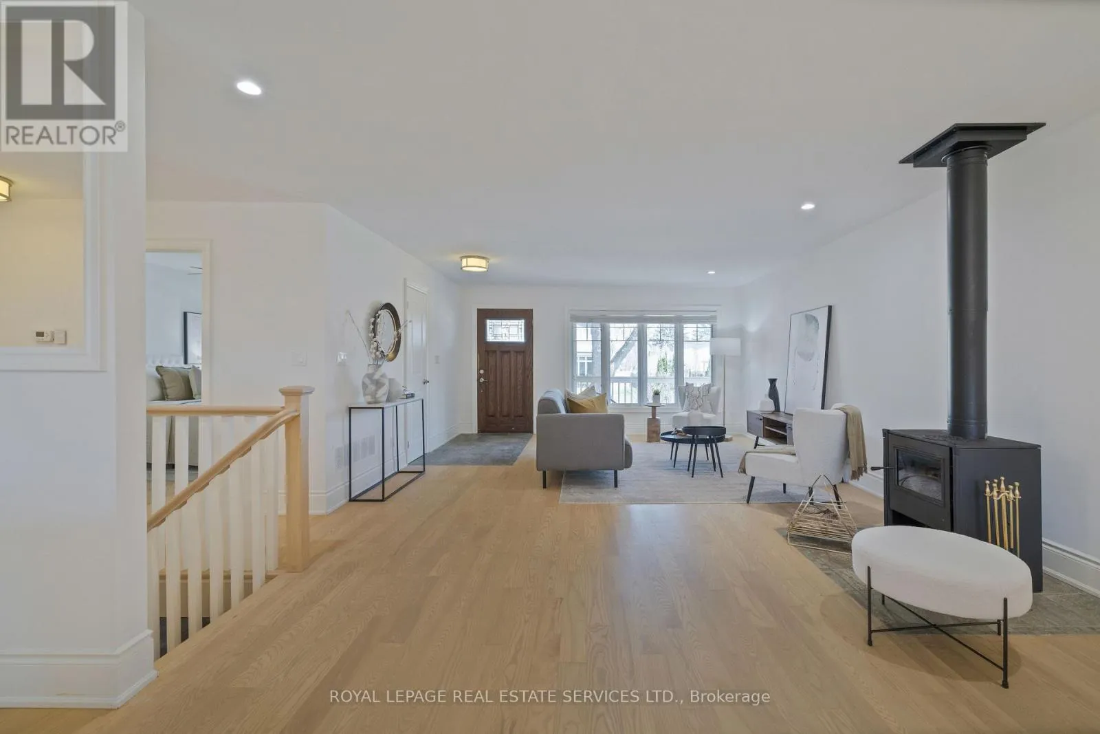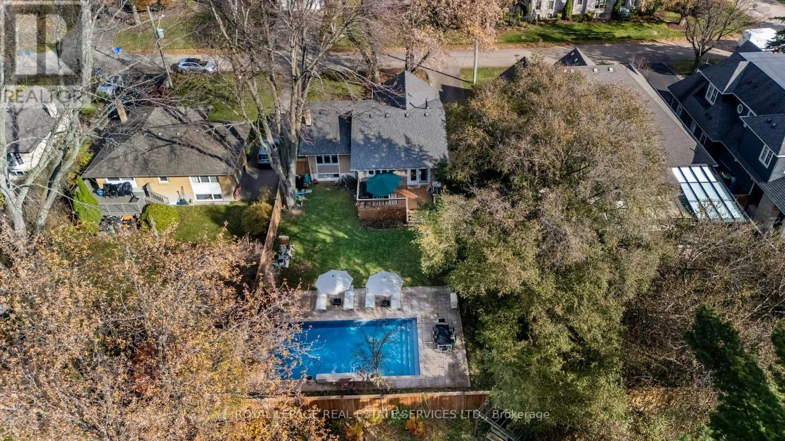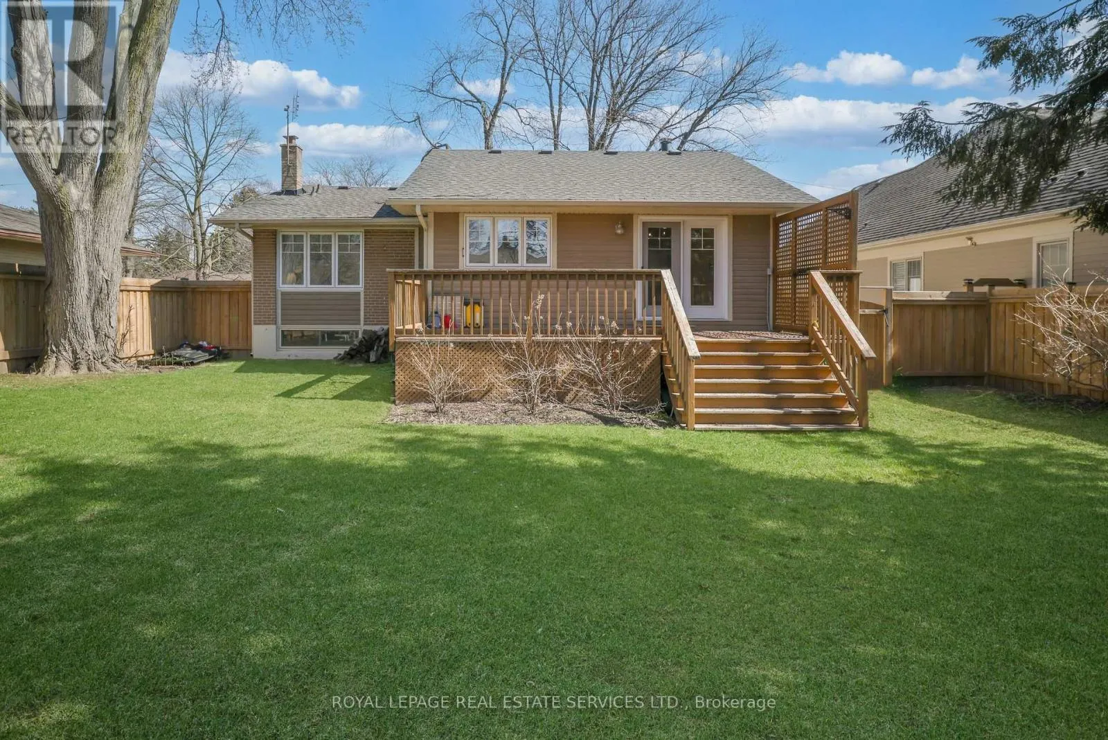 Rebecca St & Fourth Line Nestled on a quiet street among multi-million dollar homes in a mature West Oakville neighborhood, this beautifully updated raised bungalow is an exceptional find for downsizers and families alike. Offering over 2,200 square feet of freshly painted living space, the home features a highly functional 2+2 bedroom, 2-bathroom layout. Newly redone hardwood floors flow effortlessly throughout the bright, open-concept main level, where a cozy living room anchored by a charming wood-burning stove seamlessly connects to a stunning modern kitchen. This culinary space is perfectly appointed with stainless steel appliances, crisp white shaker cabinetry, and a large quartz center island. Downstairs, the finished lower level significantly expands your living space, boasting a spacious recreation room, a versatile den, a convenient three-piece bathroom, and two additional bedrooms accented by French doors. Step outside to discover your own private, fully-fenced backyard oasis shaded by mature trees. An elevated wooden deck and green lawn lead down to an expansive Banas stone patio that beautifully frames a premium, three-year-old saltwater pool. Designed for ultimate outdoor entertaining, this resort-style retreat is complete with tranquil water feature, an automatic cover, and a brand-new privacy fence. Perfectly situated just minutes from the boutique shops and fine dining of downtown Oakville, this home offers an unparalleled lifestyle near top-rated schools, including Pinegrove Public School, St. Thomas Aquinas, and Appleby College. Some photos have been virtually staged. (id:27476)