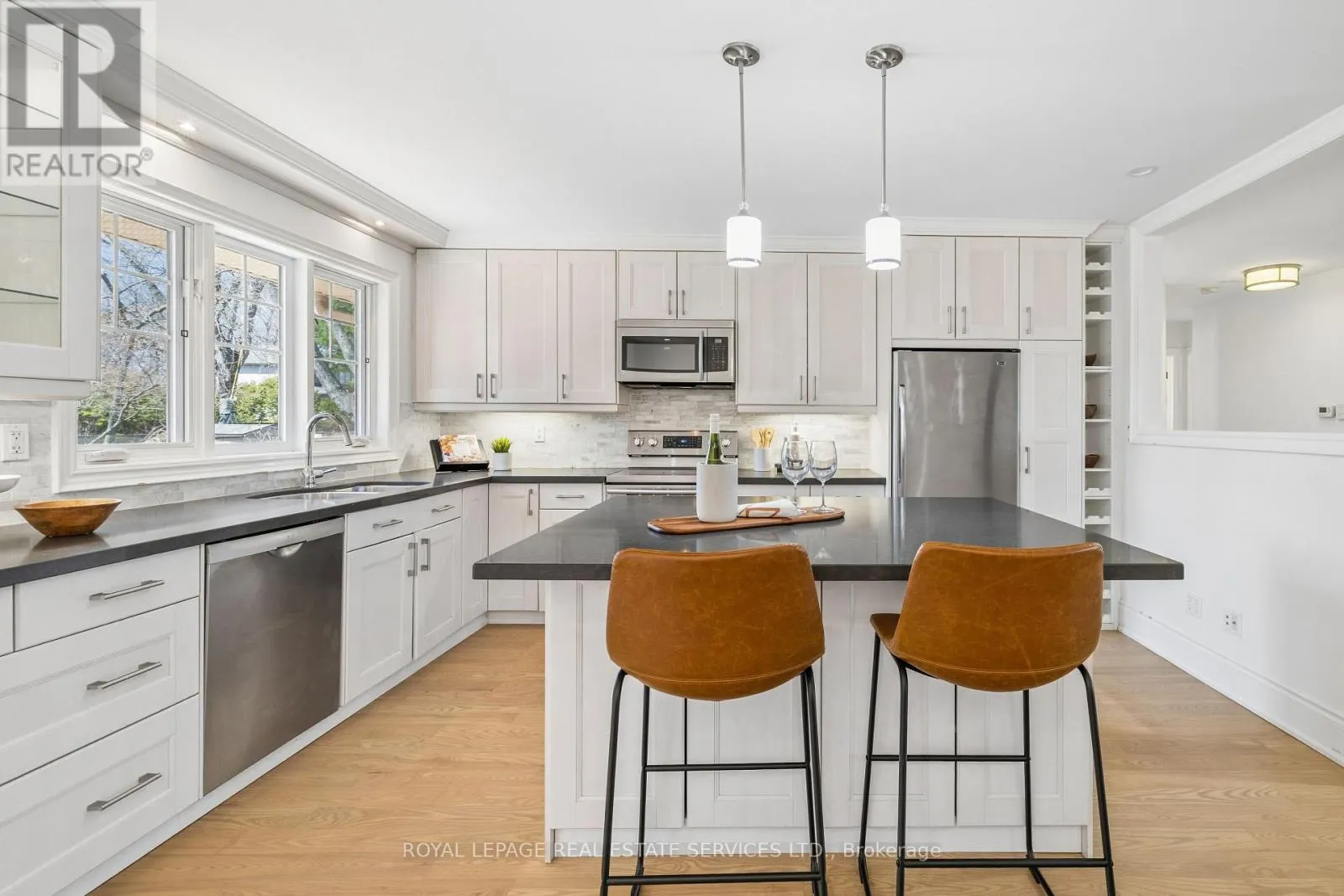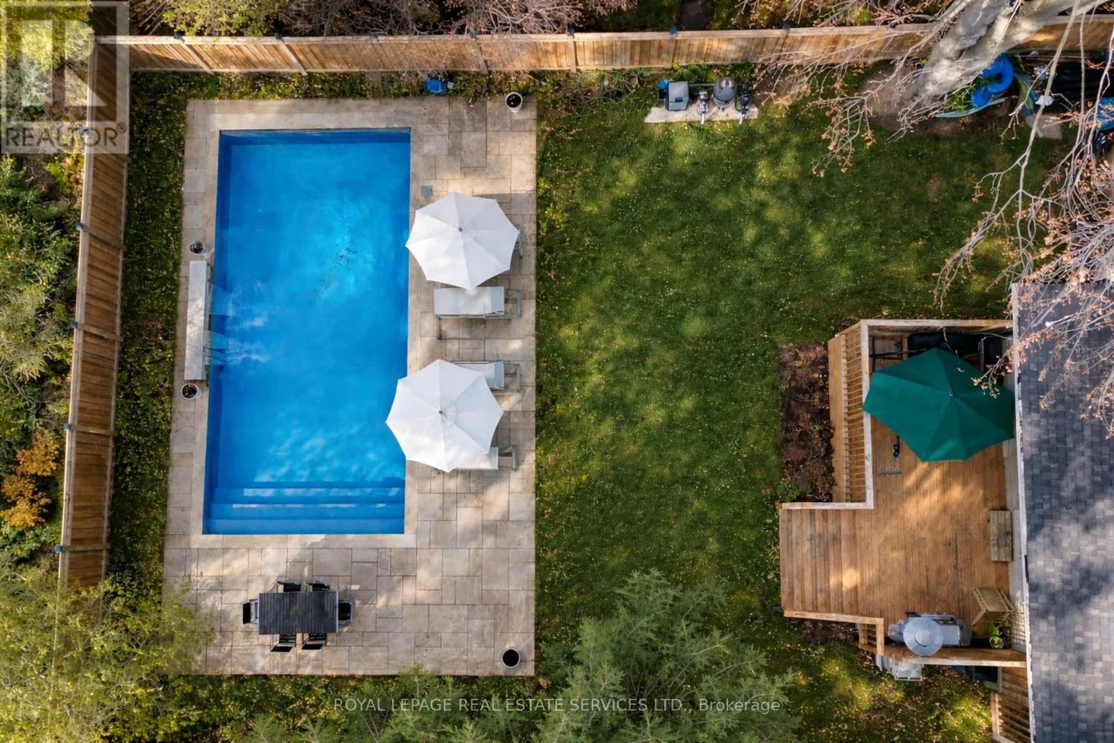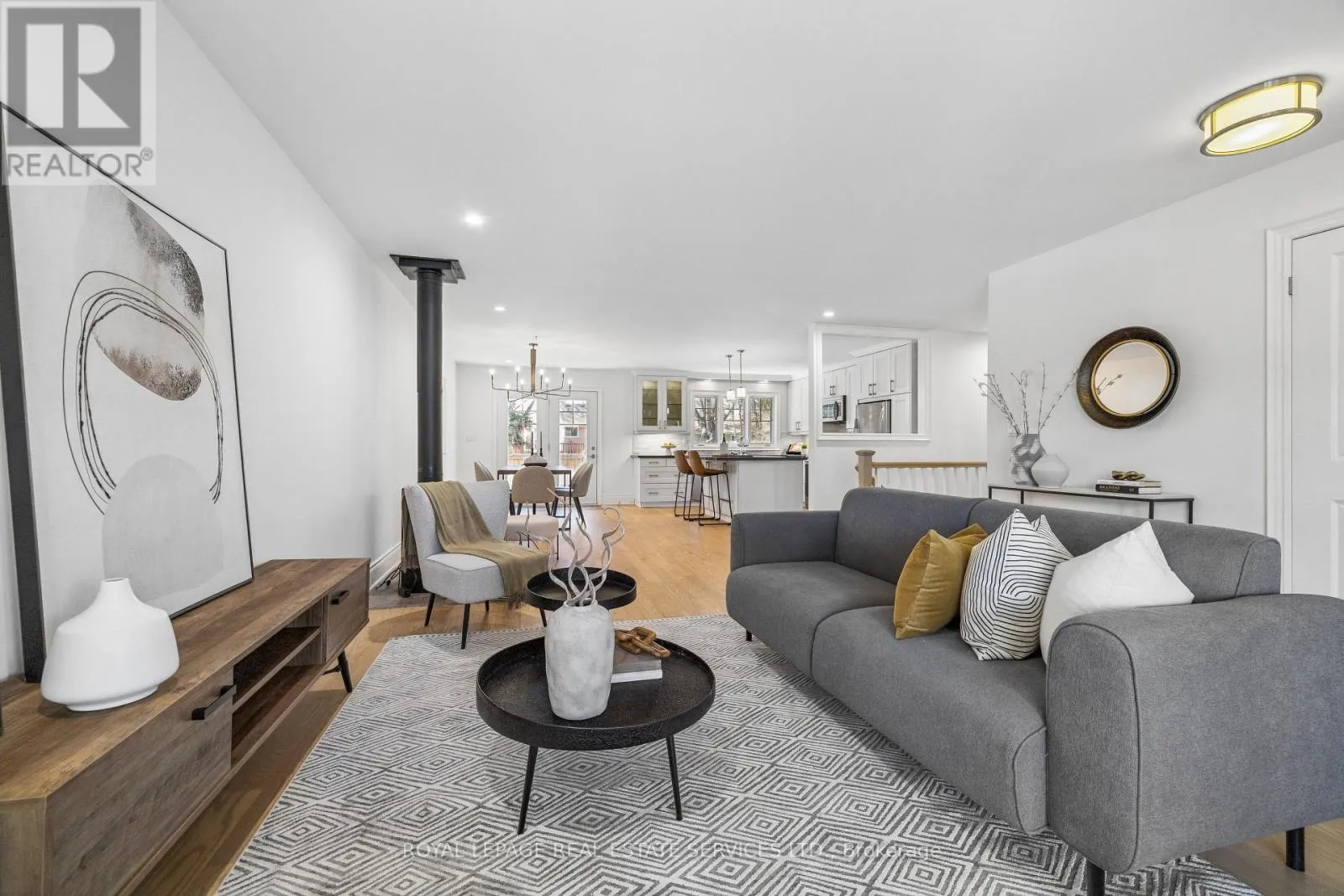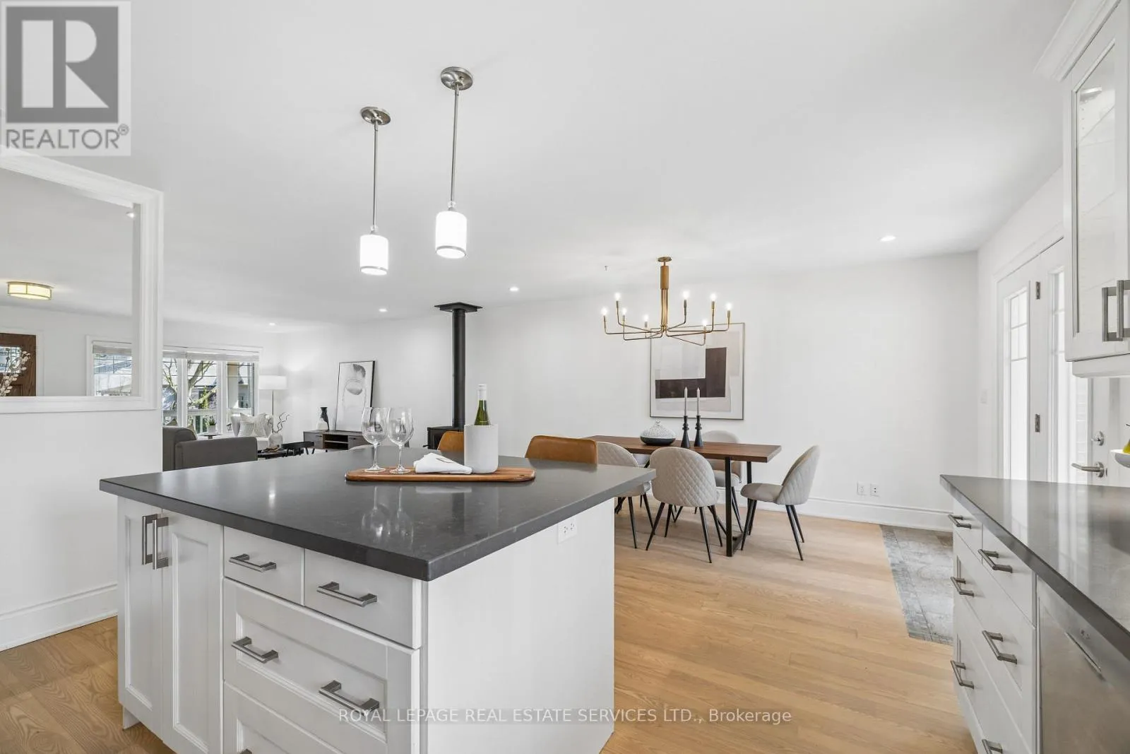 Rebecca St & Fourth Line Nestled on a quiet street among multi-million dollar homes in a mature West Oakville neighborhood, this beautifully updated raised bungalow is an exceptional find for downsizers and families alike. Offering over 2,200 square feet of freshly painted living space, the home features a highly functional 2+2 bedroom, 2-bathroom layout. Newly redone hardwood floors flow effortlessly throughout the bright, open-concept main level, where a cozy living room anchored by a charming wood-burning stove seamlessly connects to a stunning modern kitchen. This culinary space is perfectly appointed with stainless steel appliances, crisp white shaker cabinetry, and a large quartz center island. Downstairs, the finished lower level significantly expands your living space, boasting a spacious recreation room, a versatile den, a convenient three-piece bathroom, and two additional bedrooms accented by French doors. Step outside to discover your own private, fully-fenced backyard oasis shaded by mature trees. An elevated wooden deck and green lawn lead down to an expansive Banas stone patio that beautifully frames a premium, three-year-old saltwater pool. Designed for ultimate outdoor entertaining, this resort-style retreat is complete with tranquil water feature, an automatic cover, and a brand-new privacy fence. Perfectly situated just minutes from the boutique shops and fine dining of downtown Oakville, this home offers an unparalleled lifestyle near top-rated schools, including Pinegrove Public School, St. Thomas Aquinas, and Appleby College. Some photos have been virtually staged. (id:27476)
