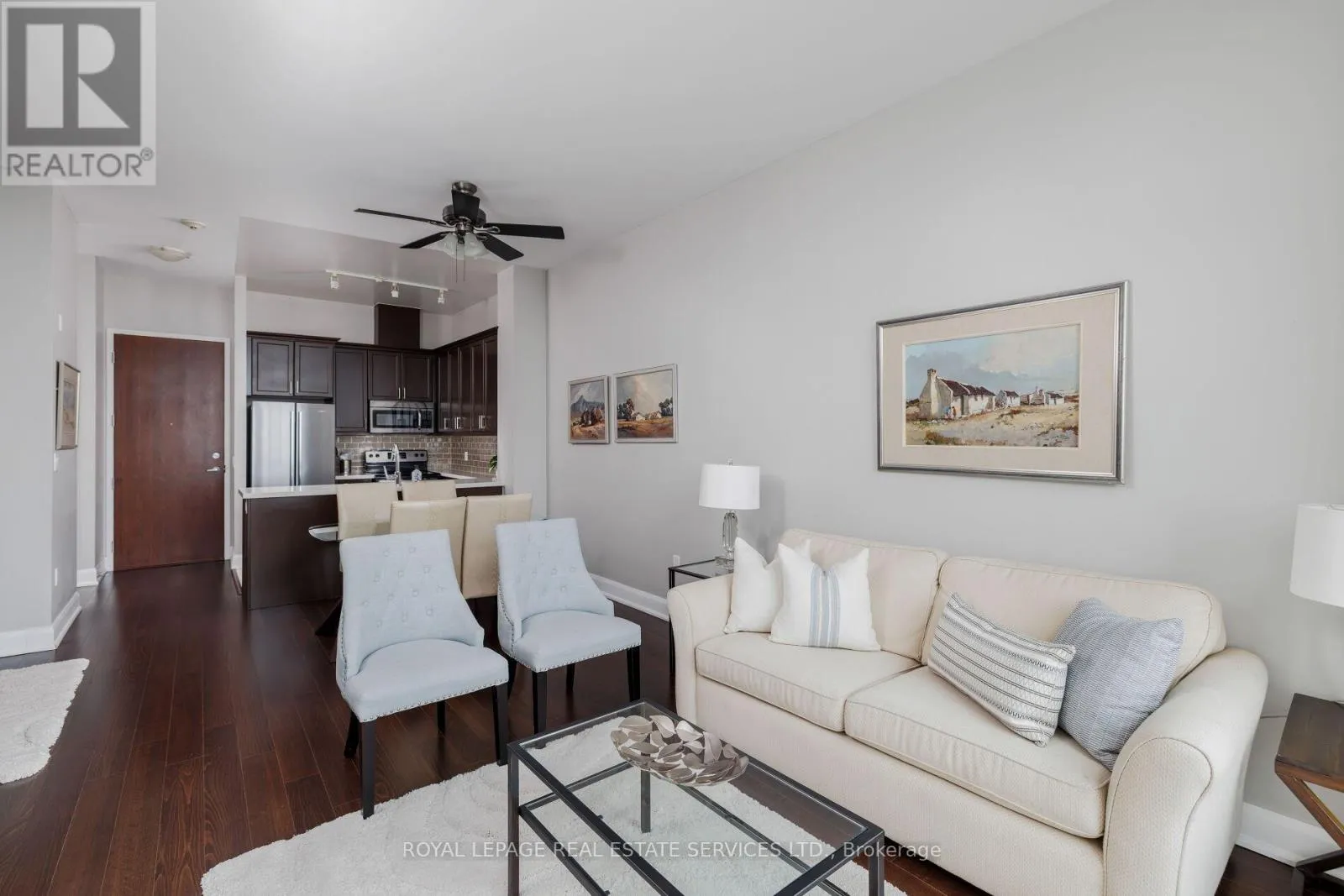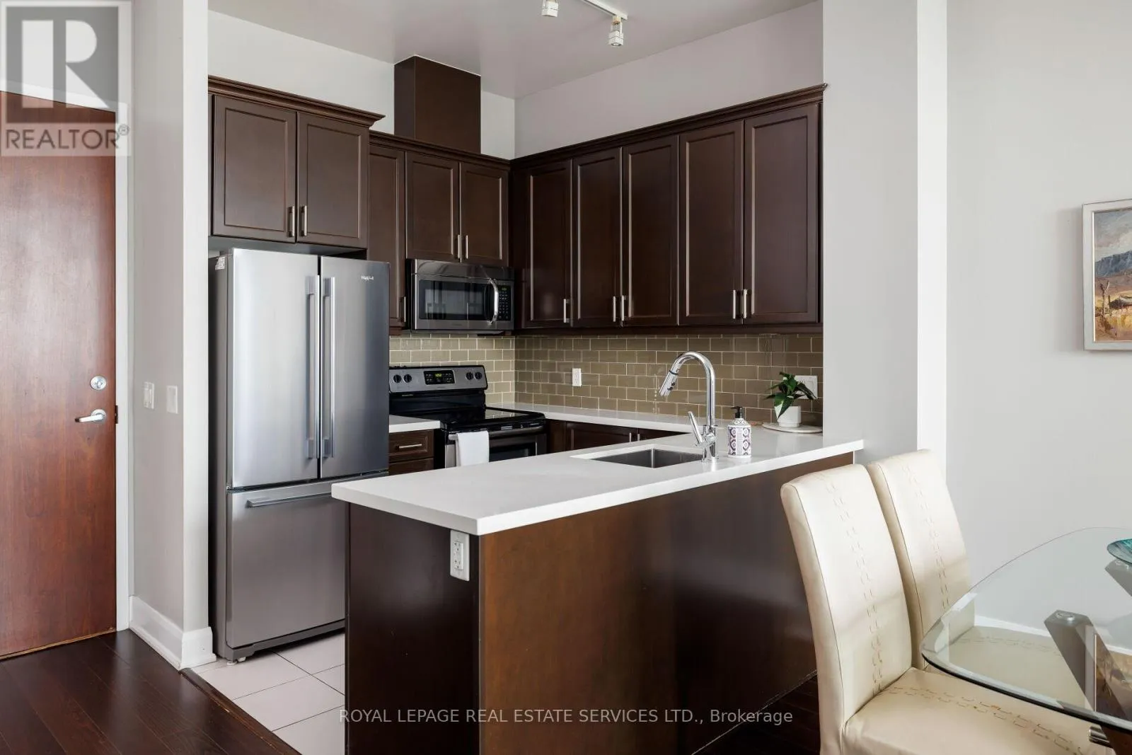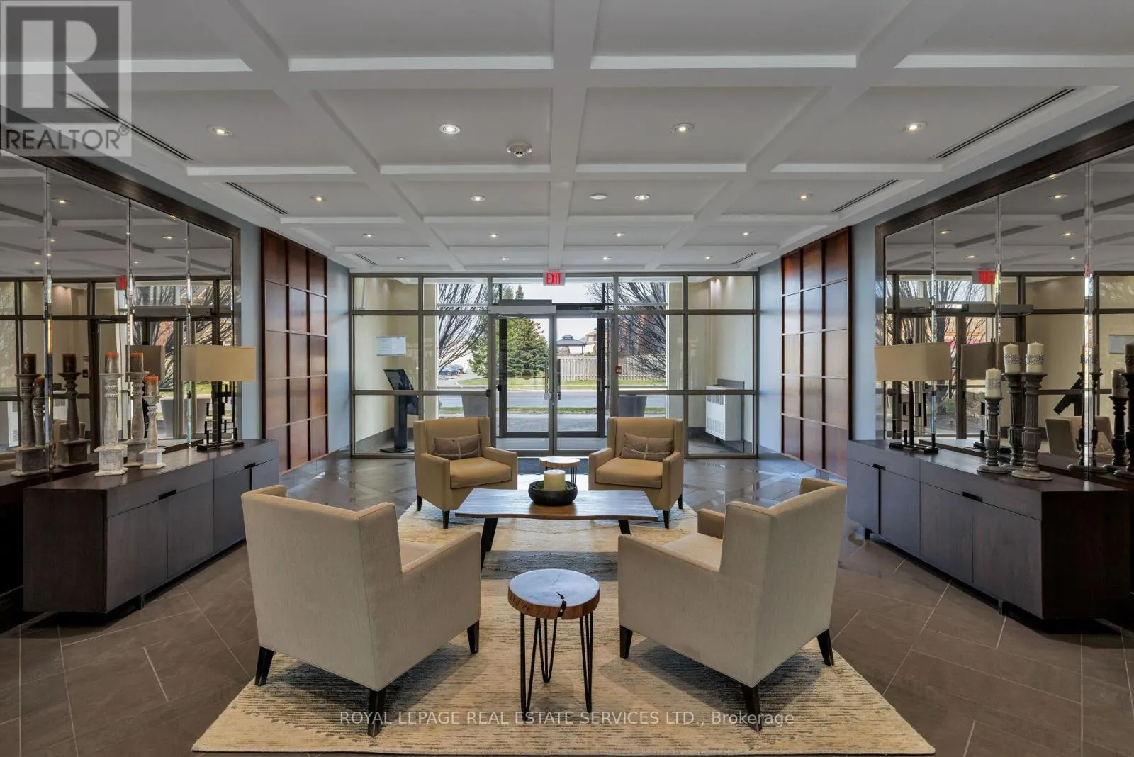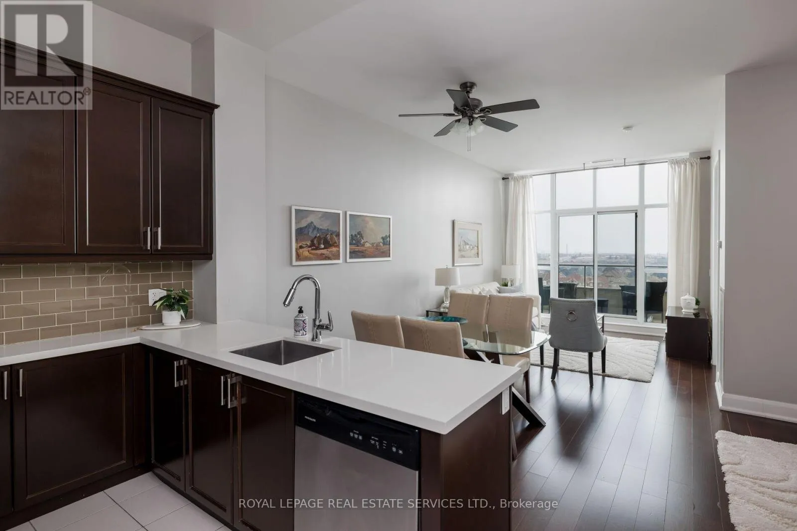 Cross Streets: Dundas & Prince Michael. ** Directions: Dundas - Prince Michael. Embrace stylish, contemporary living at Emporium Condos in sought-after Joshua Creek, ideally located within walking distance of restaurants, Starbucks, Shoppers Drug Mart, TD Bank and a medical centre, with Uptown Core and Oakville Trafalgar Memorial Hospital just minutes away. Commuters enjoy effortless access to transit, major highways and the GO Train. This beautifully updated 1-bedroom plus den suite on the 7th floor features soaring 10-ft ceilings, wide-plank flooring and large windows that flood the space with natural light. The open-concept living and dining area features a walkout to a private balcony, and the stylish kitchen offers dark, extended-height cabinetry, stone counters, a subway-tile backsplash, a peninsula/island and stainless-steel appliances. The spacious primary bedroom includes a huge window and mirrored closet doors, and the spa-inspired 3-piece bathroom features an oversized glass shower. A versatile den, in-suite laundry, underground parking and locker add convenience. The building impresses with landscaped grounds, a boutique-style lobby with fireplace and premium amenities including an indoor pool, whirlpool, fitness centre, theatre room and party space-delivering luxury, comfort and a low-maintenance lifestyle in a prime Oakville location. (id:27476)