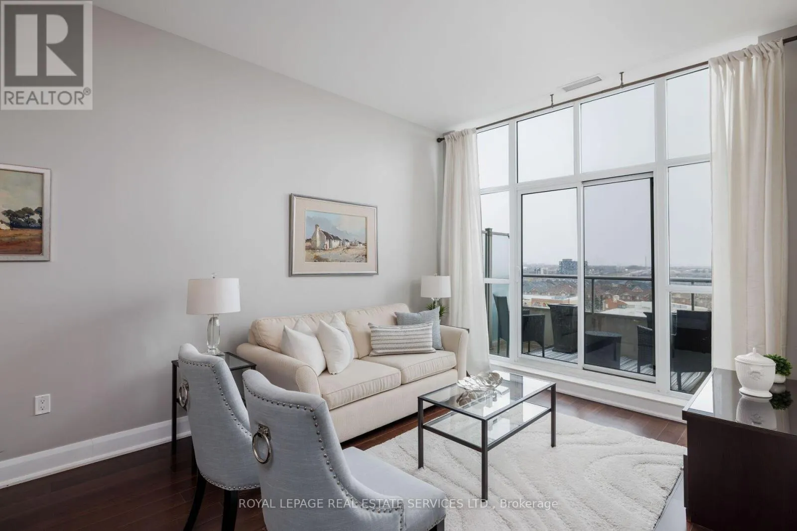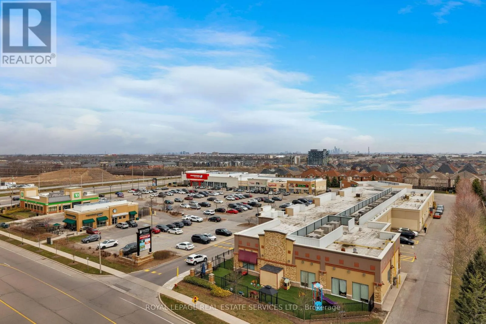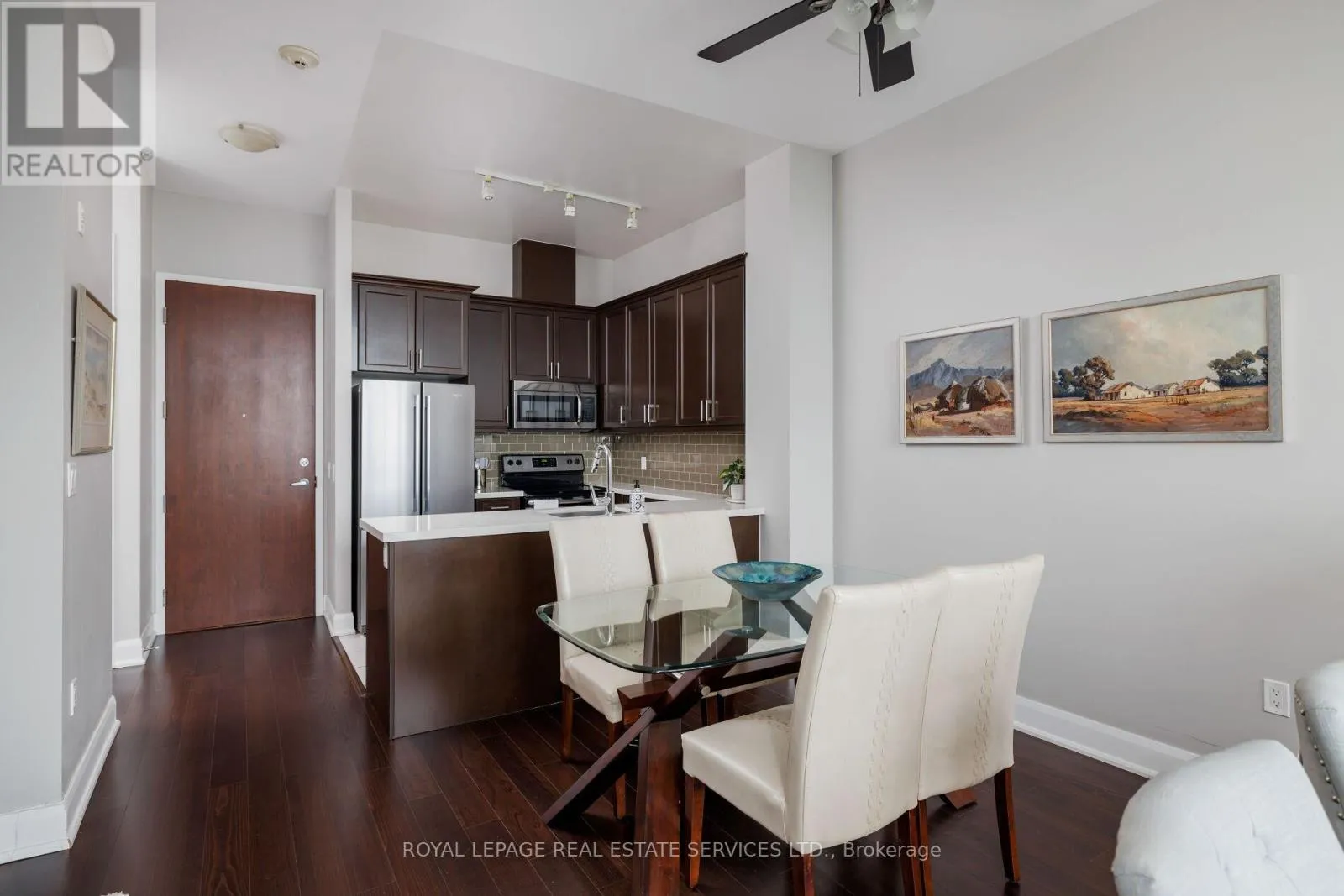 Cross Streets: Dundas & Prince Michael. ** Directions: Dundas - Prince Michael. Embrace stylish, contemporary living at Emporium Condos in sought-after Joshua Creek, ideally located within walking distance of restaurants, Starbucks, Shoppers Drug Mart, TD Bank and a medical centre, with Uptown Core and Oakville Trafalgar Memorial Hospital just minutes away. Commuters enjoy effortless access to transit, major highways and the GO Train. This beautifully updated 1-bedroom plus den suite on the 7th floor features soaring 10-ft ceilings, wide-plank flooring and large windows that flood the space with natural light. The open-concept living and dining area features a walkout to a private balcony, and the stylish kitchen offers dark, extended-height cabinetry, stone counters, a subway-tile backsplash, a peninsula/island and stainless-steel appliances. The spacious primary bedroom includes a huge window and mirrored closet doors, and the spa-inspired 3-piece bathroom features an oversized glass shower. A versatile den, in-suite laundry, underground parking and locker add convenience. The building impresses with landscaped grounds, a boutique-style lobby with fireplace and premium amenities including an indoor pool, whirlpool, fitness centre, theatre room and party space-delivering luxury, comfort and a low-maintenance lifestyle in a prime Oakville location. (id:27476)