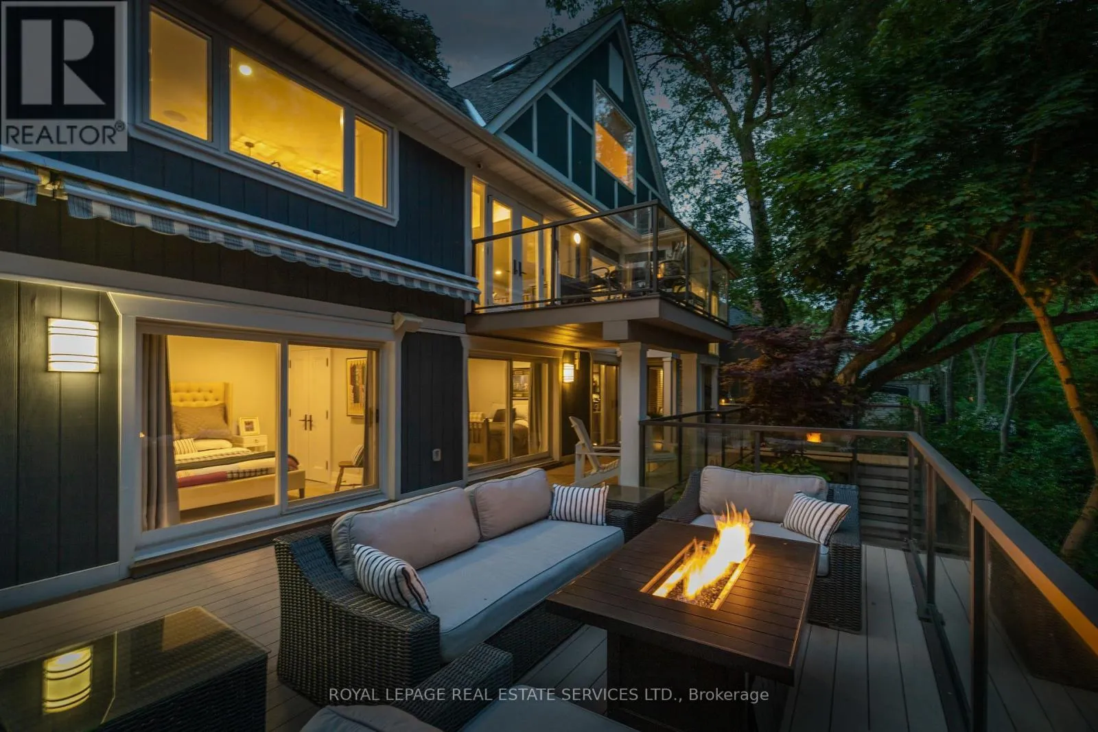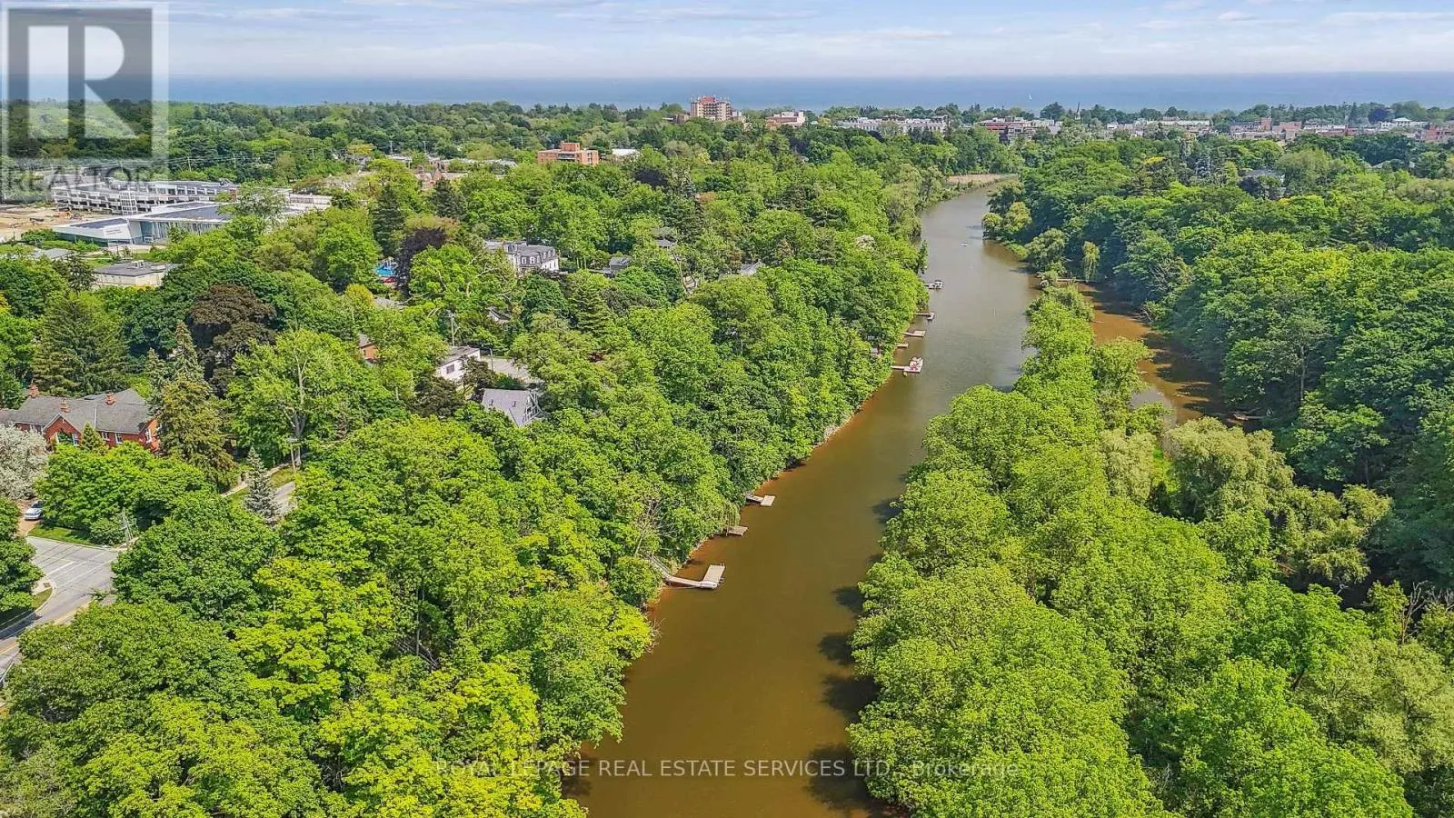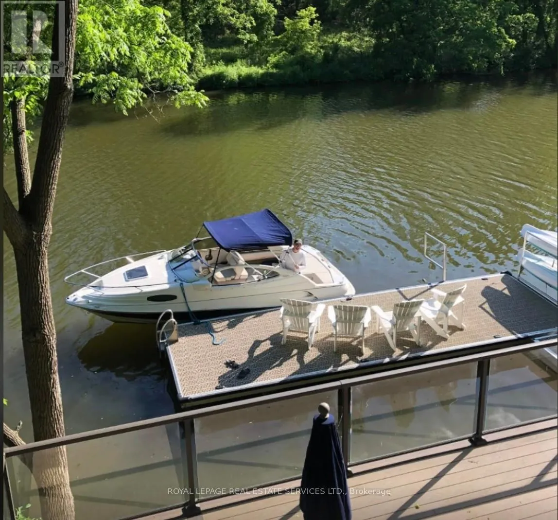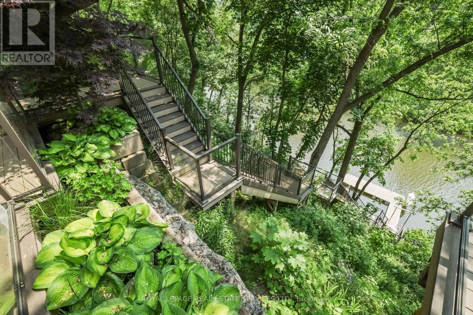 Trafalgar Rd & Cornwall Rd Private, elevated, and unlike anything else in Old Oakville - A true four-season outdoor retreat, your private playground for the outdoor enthusiast-where each day invites skating, paddling, kayaking, hiking, fishing, boating and cross-country skiing, alongside wildlife watching and refined al fresco dining, embracing nature in all its seasons. This lofted waterfront residence commands breathtaking views and unmatched privacy along the tranquil 16 Mile Creek. A testament to craftsmanship and design, this waterfront retreat boasts exclusive riparian rights and a private dock, inviting you to embrace the beauty of Oakville's scenic waterways year-round. .A meticulous 2016 renovation elevated this residence with rich hand-scraped oak floors, solid wood doors, custom millwork, and elegant tray ceilings. The sprawling 1,700 sq. ft. premium Wolf PVC deck includes a hot tub oasis, integrated fire table, and motorized awnings, leading to a dock with a kayak launch, swim ladder, and floating dock. Glass-encased staircases on helical piers deliver striking architectural presence and unbroken sight lines to the creek. Inside, sophistication defines every detail. Floor-to-ceiling windows in the living room frame stunning ravine views and dramatic sunsets, while a gas fireplace with a live-edge mantel adds warmth. The chef's kitchen impresses with a leathered Taj Mahal quartzite island, Wolf and Miele appliances, and an integrated Sub-Zero fridge. Heated floors run throughout, including in the spa-like primary ensuite with marble floors, a rain shower, and double vanity. The lower level offers a linear fireplace, built-in bar, and walkout to the deck. A concrete-lined storage room playfully known as the Bomb Shelter provides additional functionality. Blending natural beauty, refined design, and year-round outdoor living, this one-of-a-kind property is just steps to downtown Oakville and the GO Train offering luxury, serenity, and convenience in equal measure. (id:27476)