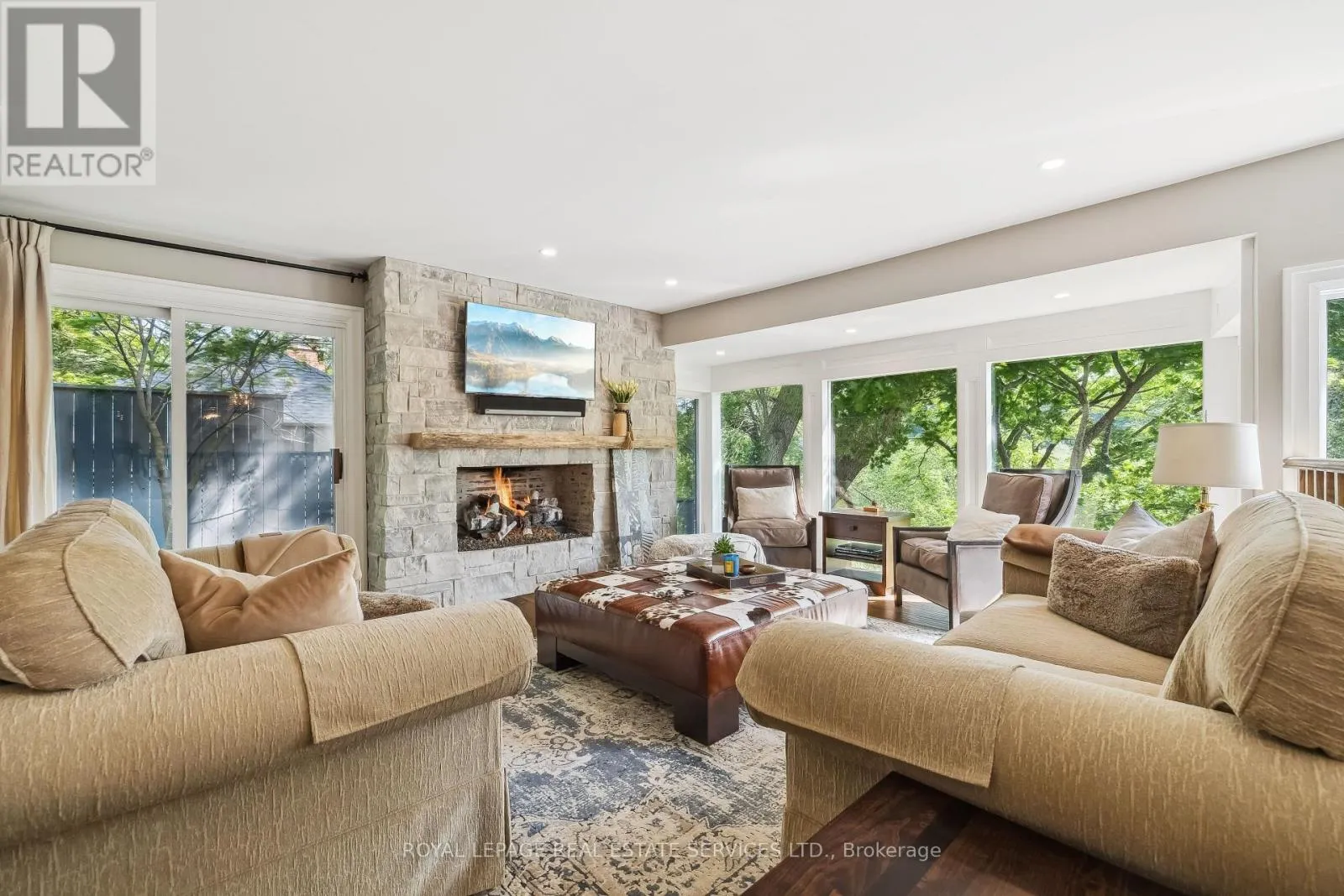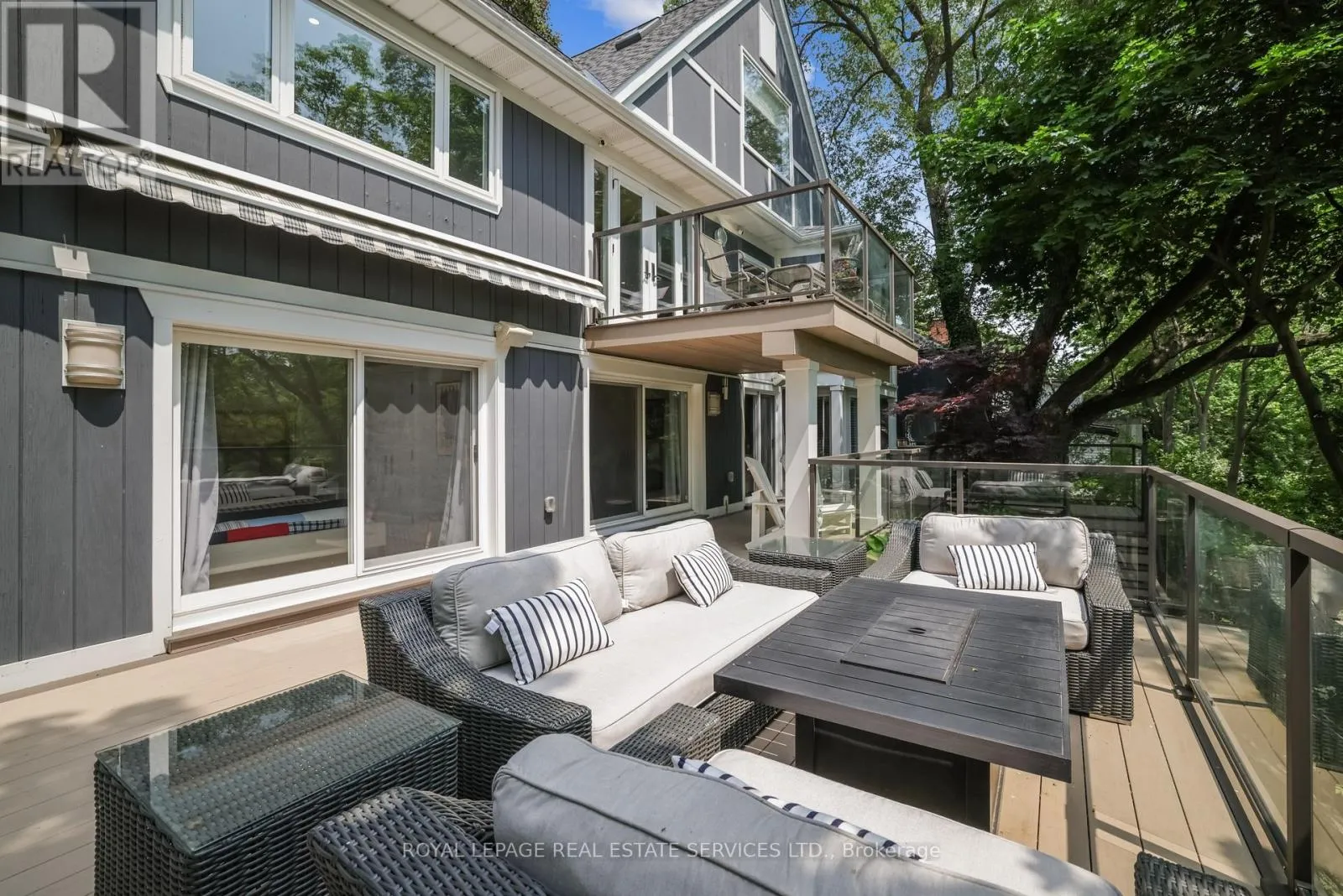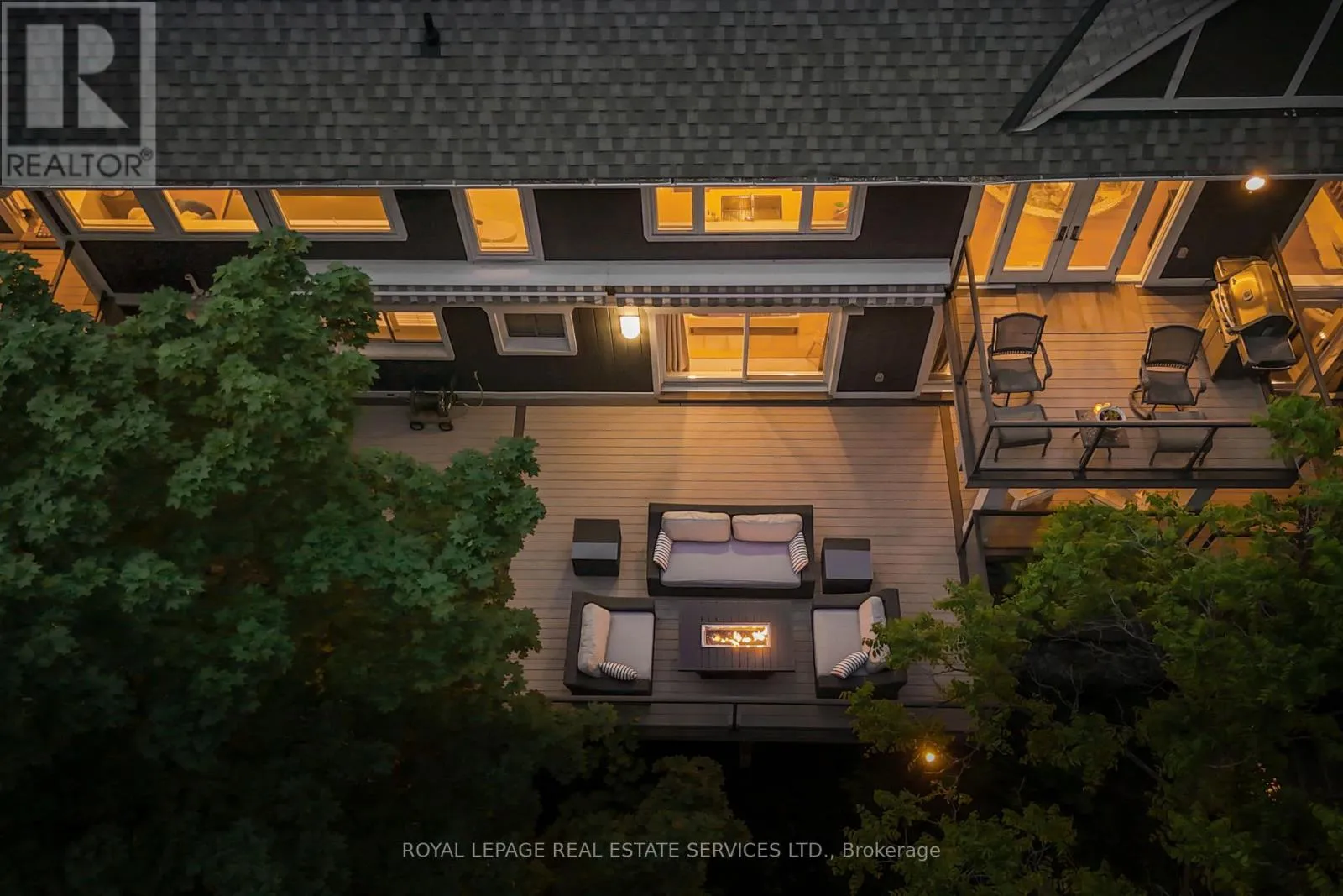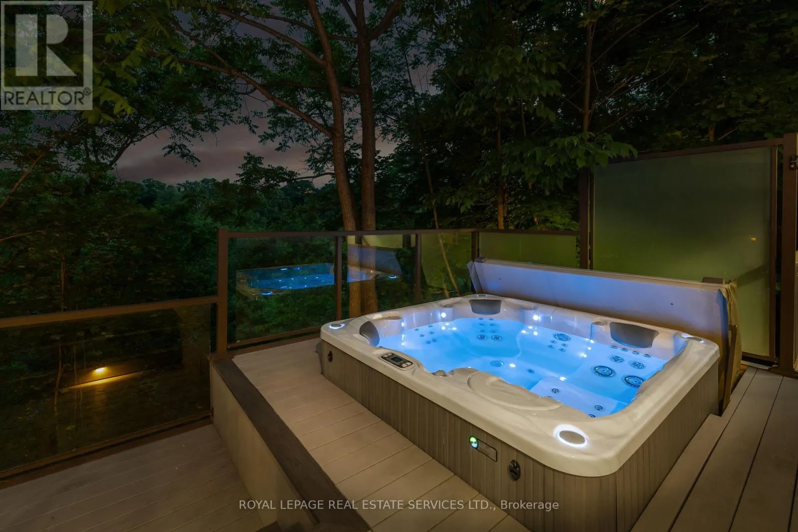 Trafalgar Rd & Cornwall Rd Private, elevated, and unlike anything else in Old Oakville - A true four-season outdoor retreat, your private playground for the outdoor enthusiast-where each day invites skating, paddling, kayaking, hiking, fishing, boating and cross-country skiing, alongside wildlife watching and refined al fresco dining, embracing nature in all its seasons. This lofted waterfront residence commands breathtaking views and unmatched privacy along the tranquil 16 Mile Creek. A testament to craftsmanship and design, this waterfront retreat boasts exclusive riparian rights and a private dock, inviting you to embrace the beauty of Oakville's scenic waterways year-round. .A meticulous 2016 renovation elevated this residence with rich hand-scraped oak floors, solid wood doors, custom millwork, and elegant tray ceilings. The sprawling 1,700 sq. ft. premium Wolf PVC deck includes a hot tub oasis, integrated fire table, and motorized awnings, leading to a dock with a kayak launch, swim ladder, and floating dock. Glass-encased staircases on helical piers deliver striking architectural presence and unbroken sight lines to the creek. Inside, sophistication defines every detail. Floor-to-ceiling windows in the living room frame stunning ravine views and dramatic sunsets, while a gas fireplace with a live-edge mantel adds warmth. The chef's kitchen impresses with a leathered Taj Mahal quartzite island, Wolf and Miele appliances, and an integrated Sub-Zero fridge. Heated floors run throughout, including in the spa-like primary ensuite with marble floors, a rain shower, and double vanity. The lower level offers a linear fireplace, built-in bar, and walkout to the deck. A concrete-lined storage room playfully known as the Bomb Shelter provides additional functionality. Blending natural beauty, refined design, and year-round outdoor living, this one-of-a-kind property is just steps to downtown Oakville and the GO Train offering luxury, serenity, and convenience in equal measure. (id:27476)