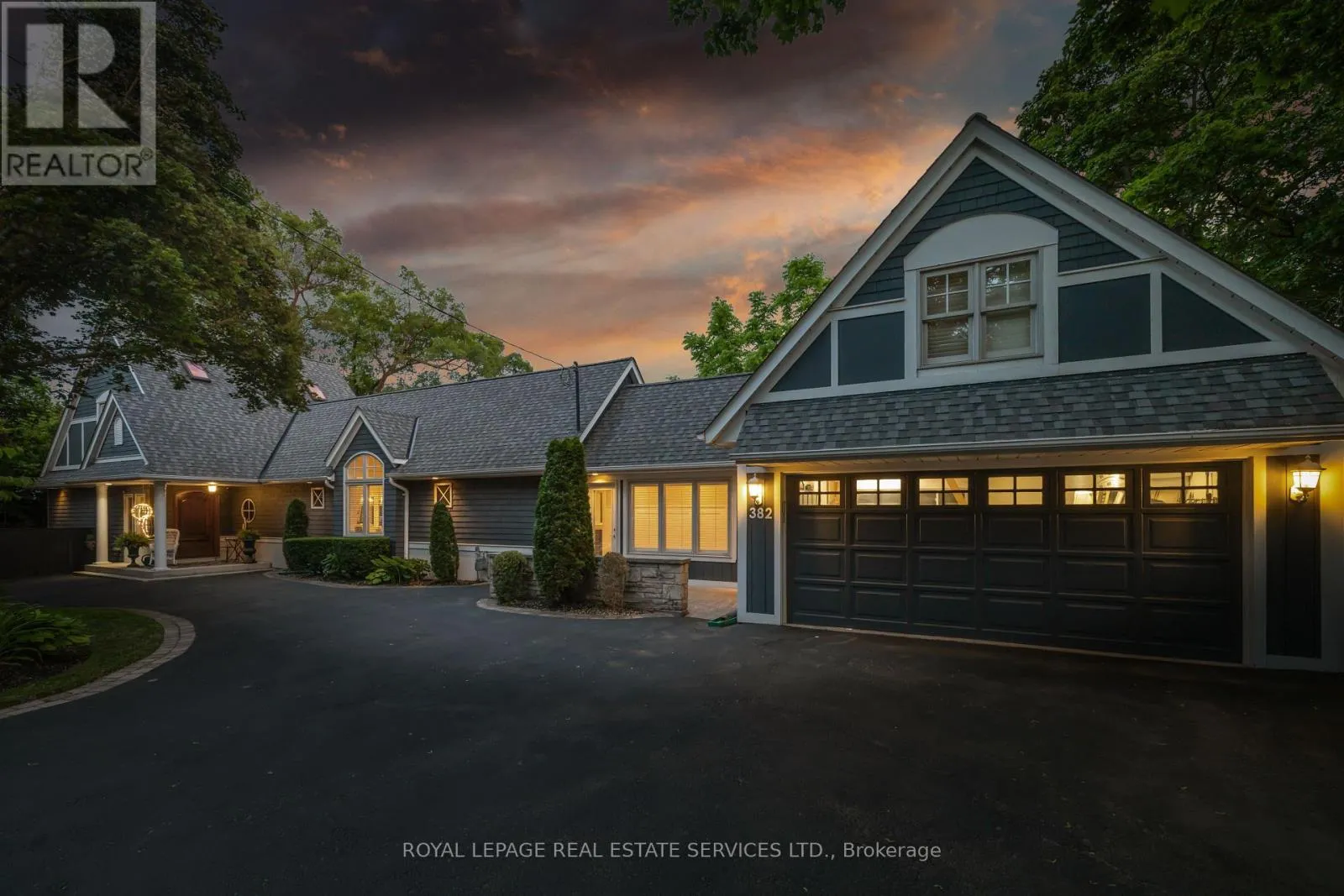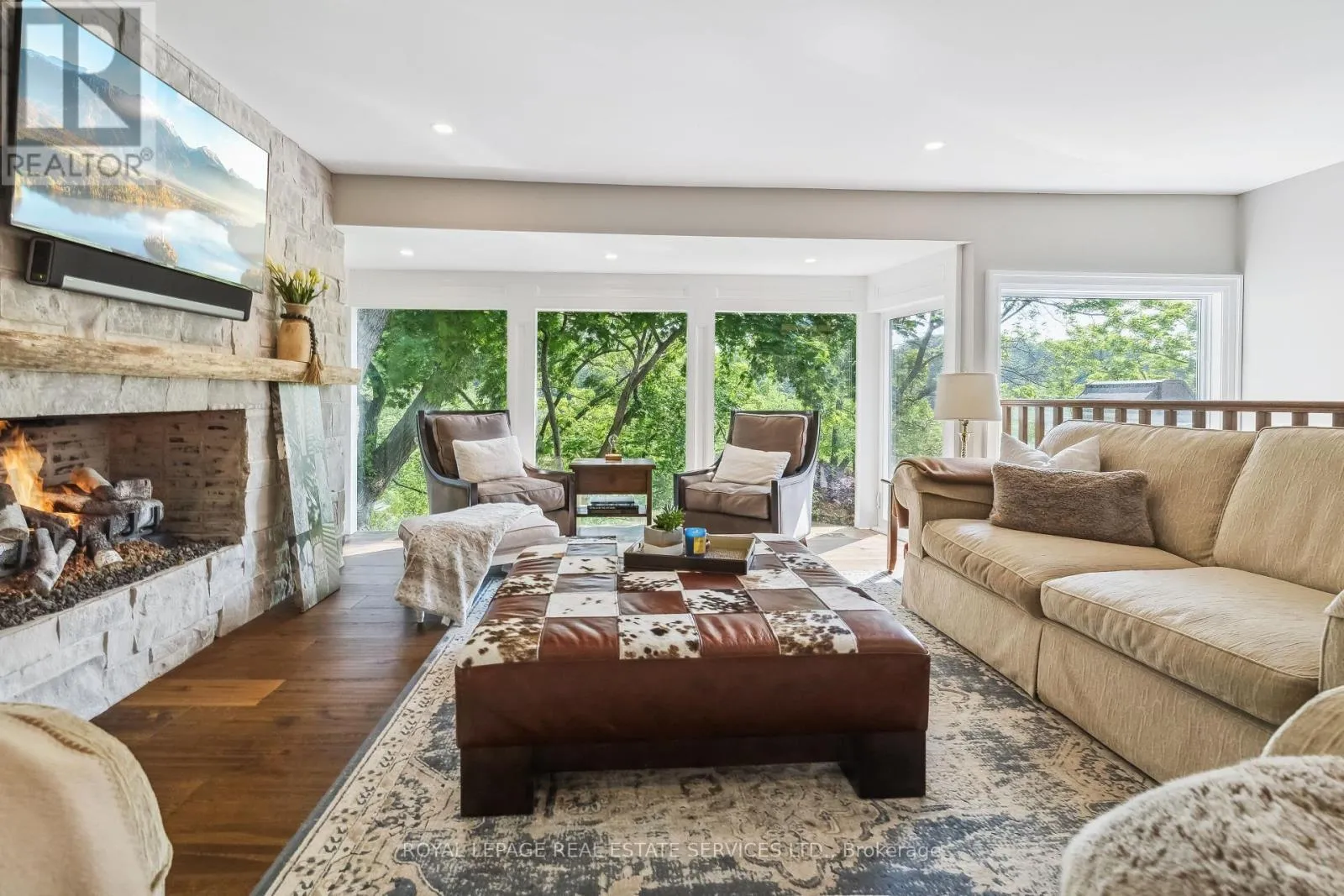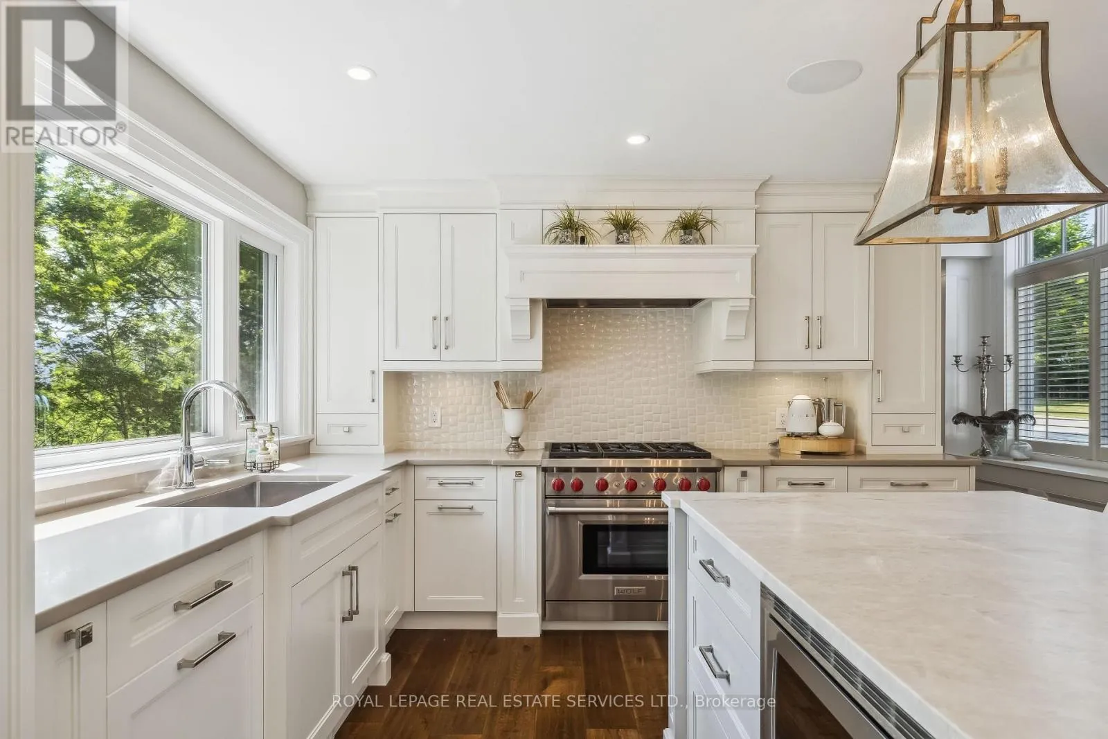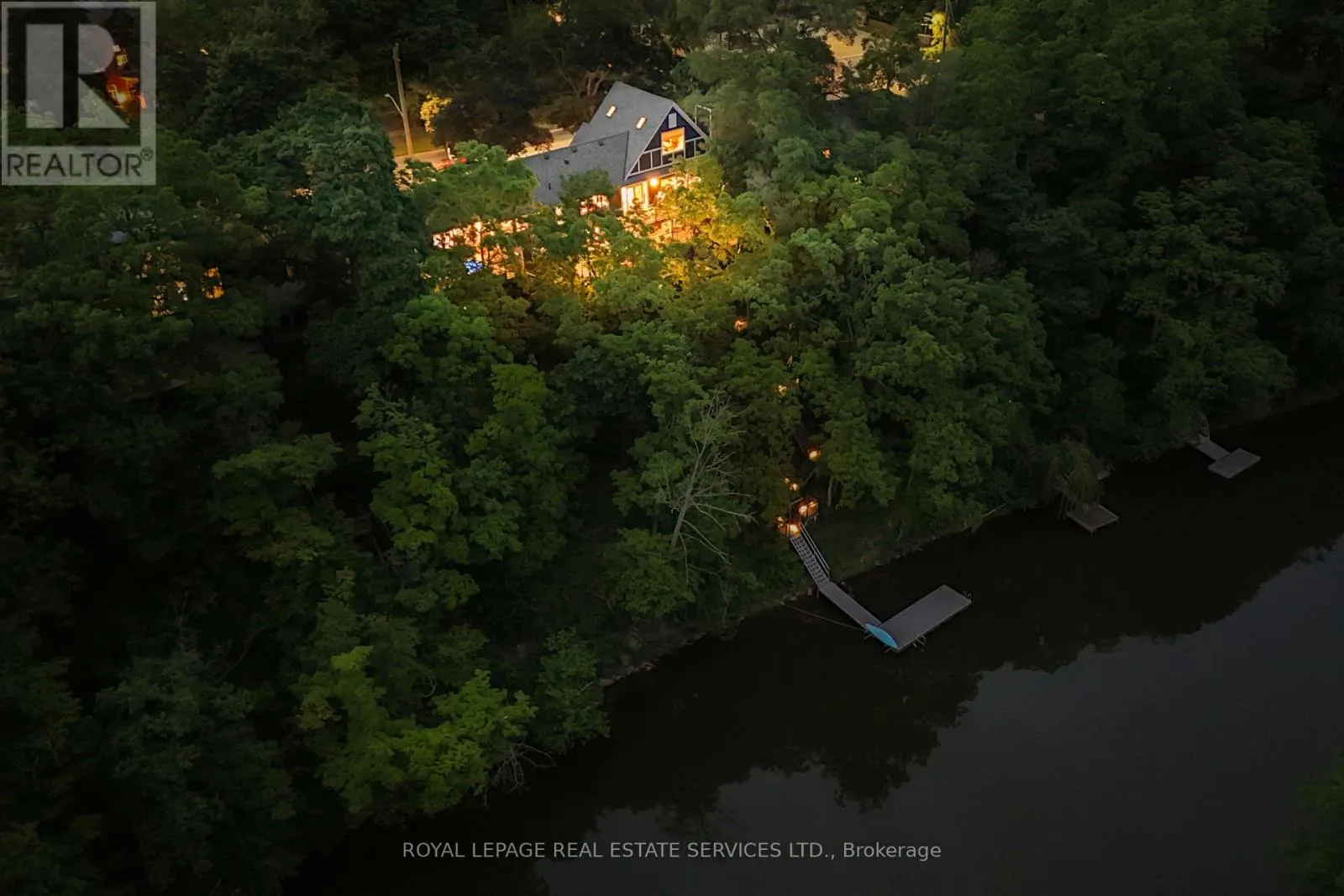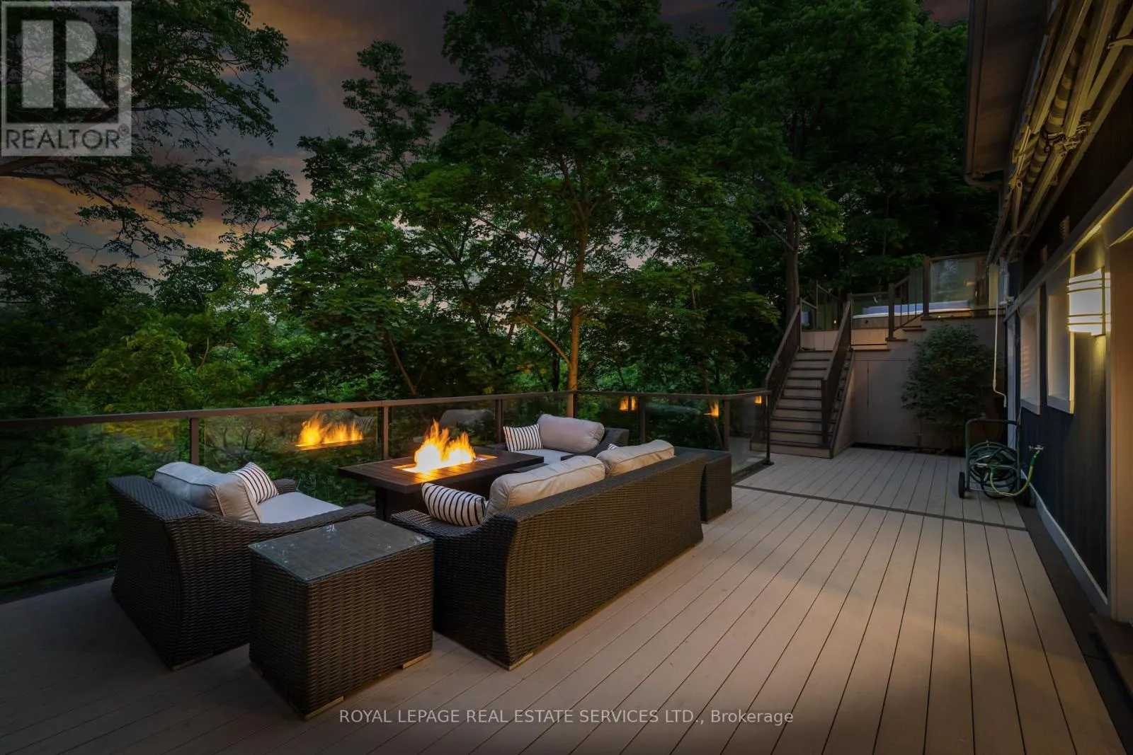 Trafalgar Rd & Cornwall Rd Private, elevated, and unlike anything else in Old Oakville - A true four-season outdoor retreat, your private playground for the outdoor enthusiast-where each day invites skating, paddling, kayaking, hiking, fishing, boating and cross-country skiing, alongside wildlife watching and refined al fresco dining, embracing nature in all its seasons. This lofted waterfront residence commands breathtaking views and unmatched privacy along the tranquil 16 Mile Creek. A testament to craftsmanship and design, this waterfront retreat boasts exclusive riparian rights and a private dock, inviting you to embrace the beauty of Oakville's scenic waterways year-round. .A meticulous 2016 renovation elevated this residence with rich hand-scraped oak floors, solid wood doors, custom millwork, and elegant tray ceilings. The sprawling 1,700 sq. ft. premium Wolf PVC deck includes a hot tub oasis, integrated fire table, and motorized awnings, leading to a dock with a kayak launch, swim ladder, and floating dock. Glass-encased staircases on helical piers deliver striking architectural presence and unbroken sight lines to the creek. Inside, sophistication defines every detail. Floor-to-ceiling windows in the living room frame stunning ravine views and dramatic sunsets, while a gas fireplace with a live-edge mantel adds warmth. The chef's kitchen impresses with a leathered Taj Mahal quartzite island, Wolf and Miele appliances, and an integrated Sub-Zero fridge. Heated floors run throughout, including in the spa-like primary ensuite with marble floors, a rain shower, and double vanity. The lower level offers a linear fireplace, built-in bar, and walkout to the deck. A concrete-lined storage room playfully known as the Bomb Shelter provides additional functionality. Blending natural beauty, refined design, and year-round outdoor living, this one-of-a-kind property is just steps to downtown Oakville and the GO Train offering luxury, serenity, and convenience in equal measure. (id:27476)