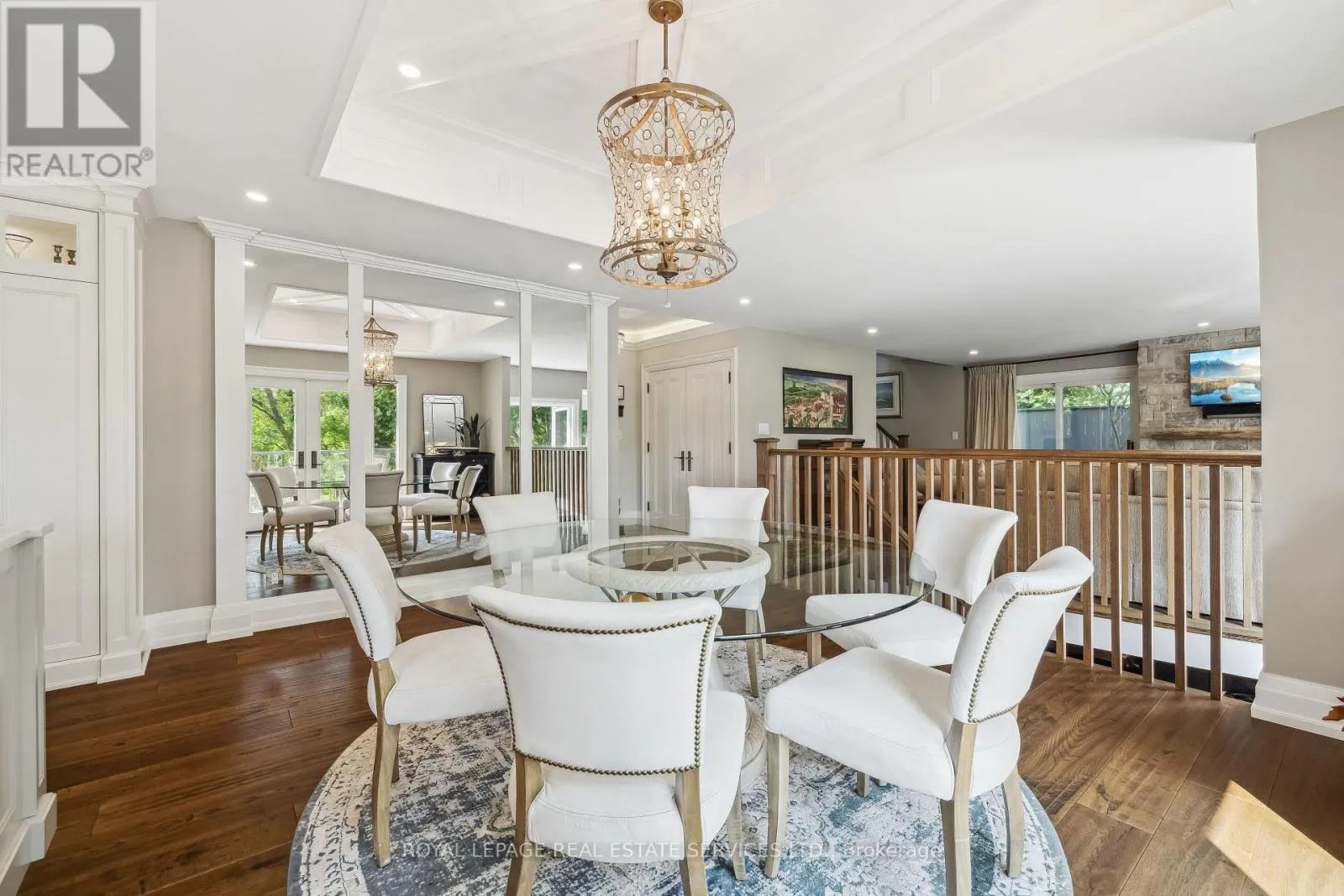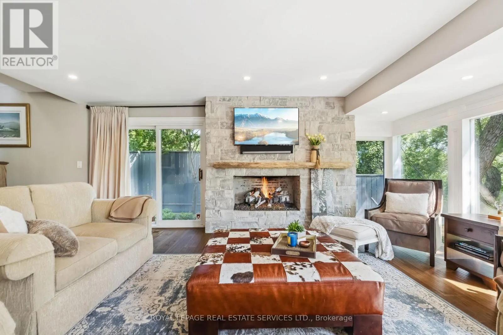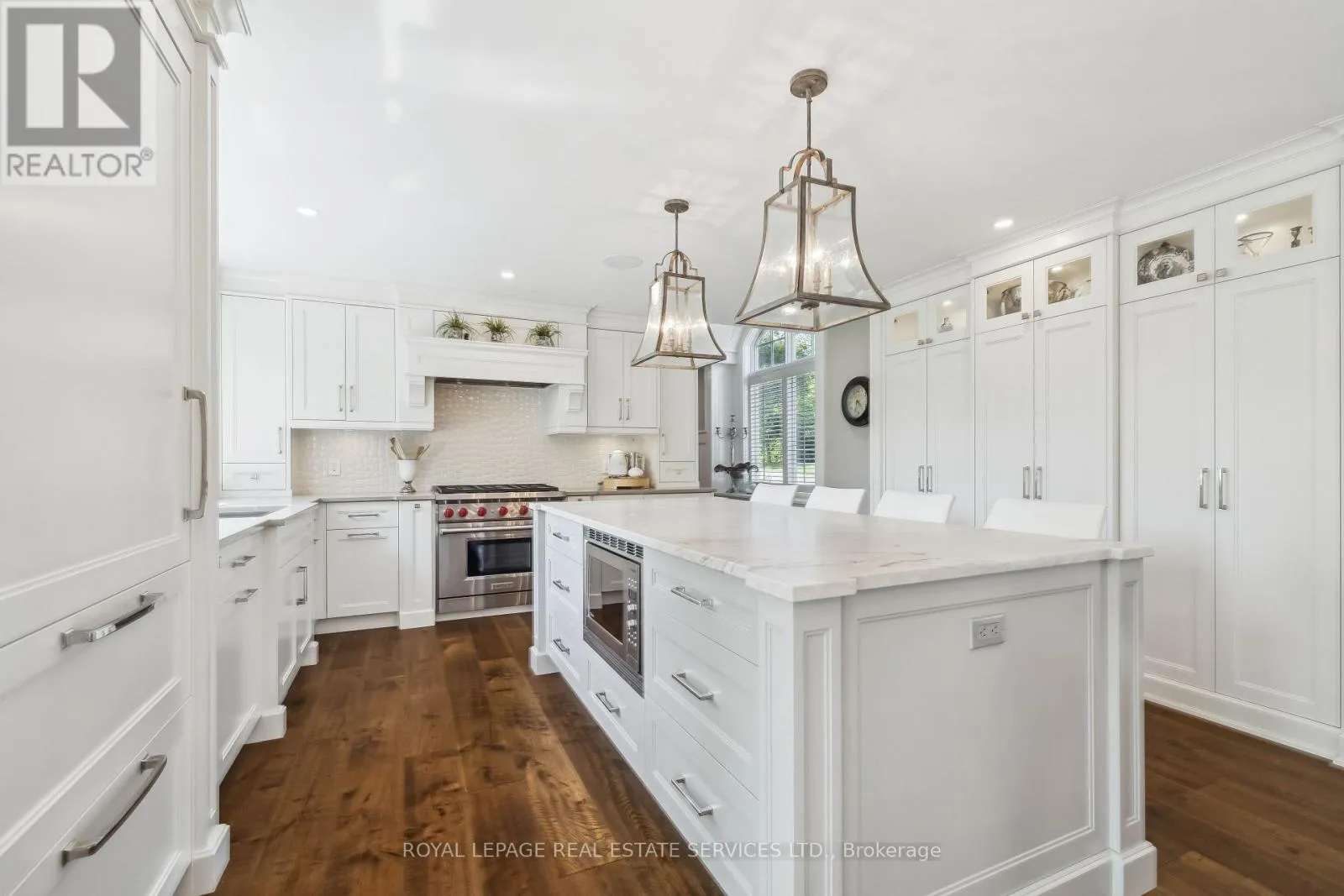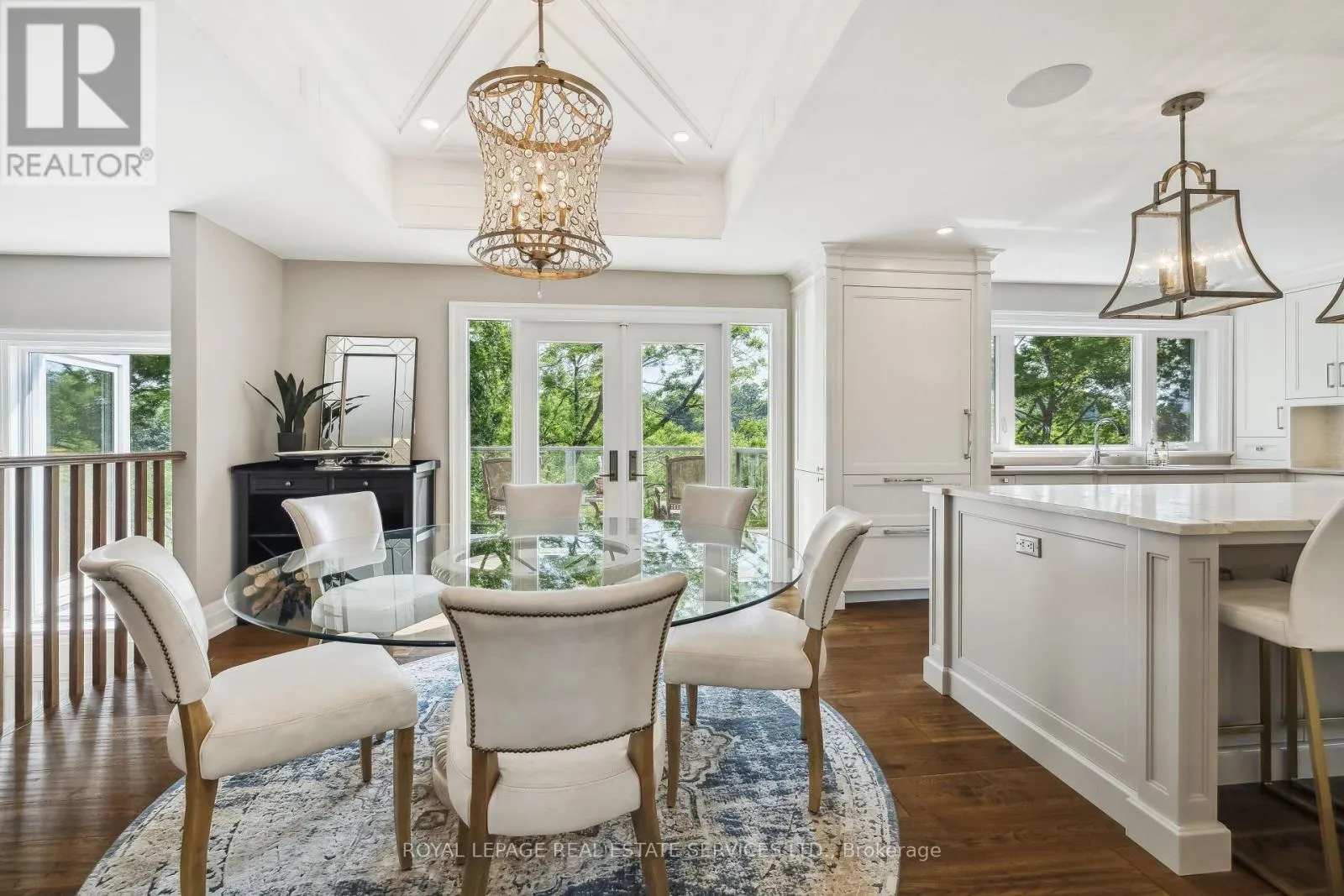 Trafalgar Rd & Cornwall Rd Private, elevated, and unlike anything else in Old Oakville - A true four-season outdoor retreat, your private playground for the outdoor enthusiast-where each day invites skating, paddling, kayaking, hiking, fishing, boating and cross-country skiing, alongside wildlife watching and refined al fresco dining, embracing nature in all its seasons. This lofted waterfront residence commands breathtaking views and unmatched privacy along the tranquil 16 Mile Creek. A testament to craftsmanship and design, this waterfront retreat boasts exclusive riparian rights and a private dock, inviting you to embrace the beauty of Oakville's scenic waterways year-round. .A meticulous 2016 renovation elevated this residence with rich hand-scraped oak floors, solid wood doors, custom millwork, and elegant tray ceilings. The sprawling 1,700 sq. ft. premium Wolf PVC deck includes a hot tub oasis, integrated fire table, and motorized awnings, leading to a dock with a kayak launch, swim ladder, and floating dock. Glass-encased staircases on helical piers deliver striking architectural presence and unbroken sight lines to the creek. Inside, sophistication defines every detail. Floor-to-ceiling windows in the living room frame stunning ravine views and dramatic sunsets, while a gas fireplace with a live-edge mantel adds warmth. The chef's kitchen impresses with a leathered Taj Mahal quartzite island, Wolf and Miele appliances, and an integrated Sub-Zero fridge. Heated floors run throughout, including in the spa-like primary ensuite with marble floors, a rain shower, and double vanity. The lower level offers a linear fireplace, built-in bar, and walkout to the deck. A concrete-lined storage room playfully known as the Bomb Shelter provides additional functionality. Blending natural beauty, refined design, and year-round outdoor living, this one-of-a-kind property is just steps to downtown Oakville and the GO Train offering luxury, serenity, and convenience in equal measure. (id:27476)