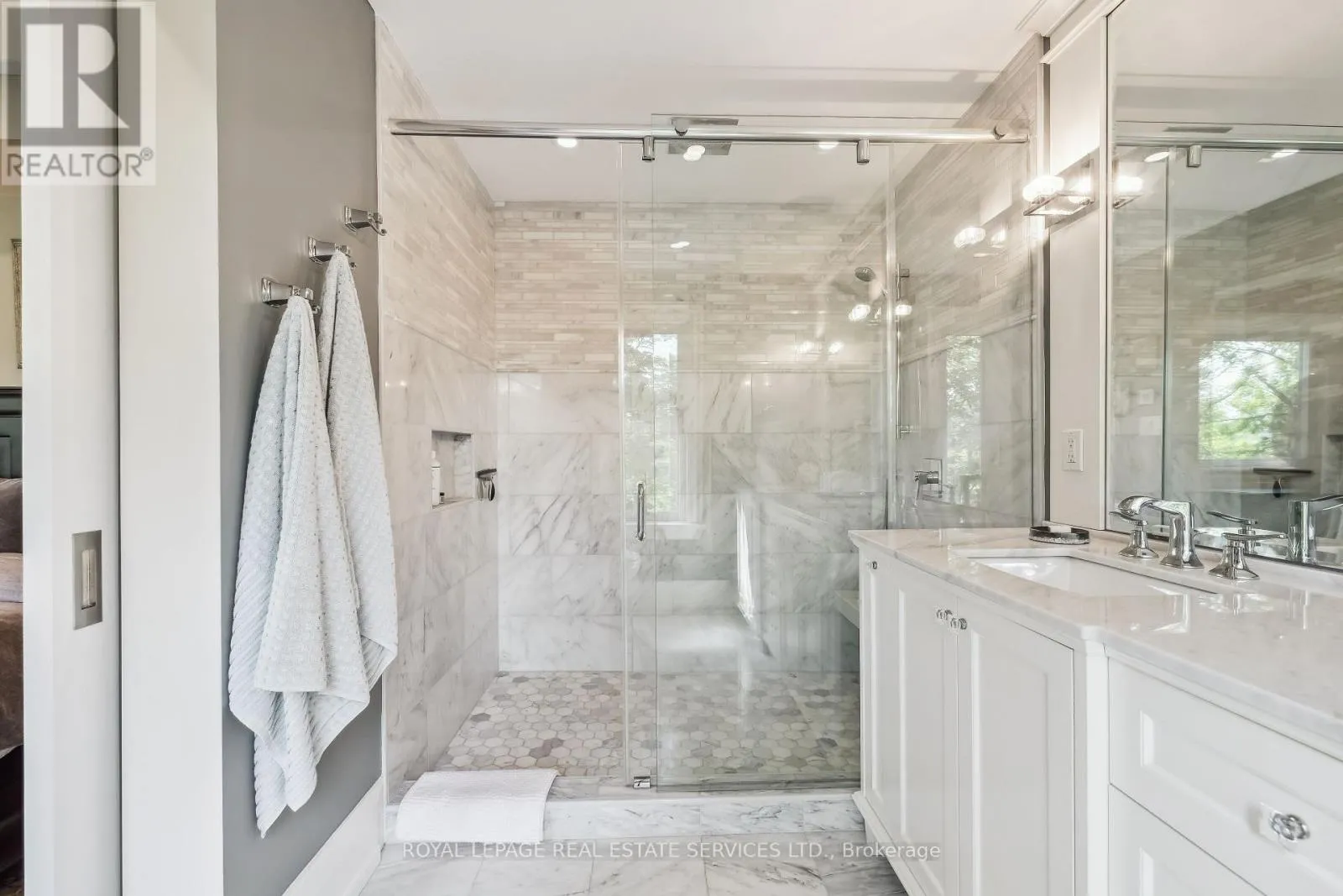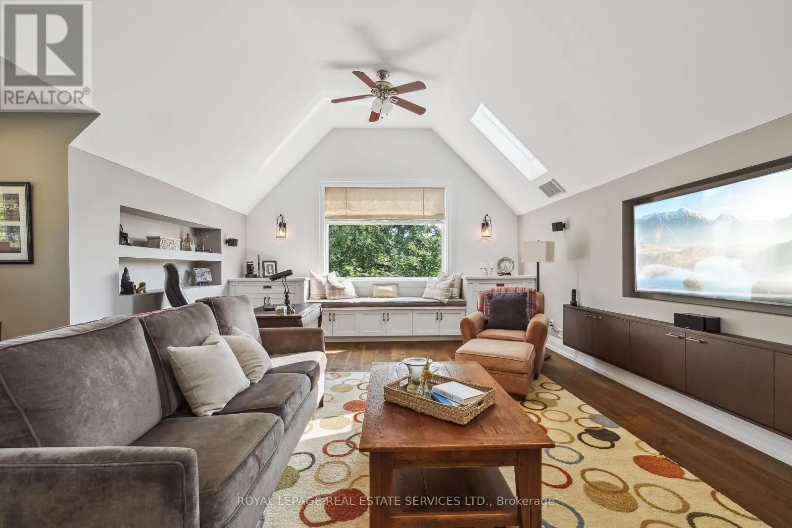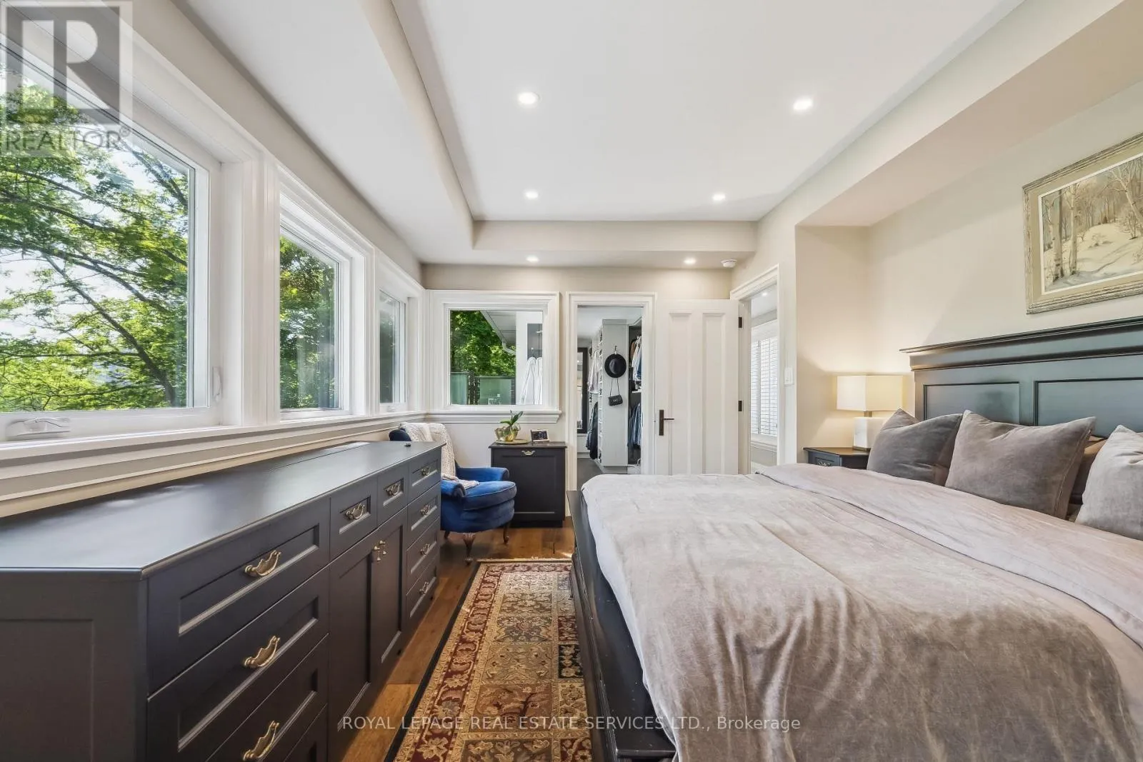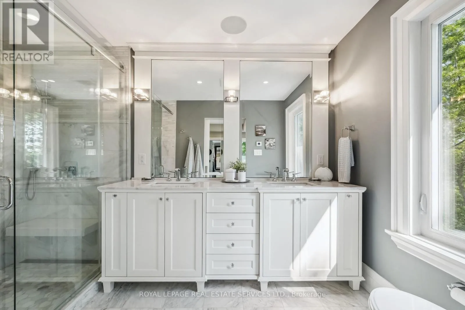 Trafalgar Rd & Cornwall Rd Private, elevated, and unlike anything else in Old Oakville - A true four-season outdoor retreat, your private playground for the outdoor enthusiast-where each day invites skating, paddling, kayaking, hiking, fishing, boating and cross-country skiing, alongside wildlife watching and refined al fresco dining, embracing nature in all its seasons. This lofted waterfront residence commands breathtaking views and unmatched privacy along the tranquil 16 Mile Creek. A testament to craftsmanship and design, this waterfront retreat boasts exclusive riparian rights and a private dock, inviting you to embrace the beauty of Oakville's scenic waterways year-round. .A meticulous 2016 renovation elevated this residence with rich hand-scraped oak floors, solid wood doors, custom millwork, and elegant tray ceilings. The sprawling 1,700 sq. ft. premium Wolf PVC deck includes a hot tub oasis, integrated fire table, and motorized awnings, leading to a dock with a kayak launch, swim ladder, and floating dock. Glass-encased staircases on helical piers deliver striking architectural presence and unbroken sight lines to the creek. Inside, sophistication defines every detail. Floor-to-ceiling windows in the living room frame stunning ravine views and dramatic sunsets, while a gas fireplace with a live-edge mantel adds warmth. The chef's kitchen impresses with a leathered Taj Mahal quartzite island, Wolf and Miele appliances, and an integrated Sub-Zero fridge. Heated floors run throughout, including in the spa-like primary ensuite with marble floors, a rain shower, and double vanity. The lower level offers a linear fireplace, built-in bar, and walkout to the deck. A concrete-lined storage room playfully known as the Bomb Shelter provides additional functionality. Blending natural beauty, refined design, and year-round outdoor living, this one-of-a-kind property is just steps to downtown Oakville and the GO Train offering luxury, serenity, and convenience in equal measure. (id:27476)