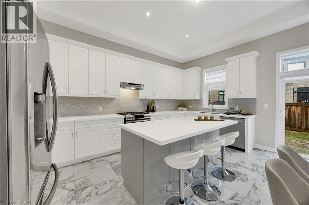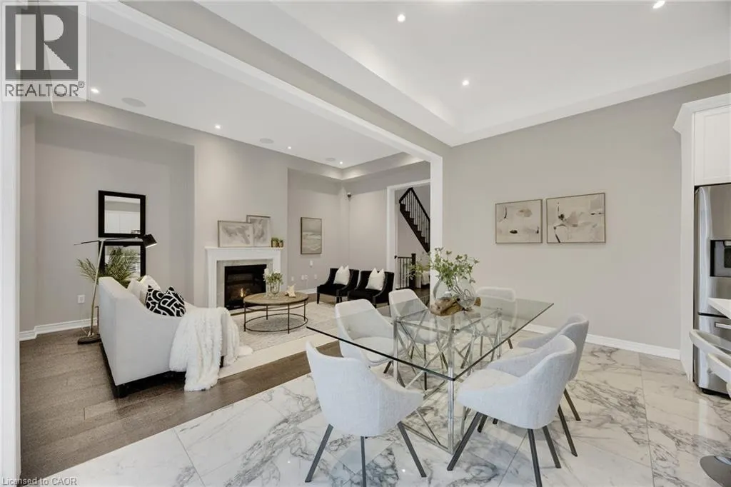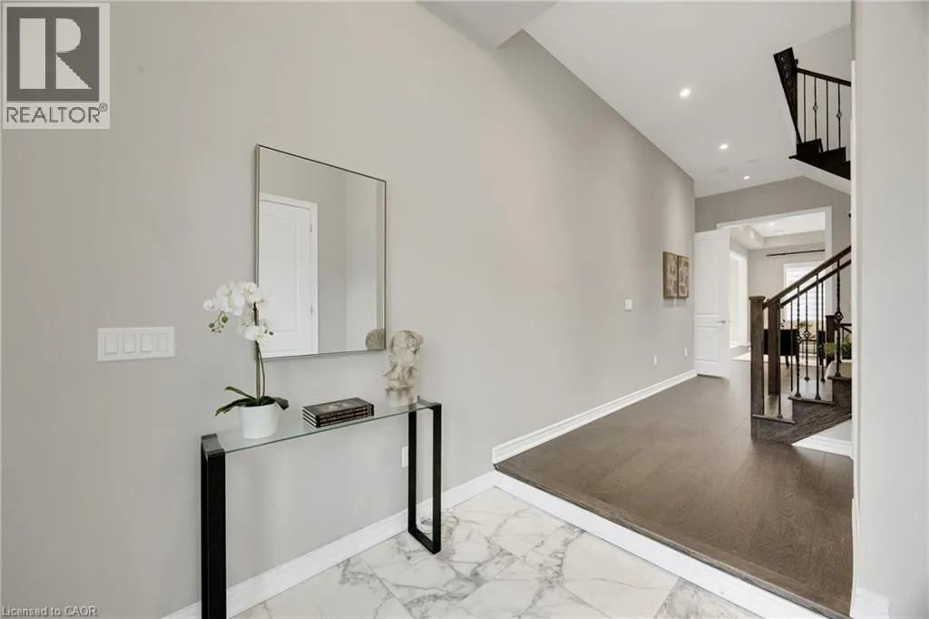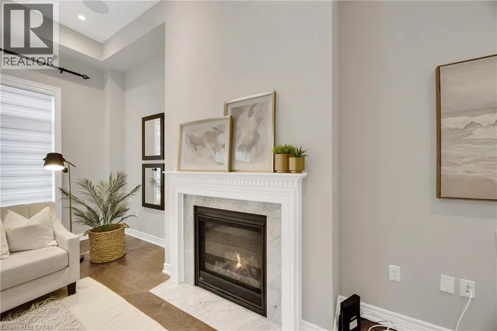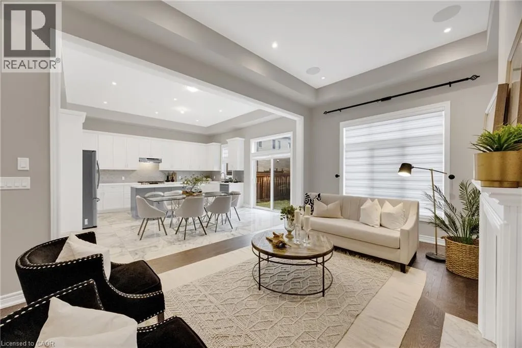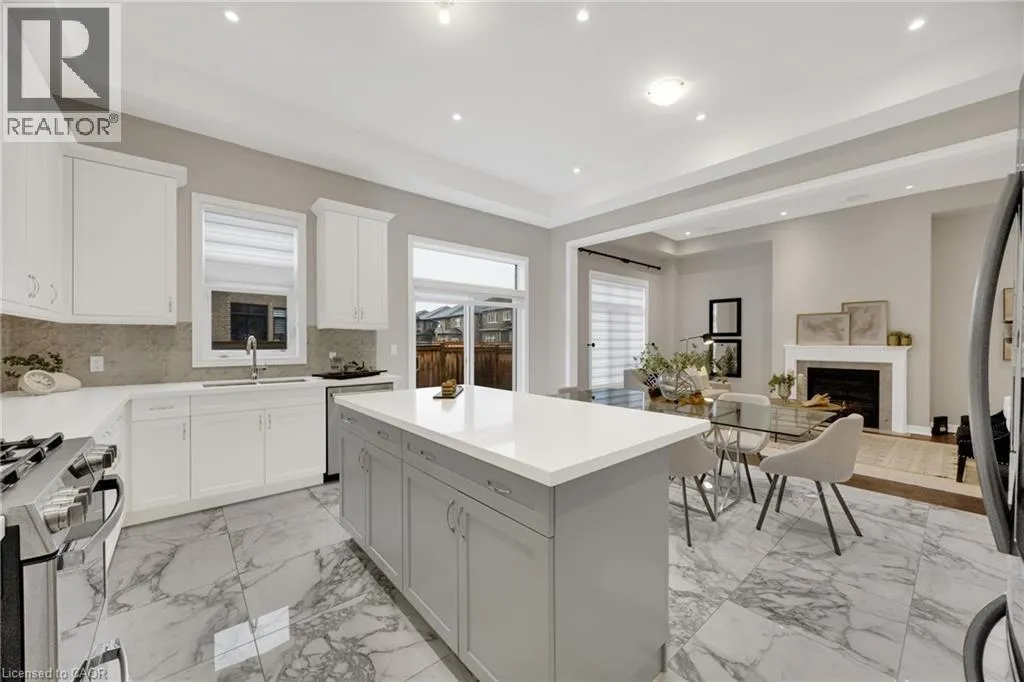 Welcome to an exceptional residence in the prestigious Seven Oaks enclave of the highly sought-after GO Glenorchy community, known for scenic parks, top-rated schools, and easy access to highways and amenities. This elegant home features 11-foot ceilings, 8-foot doors, and rich oak hardwood flooring, creating a bright, sophisticated feel. The open-concept main floor includes a cozy gas fireplace and a stylish kitchen with a large island, ideal for everyday living and entertaining. Thoughtful upgrades include automated window coverings, rough-in ceiling speakers, and a custom staircase with black birds nest style steel spindles. The primary suite offers dual walk-in closets and a spa-like ensuite with double sinks, marble tile, a Moen spa system, and frameless glass shower. Spacious bedrooms provide flexibility for family or work-from-home needs. The fully fenced backyard offers privacy for relaxation or entertaining. Built in 2022 by Fernbrook Homes and covered by Tarion Warranty, this home blends modern design with lasting quality. Book your private showing today! (id:27476)