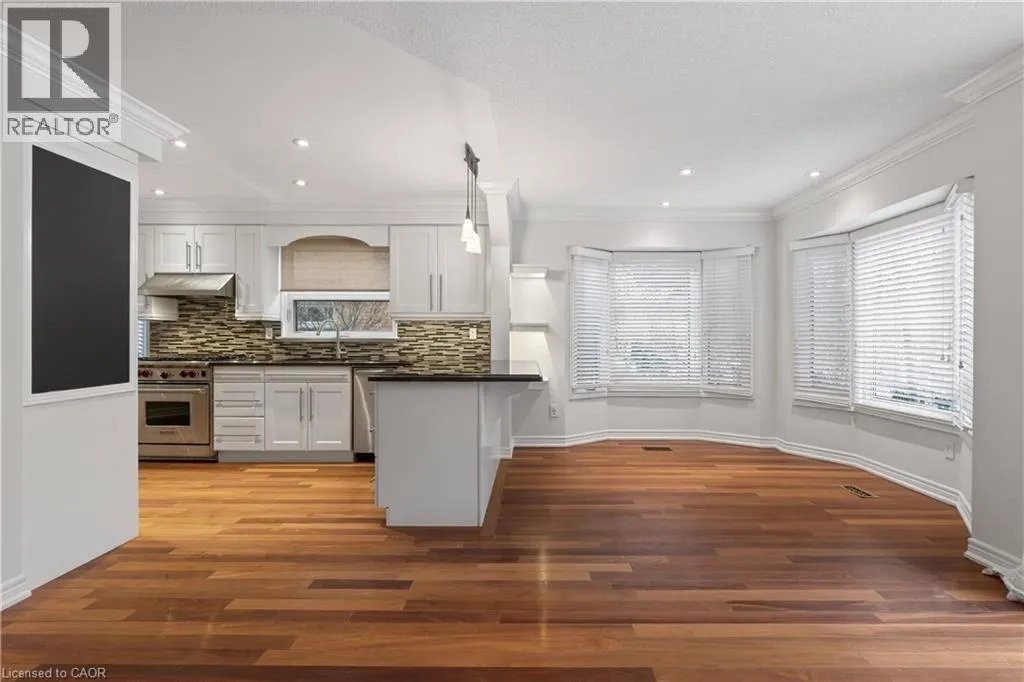 6 Line/ Upper Middle Lovely end-unit townhome in the highly desirable, family-friendly River Oaks community, backing onto ravine for added privacy and peaceful views! This well-maintained home offers a bright and spacious layout with 3 bedrooms, plus a finished basement, perfect for families or those needing extra living space. The main level features an upgraded kitchen with bright, new kitchen cabinetry and ample workspace, crown moulding, pot lights, and a cozy gas fireplace. Renovated bathrooms add modern appeal throughout. The primary bedroom retreat boasts a cathedral ceiling and an oversized soaker tub for ultimate relaxation. Freshly painted throughout and includes a brand new washer and dryer. Enjoy parking for two vehicles and low-maintenance living in a prime location. Just a short walk to Oakville Place Mall, top-rated schools, parks, trails, and public transit, with easy access to major highways and everyday amenities. A fantastic opportunity to own a move-in-ready home in one of Oakvilleâs most sought-after neighbourhoods! (id:27476)