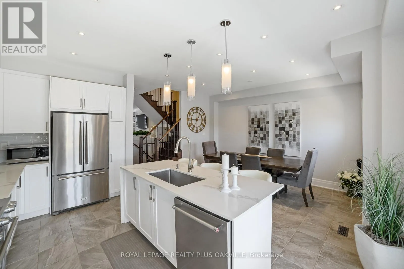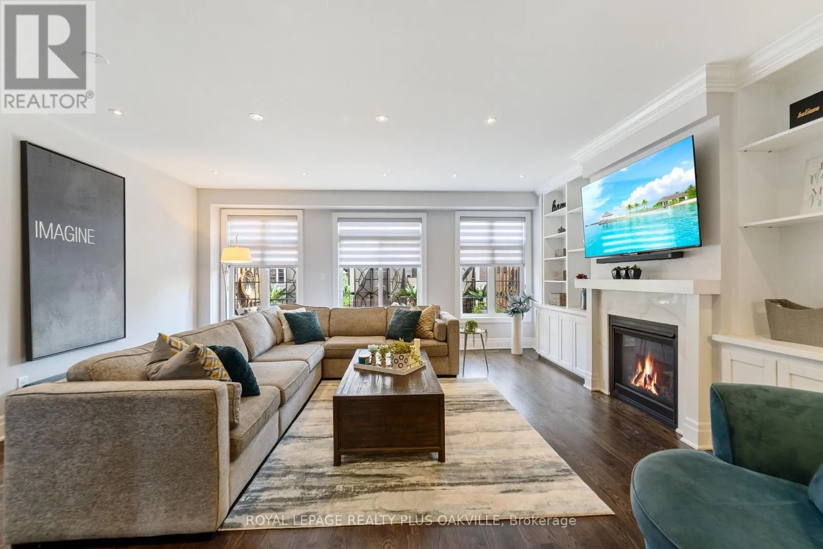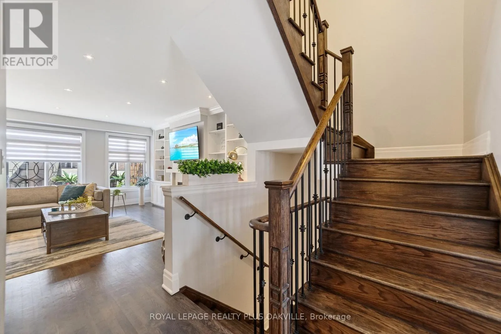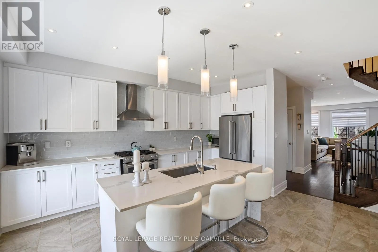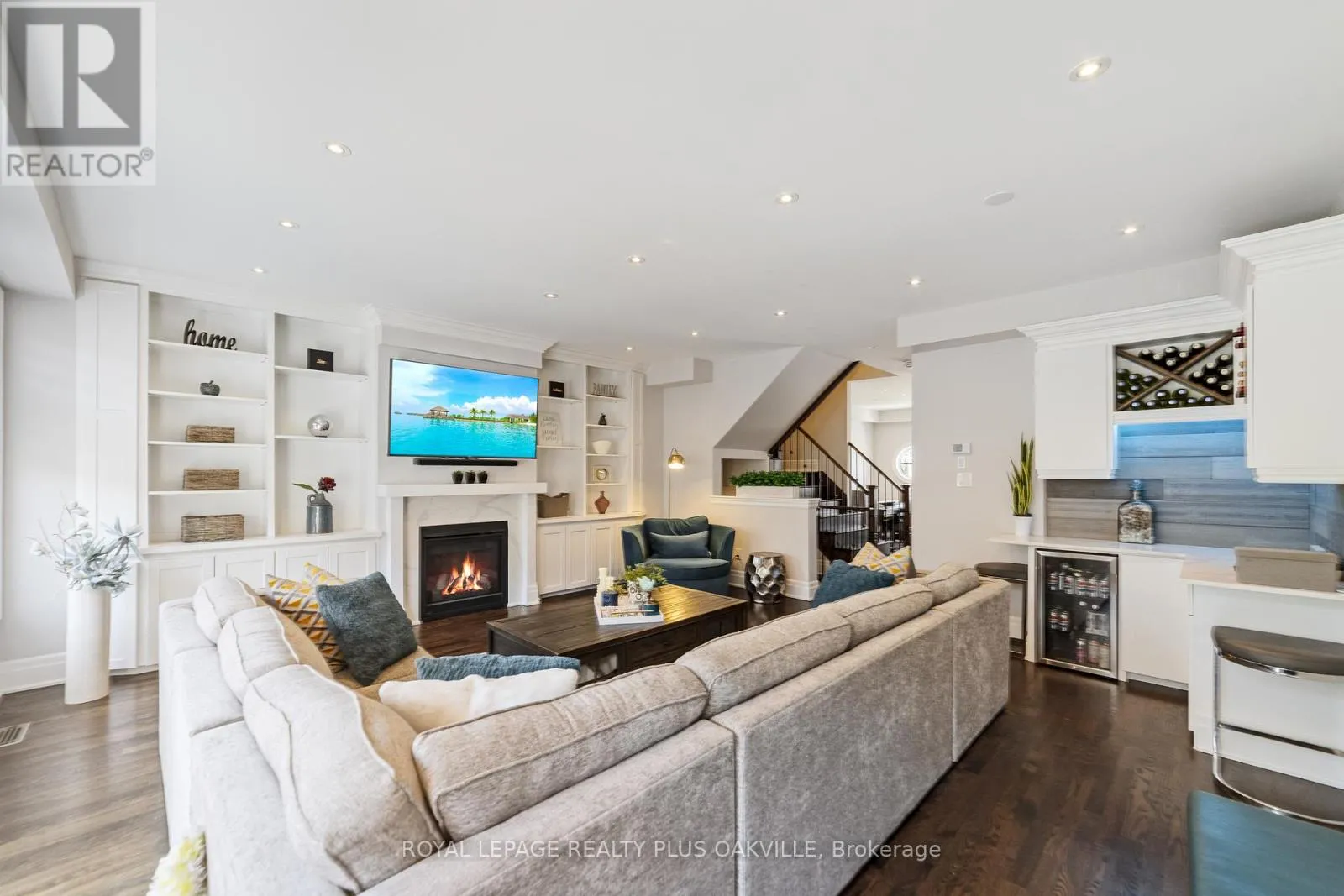 Bronte Rd & Khalsa Gate Bright, spacious, and beautifully appointed executive townhome in desirable Westmount, offering over 2,200 sq ft of thoughtfully designed living space across three levels. Ideal for professionals, couples, or families, this home features a rare 4-car parking setup, including a double car garage. The walk-in level welcomes you with a bright and versatile living space complete with an electric fireplace, custom built-ins, convenient storage, and direct access to the garage-this space is perfect for a home office, media room, or additional lounge area. Designed with entertaining in mind, the second level showcases a stunning family room with rich hardwood floors, extensive built-ins, a gas fireplace, and a stylish bar area with lighting, bar fridge, and seating. The modern kitchen is equally impressive, featuring white cabinetry, quartz countertops, glass backsplash, stainless steel appliances, and a large island with breakfast bar seating. It flows seamlessly into a generous dining area that comfortably accommodates 8-10 guests. Step out to the beautiful 200 sq ft deck-an ideal space for morning coffee or evening unwinding. Upstairs, the bedroom level offers three spacious bedrooms, two full bathrooms, and a convenient laundry room. The oversized primary retreat features dual closets and a well-appointed ensuite with double vanity and a walk-in glass shower. Additional highlights include hardwood flooring on the stairs and throughout the upper level (no carpet) and custom window coverings throughout. Perfectly located close to highways, scenic trails, shopping, and everyday conveniences, this move-in ready home offers exceptional value in a highly sought-after community. (id:27476)