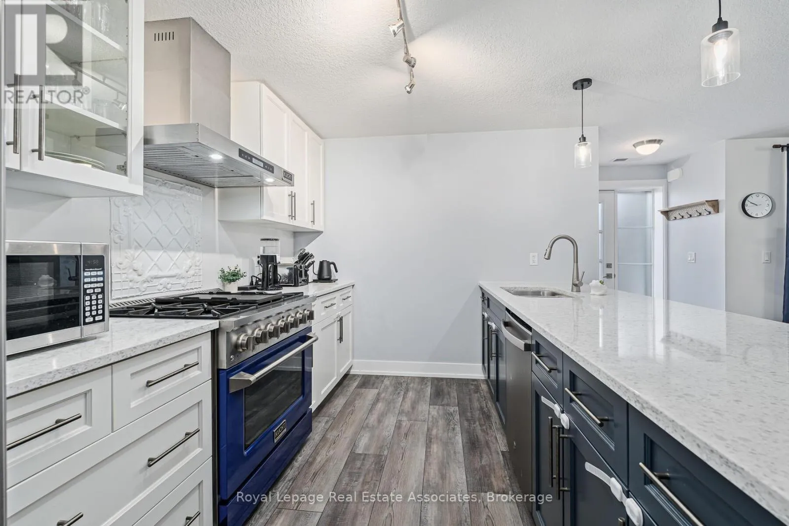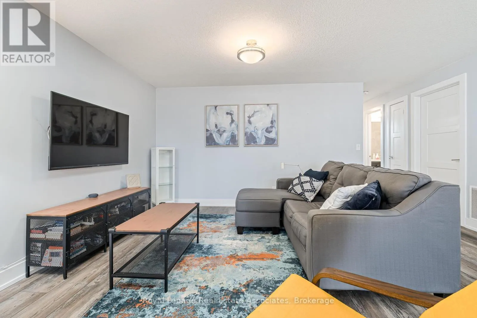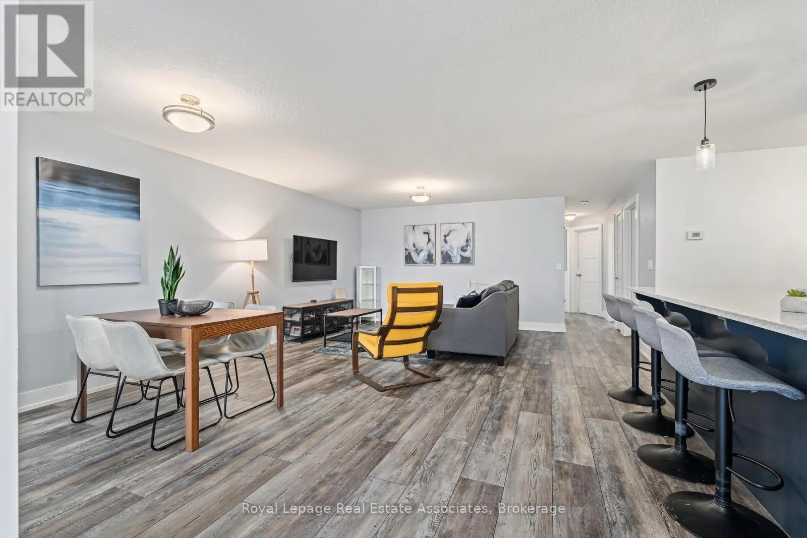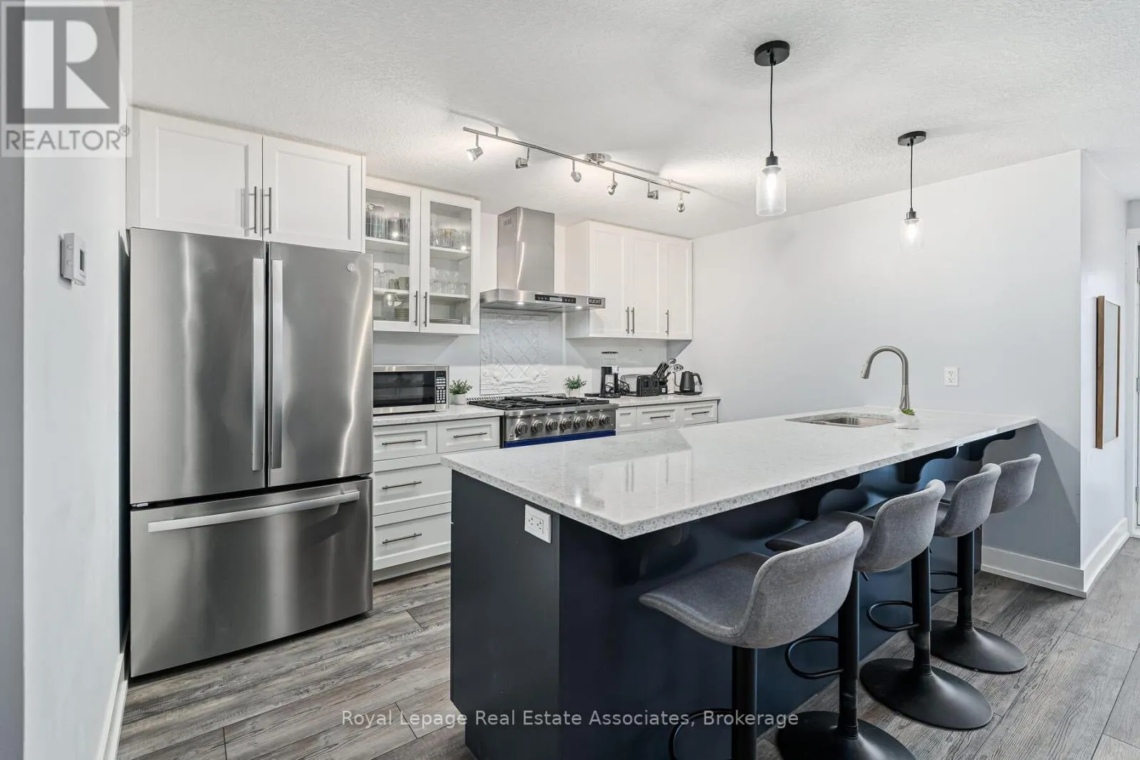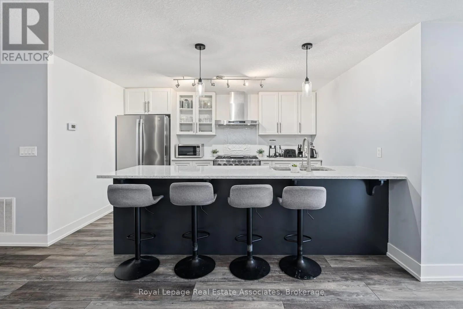 Cross Streets: Broadway/Centre St. ** Directions: Broadway/Dawson Rd. Built in 2021, this bright and beautifully maintained 2-bedroom, 2-bathroom apartment with 2 parking spots, in a highly walkable location, is ideal for first-time homebuyers, downsizers, or investors. Nestled in a quiet, safe, and friendly neighbourhood just minutes from the heart of downtown Orangeville, the home features an open-concept layout with luxury vinyl flooring throughout. The kitchen is thoughtfully designed with quartz countertops, stainless steel appliances, a gas stove, a double sink, ample cabinetry, and a peninsula with seating. The spacious living and dining area is perfect for relaxing or entertaining, with a convenient walkout to the terrace, perfect for barbecues and enjoying the warmer months. The primary bedroom includes a walk-in closet and a 4-piece ensuite with a quartz countertop and a double sink, while the second bedroom offers a double closet and easy access to the secondary 4-piece bathroom, also finished with quartz countertop and tile flooring. Enjoy low-maintenance living with a well-managed condo corporation that handles exterior maintenance, roofing, windows, doors, snow removal, landscaping, window washing, garbage removal, and visitor parking. With charming streets, local shops, restaurants, and seasonal community events nearby, everything you need is within easy reach. (id:27476)