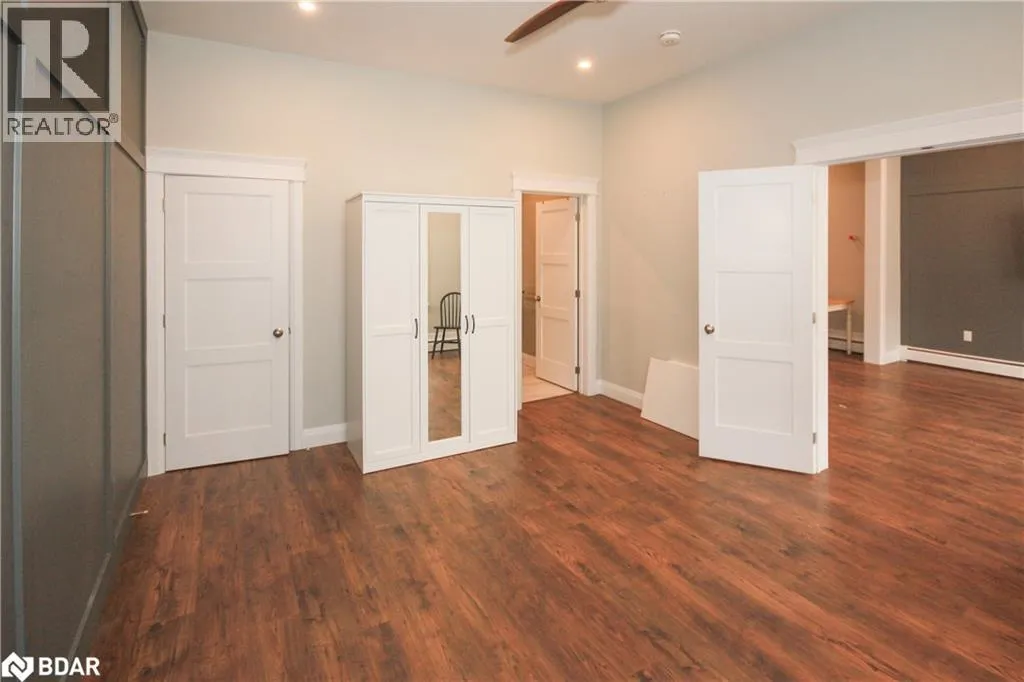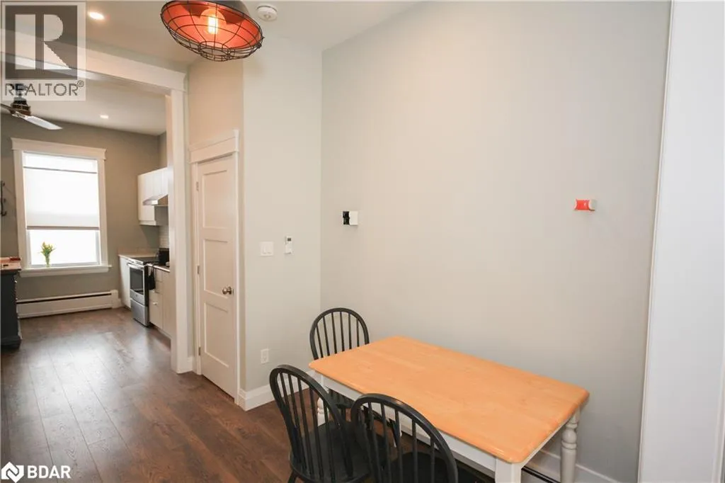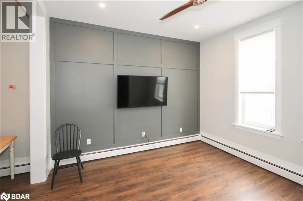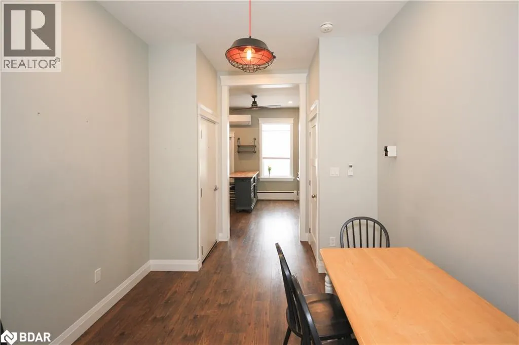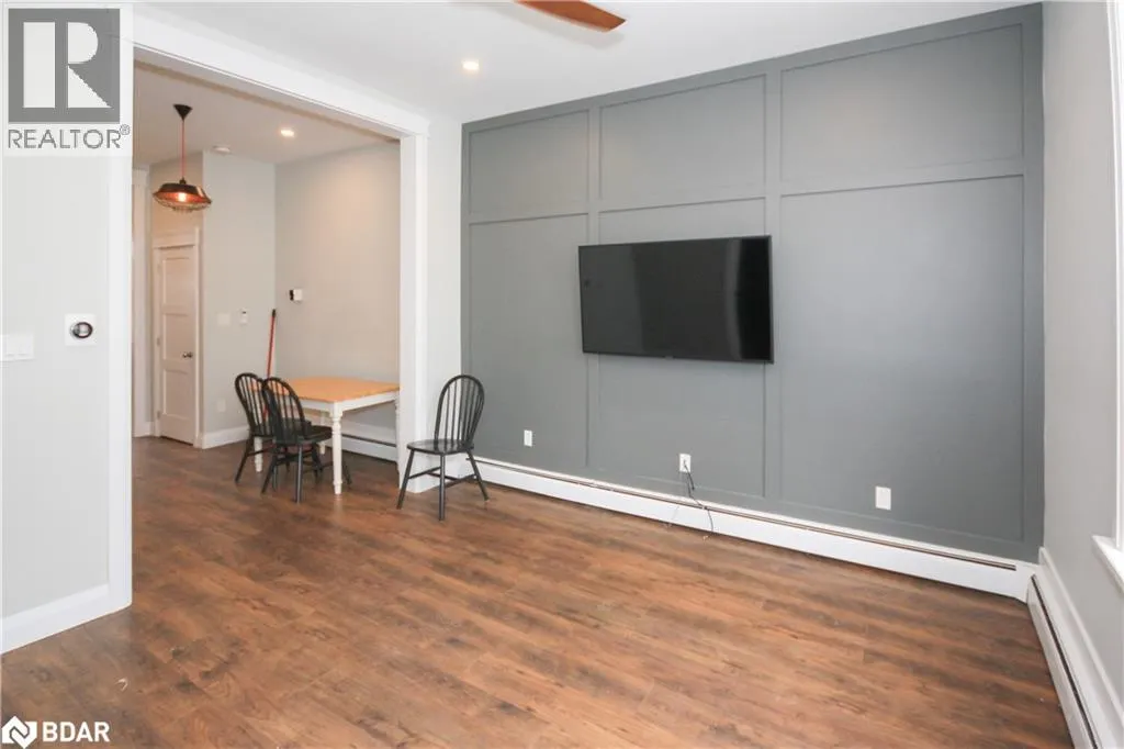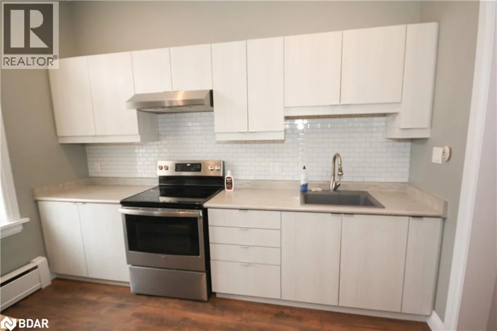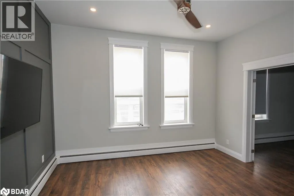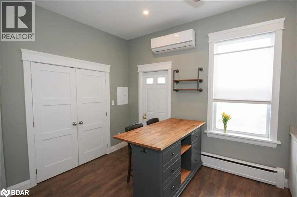 Peter Street between Colbourne and Mississauga Discover modern urban living in this beautifully renovated 1-bedroom loft apartment, ideally situated in the vibrant core of Orillias Arts District. This bright and airy unit showcases a thoughtfully updated interior with contemporary finishes throughout featuring wide-plank flooring, fresh neutral tones, recessed lighting, and elegant trim details that complement the home's historic charm. The spacious kitchen offers sleek cabinetry, a subway tile backsplash, stainless steel appliances, and an extended butcher-block island perfect for entertaining or casual dining. The open-concept layout flows into a cozy living area with oversized windows and a dramatic feature wall, ideal for showcasing art or your home theatre setup. Enjoy the convenience of a stylish 3-piece bath with modern fixtures, a glass-enclosed shower, and floating vanity, along with a generous walk-in closet and in-unit climate control. Step outside and immerse yourself in the cultural energy of downtown Orillia just steps from shops, cafés, live music venues, the Orillia Museum of Art & History, and the beloved Mariposa Market.Low-maintenance, turn-key, and perfectly positioned for creatives, professionals, and culture lovers alike this is a rare opportunity to live where art and community meet. (id:27476)