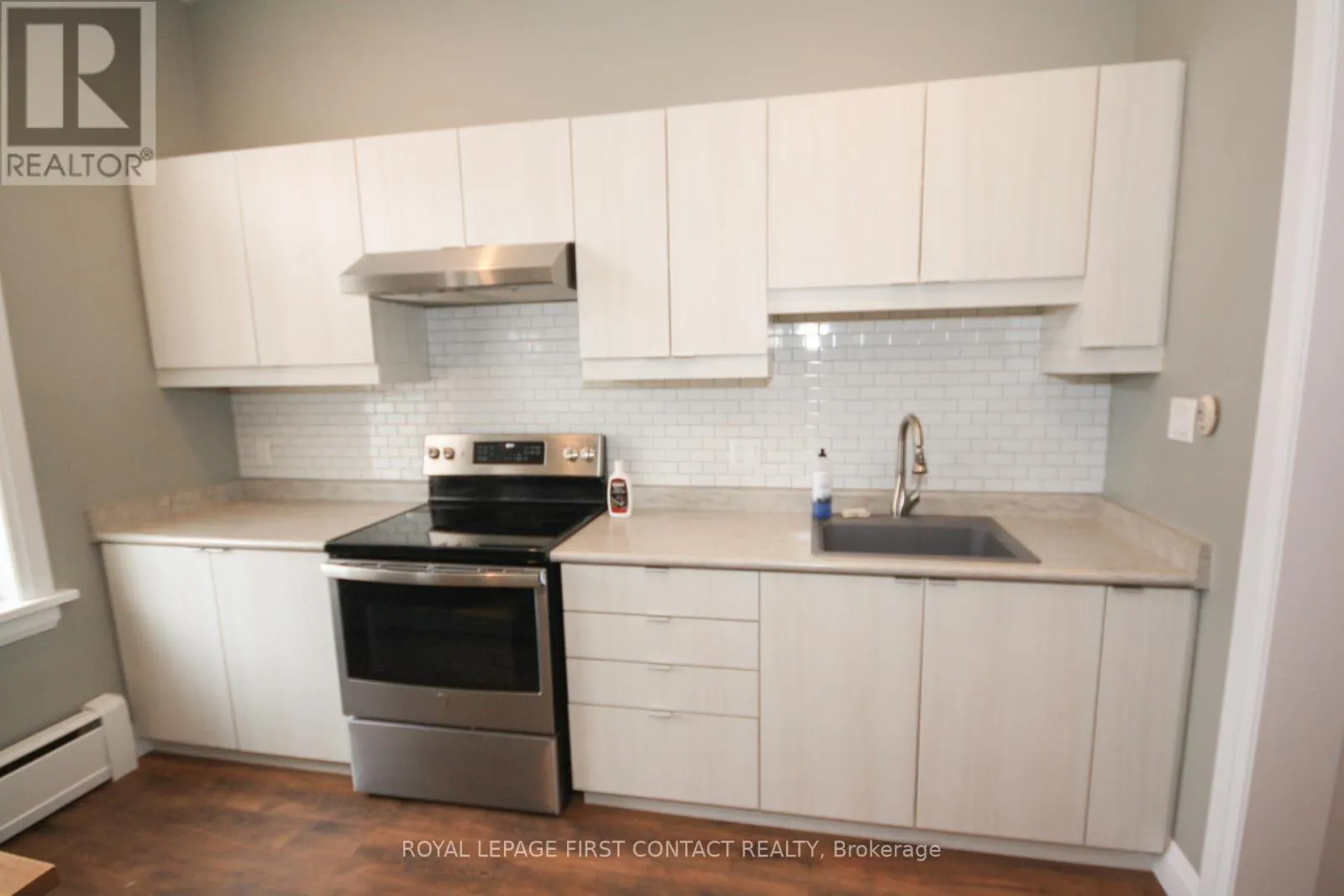 Cross Streets: Peter/Mississaga. ** Directions: Peter between Mississauga and Colbourne. Discover modern urban living in this beautifully renovated 1-bedroom loft apartment, ideally situated in the vibrant core of Orillia's Arts District. This bright and airy unit showcases a thoughtfully updated interior with contemporary finishes throughout featuring wide-plank flooring, fresh neutral tones, recessed lighting, and elegant trim details that complement the home's historic charm. The spacious kitchen offers sleek cabinetry, a subway tile backsplash, stainless steel appliances, and an extended butcher-block island perfect for entertaining or casual dining. The open-concept layout flows into a cozy living area with oversized windows and a dramatic feature wall, ideal for showcasing art or your home theatre setup. Enjoy the convenience of a stylish 3-piece bath with modern fixtures, a glass-enclosed shower, and floating vanity, along with a generous walk-in closet and in-unit climate control. Step outside and immerse yourself in the cultural energy of downtown Orillia just steps from shops, cafés, live music venues, the Orillia Museum of Art & History, and the beloved Mariposa Market.Low-maintenance, turn-key, and perfectly positioned for creatives, professionals, and culture lovers alike this is a rare opportunity to live where art and community meet. (id:27476)