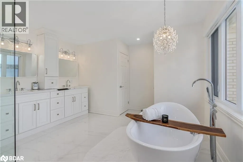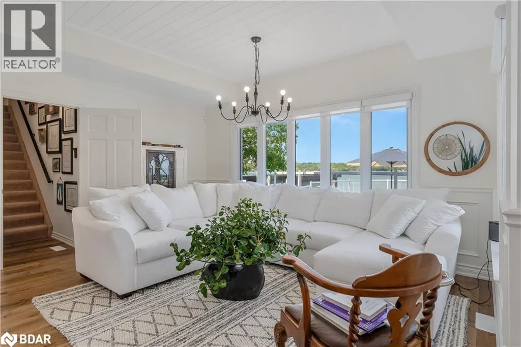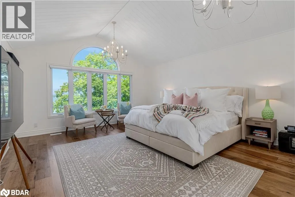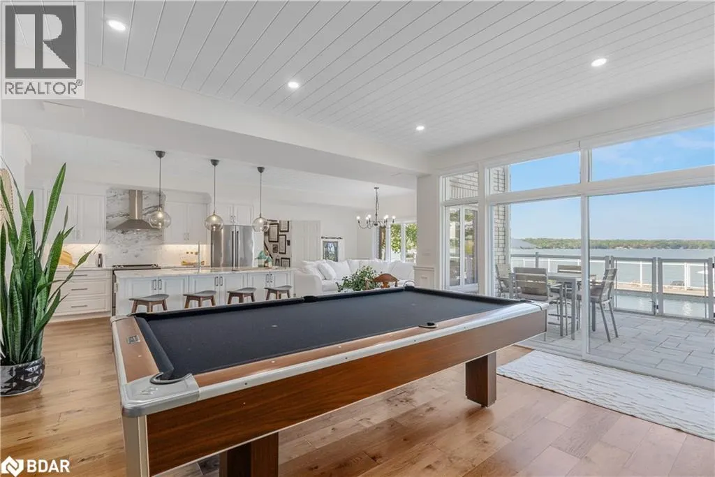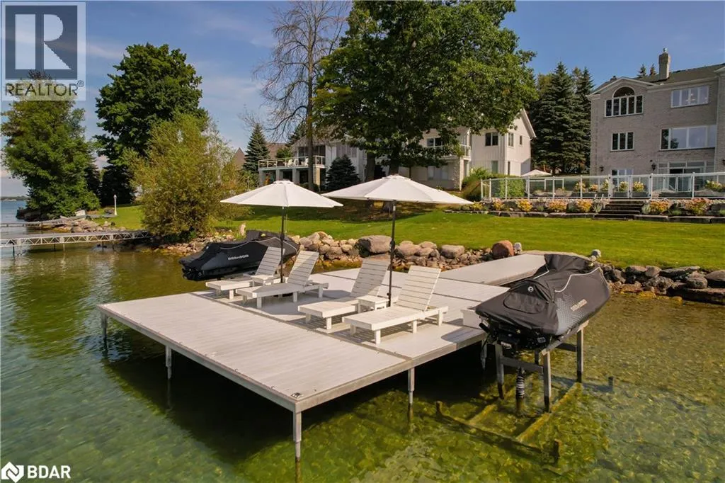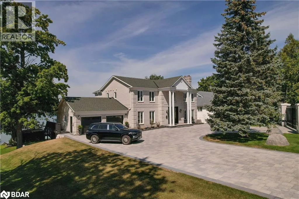 Forest Ave N to Brewery Ln Welcome to 376 Brewery Lane, a stunning luxury waterfront home situated on one of Orilliaâs finest streets. This exceptional property offers 104 feet of prime Lake Couchiching frontage on a beautifully landscaped half-acre lot with western exposureâperfect for soaking in spectacular sunsets and views of downtown Orillia. Completely renovated from top to bottom, this home offers nearly 5400 square feet of high-end living space, featuring 5 bedrooms and 4.5 bathrooms. The gourmet kitchen is a showstopper with two impressive 10-foot islands, granite countertops, and premium appliances from WOLF, SUBZERO, and Thermador. The open-concept main floor boasts large windows that frame lake views, a cozy gas fireplace in the living room, and a walkout to an expansive deckâideal for both relaxation and entertaining. The upper level features 3 spacious bedrooms, each with its own ensuite, and a laundry room for added convenience. The primary suite is a true retreat with vaulted ceilings, a grand walk-in closet complete with built-ins and an island, and a spa-like ensuite featuring a walk-in shower, soaking tub, heated floors, and double vanity. The finished walkout basement offers 9-foot ceilings, a second full kitchen, separate laundry, and a private entrance, making it perfect for extended family or guests. Outside, the property truly shines with a heated saltwater pool surrounded by interlock patios, multiple seating areas, and a large dock complete with sea doo lifts. The private stone path leads to a hard-packed lakefront, perfect for enjoying summer days by the water. Double gated entries and a heated interlock driveway provide both privacy and convenience. This rare waterfront gem is located at the end of a quiet court, offering tranquility and luxury living. (id:27476)