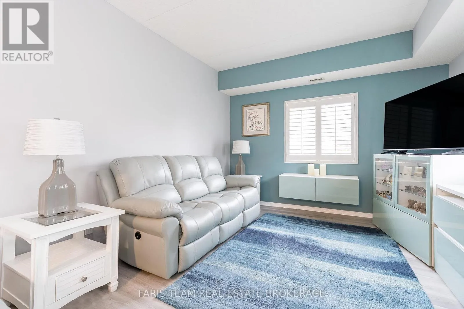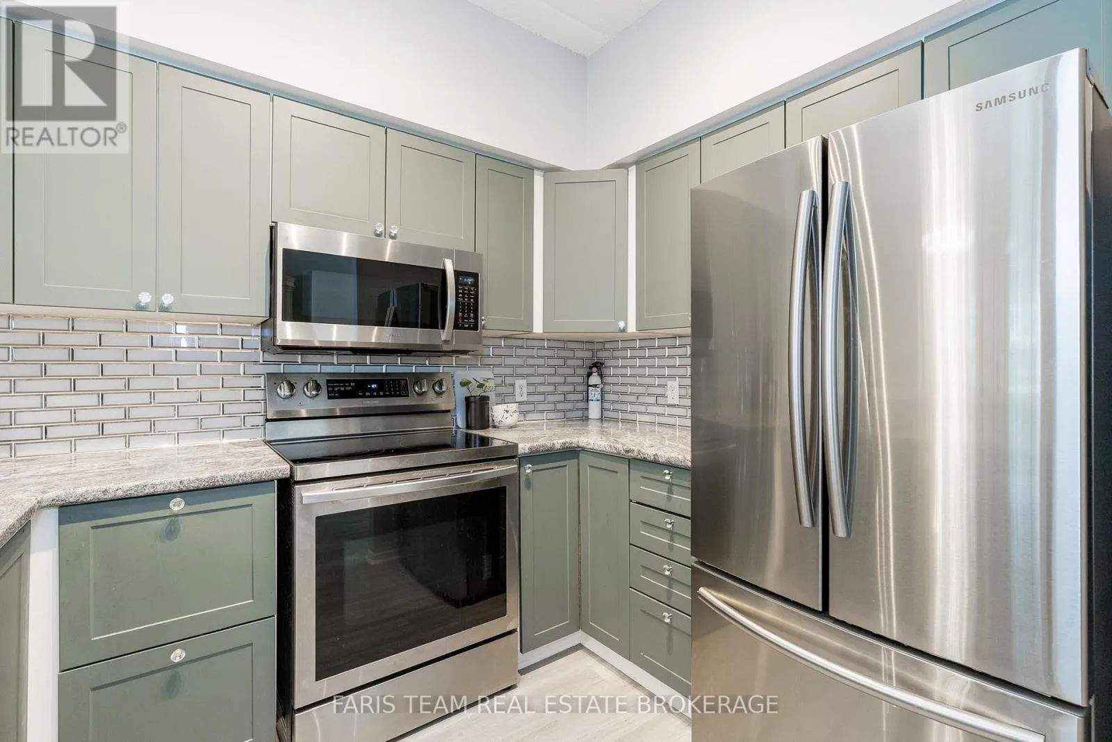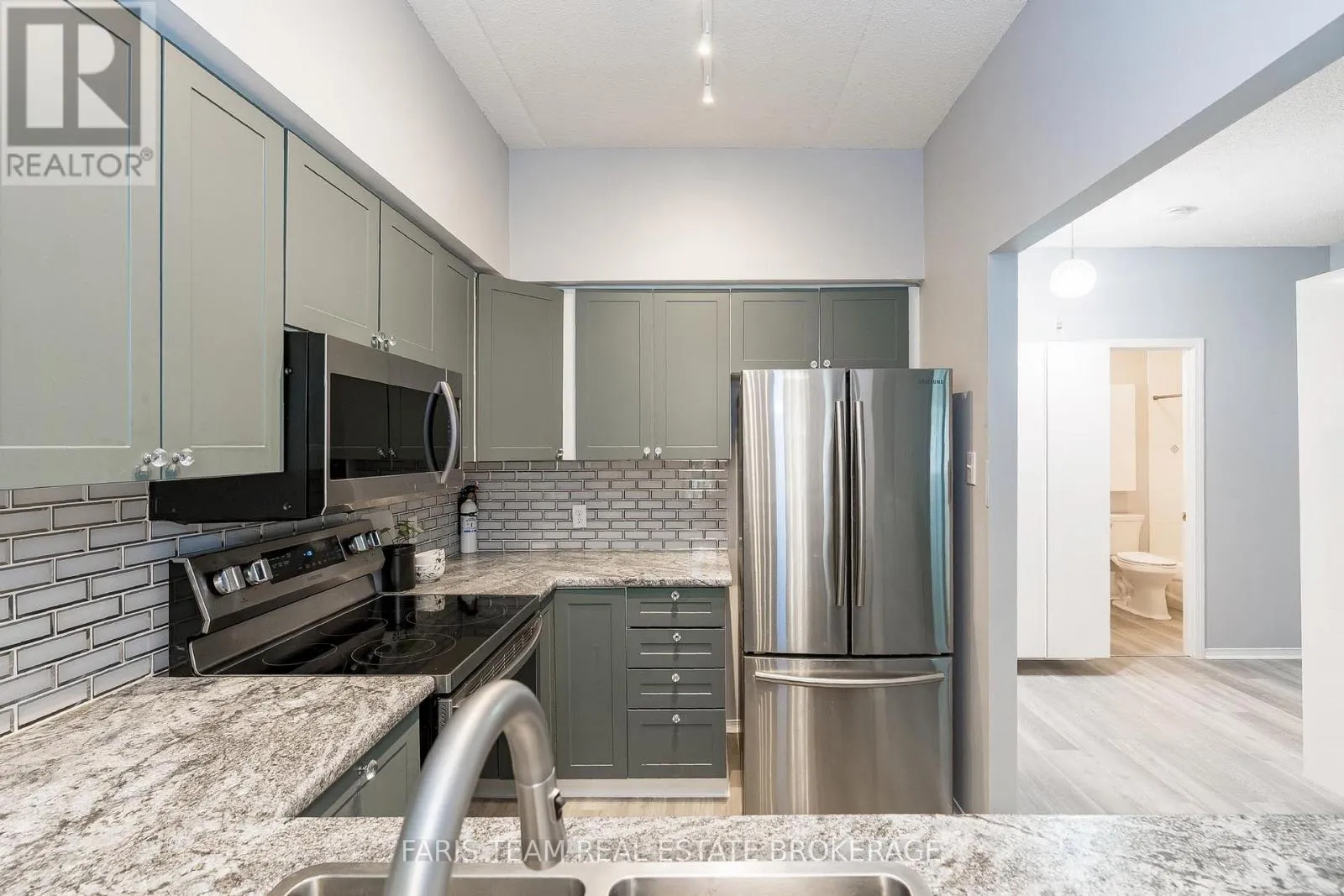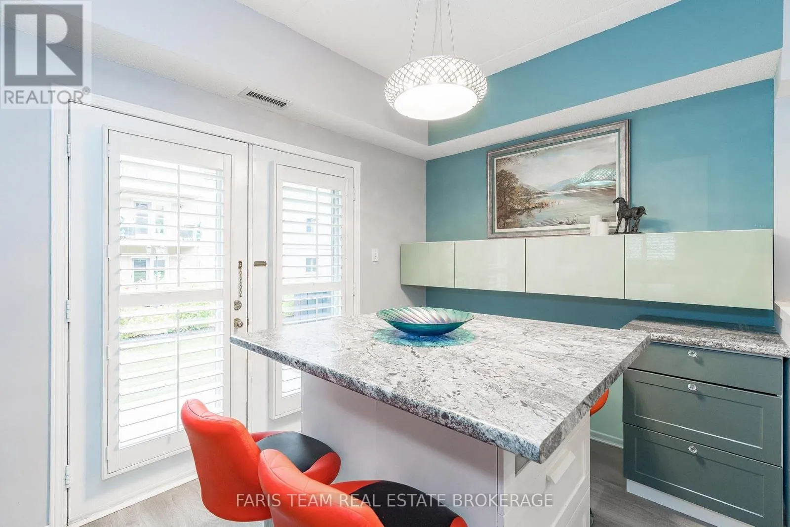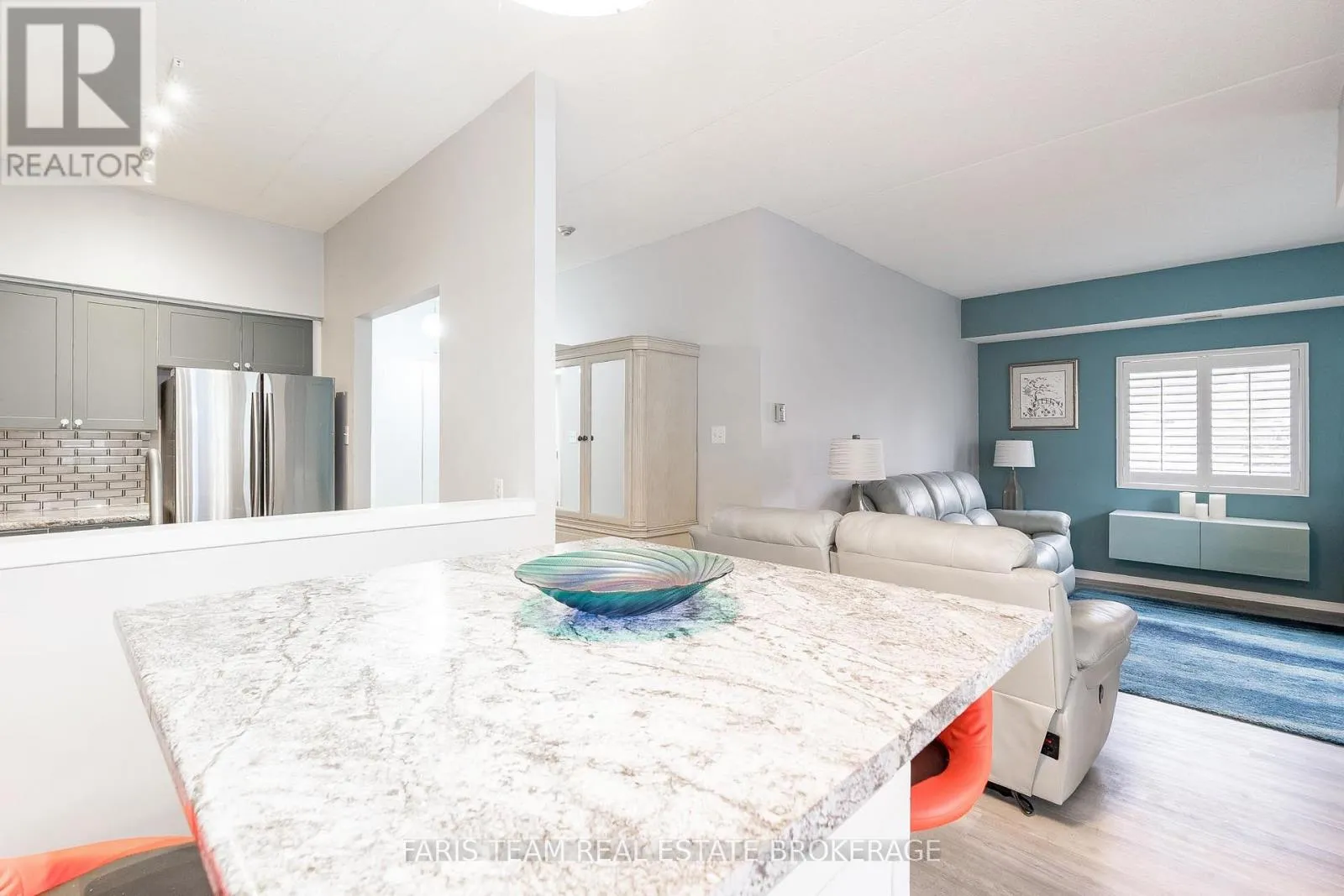 Gill St/Bond St Top 5 Reasons You Will Love This Condo: 1) This stylish ground-level end unit presents modern comfort and exceptional convenience with no stairs, no hallway noise, and a private patio for effortless indoor-outdoor living 2) Soaring ceilings and thoughtful updates throughout, including new lighting, flooring, and a backsplash, creating a bright, contemporary atmosphere that feels both functional and inviting 3) Enjoy the ease of in-suite laundry, dedicated parking, and an innovative layout designed to maximize every square foot 4) Perfectly situated just steps from Lake Couchiching, Lake Simcoe, downtown Orillia, and a variety of restaurants and shops, everything you need is right at your doorstep 5) With quick access to Highway 11, commuting is effortless, whether you're heading to work, the cottage, or beyond. 817 fin.sq.ft. (id:27476)