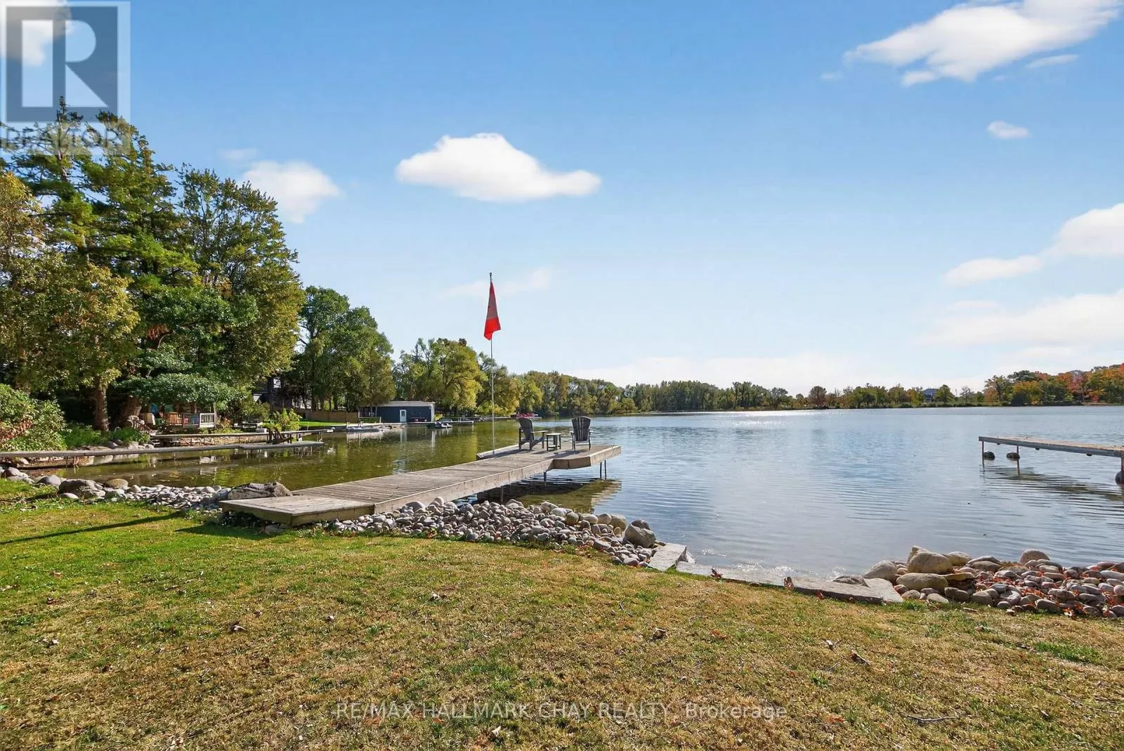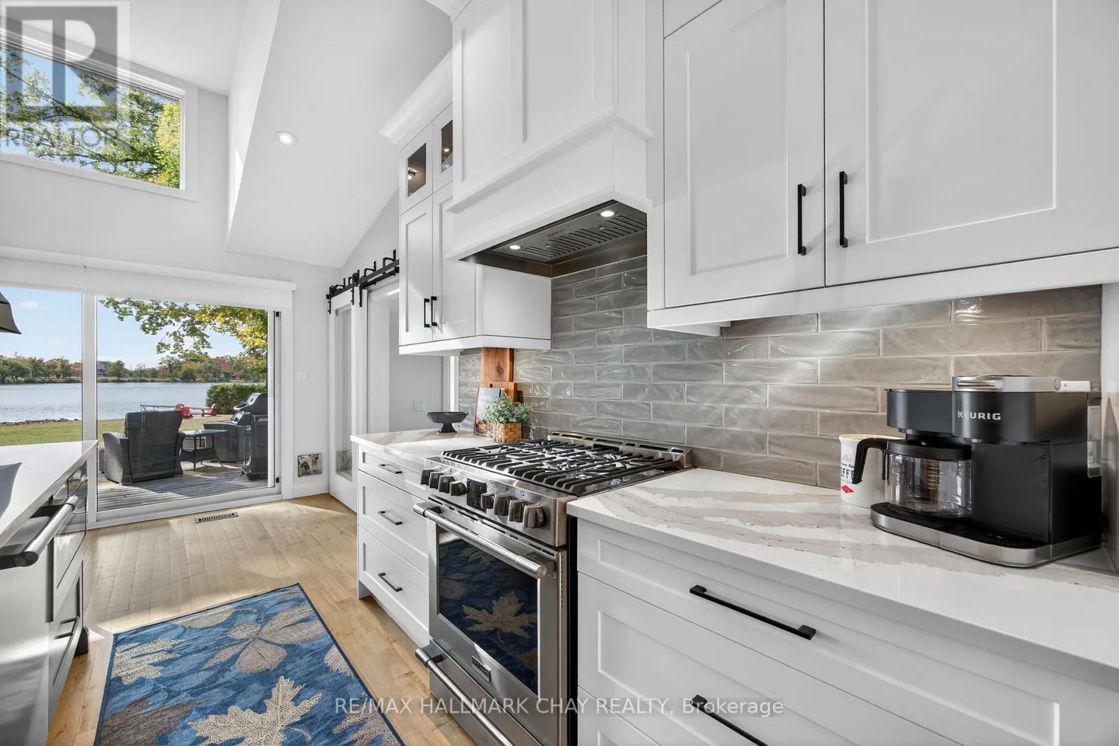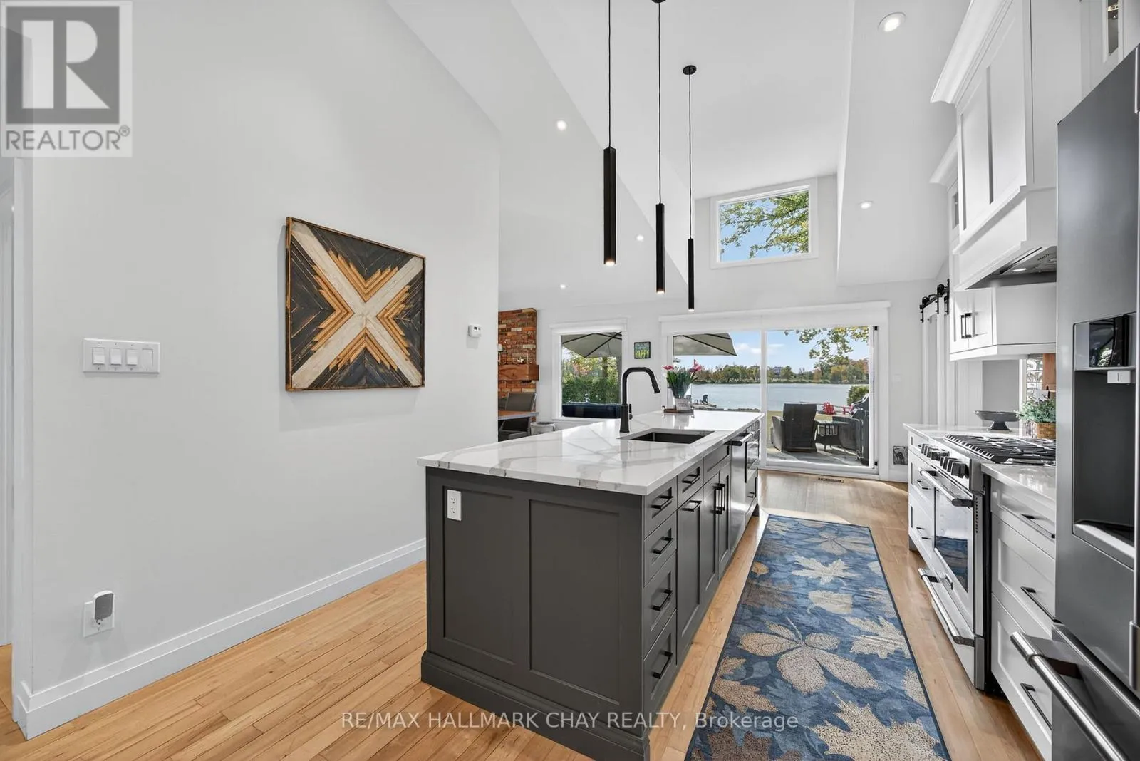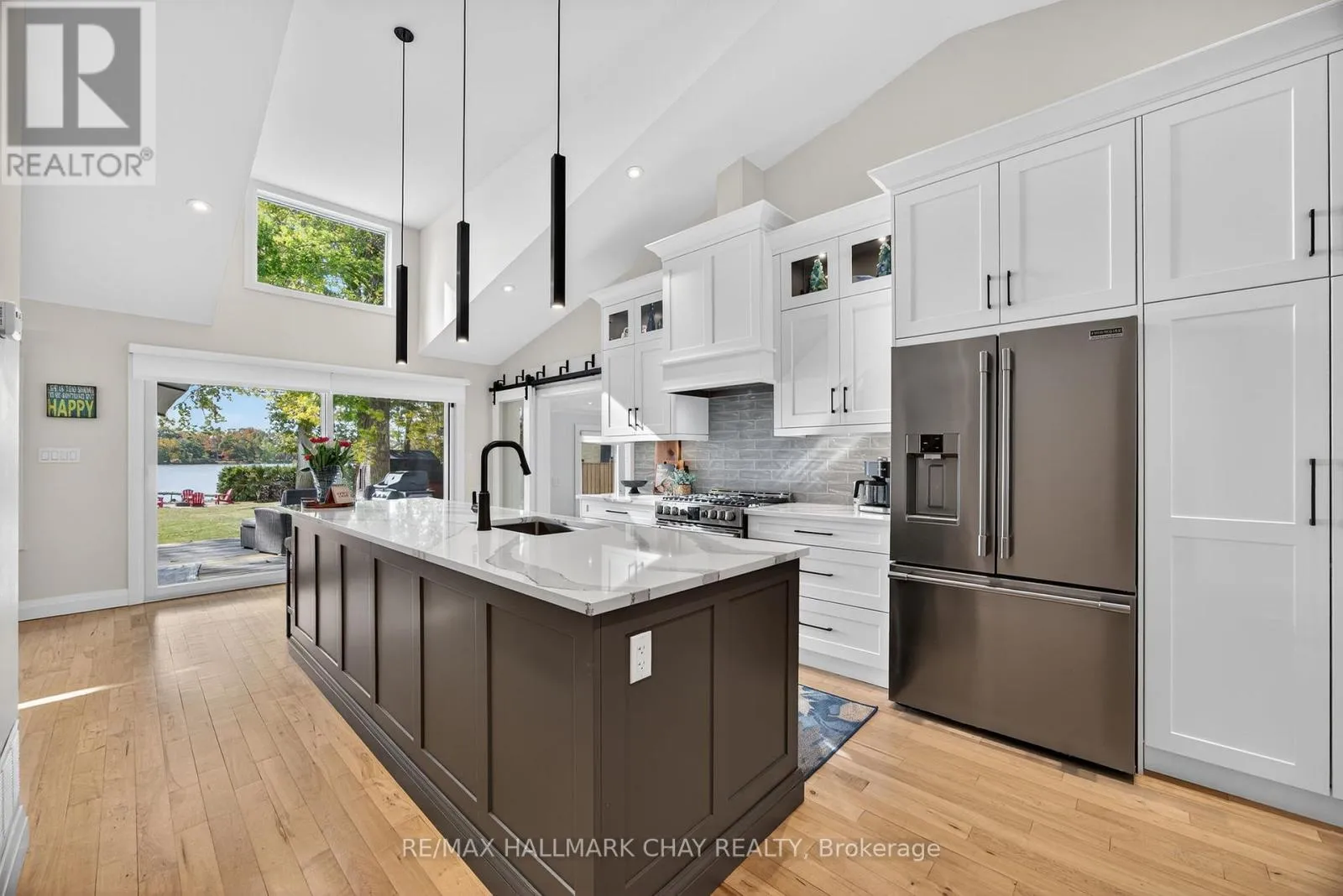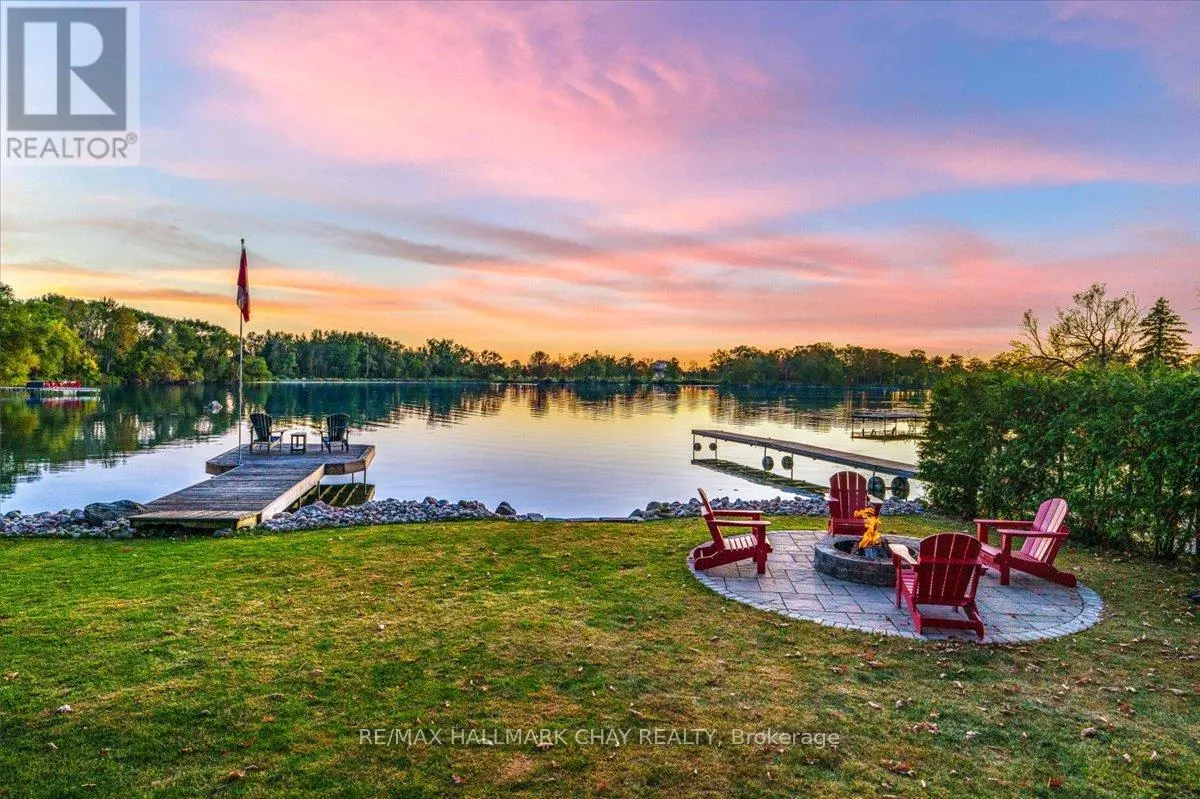 Atherly Rd / Couchiching Point Rd / Broadview Ave Waterfront Estate Living at Its Finest! Rarely Offered West-Facing Lakefront in Coveted Couchiching Point! This remarkable 0.43-acre estate lot captures the very essence of waterfront luxury mature trees framing the horizon, a crystal-clear sandy shoreline, and panoramic sunsets that paint the lake in gold each evening. From your private dock, cruise seamlessly through Lake Couchiching into Lake Simcoe or Georgian Bay the ultimate in four-season waterfront living.Completely re-imagined by Brennan Construction, this professionally renovated masterpiece offers over 2,600 sq. ft. of refined space where craftsmanship meets modern elegance. Vaulted ceilings, expansive windows, and an open-flowing layout immerse every room in natural light and lake views. The chefs kitchen showcases imported Cambria quartz, bespoke cabinetry, and premium appliances, flowing into a dining area with built-in serving cabinetry and a Napoleon gas fireplace.The sky-lit loft overlooks the lake, while the great room centres around a stunning stone fireplace. The primary suite is a true retreat with vaulted ceilings, a spa-inspired ensuite with heated floors, and a walk-in closet. A main-floor guest suite offers flexibility, complemented by a designer laundry with custom cabinetry and Dekton countertops.Outdoors, the manicured grounds feature new landscaping, a stone terrace, fire pit, and irrigation system ideal for family gatherings, children at play, or quiet moments by the water. Steps to Lightfoot Trail, Tudhope Park, marinas, and downtown Orillia, this location blends tranquility with urban convenience. With upgraded systems, triple-pane windows, security, and a heated garage, every detail ensures turn-key, worry-free living. This is more than a home its a statement in luxury waterfront lifestyle, a rare opportunity where every sunset reminds you why homes like this are truly one-of-a-kind! (id:27476)