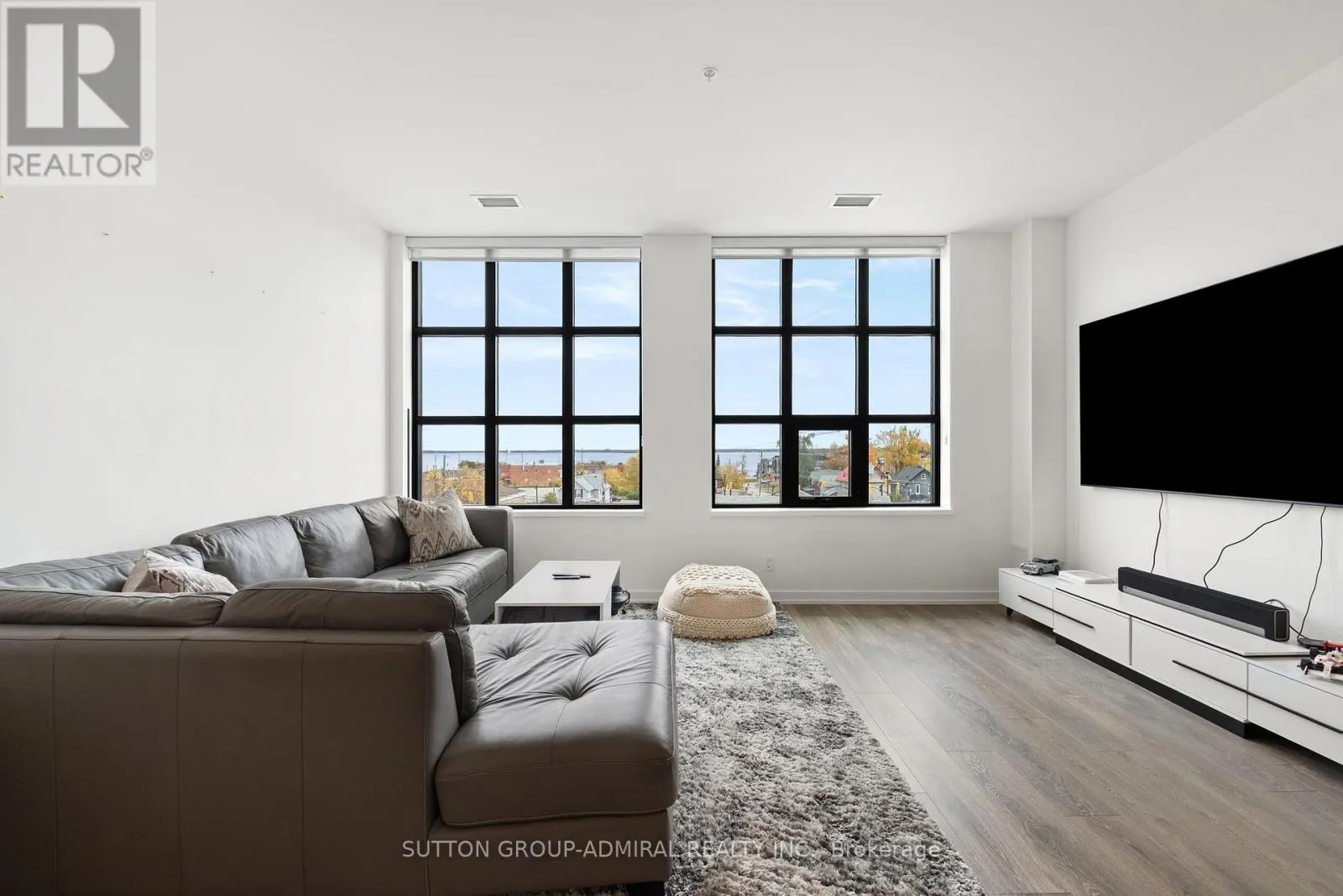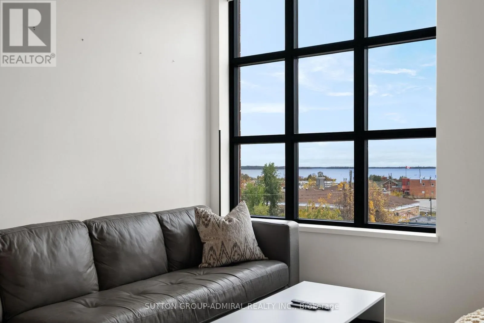 Matchedash and Mississauga Lakeview Loft Living in the Heart of Orillia WITH DIRECT WATER VIEWS Welcome to Matchedash Lofts, where modern design meets downtown convenience. This bright and airy third-floor 950 sq ft residence with souring high ceilings and floor-to-ceiling windows and a Juliette balcony with picturesque views of Lake Couchiching and the Orillia skyline. The functional layout includes a spacious one-bedroom plus den and two full bathrooms. The open living and dining area flows seamlessly into a contemporary kitchen appointed with stone counters, stainless steel appliances, tile backsplash, and generous storage. The den offers flexibility as a home office or guest room, while the primary suite provides a walk-in closet and a private ensuite with elegant finishes. Residents enjoy access to a rooftop terrace showcasing panoramic lake views, along with secure underground parking and a dedicated storage locker. Perfectly situated within walking distance to shops, restaurants, the waterfront, and scenic trails, this residence delivers a refined blend of comfort, location, and lifestyle. (id:27476)