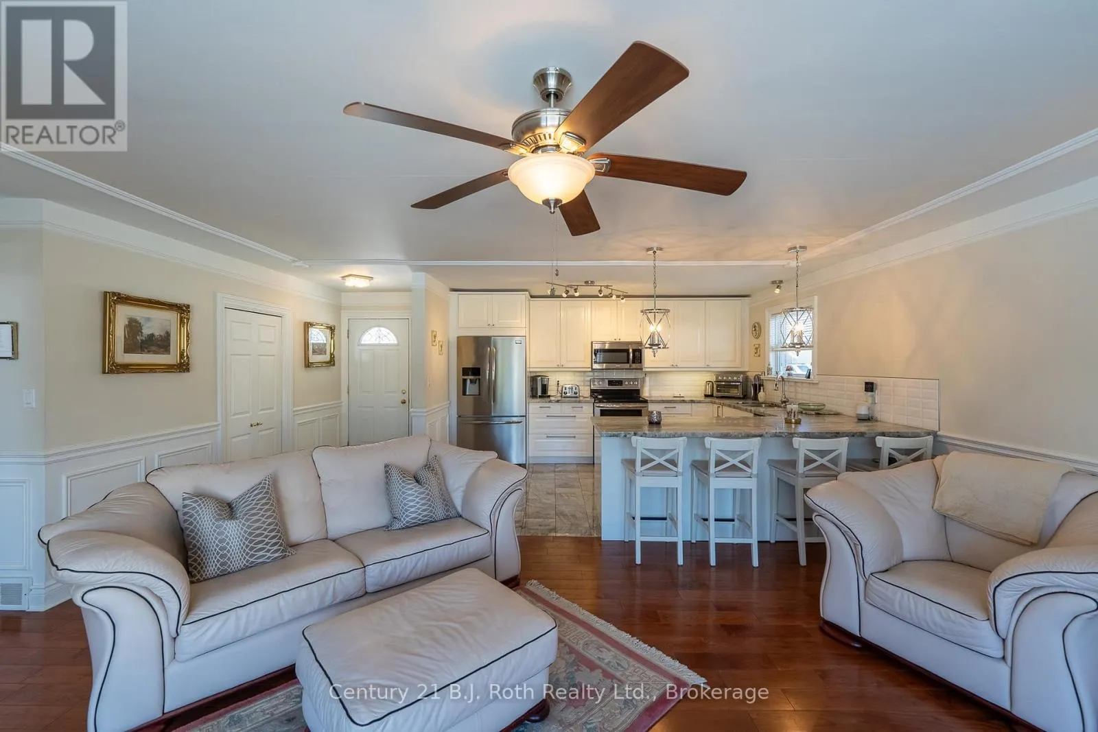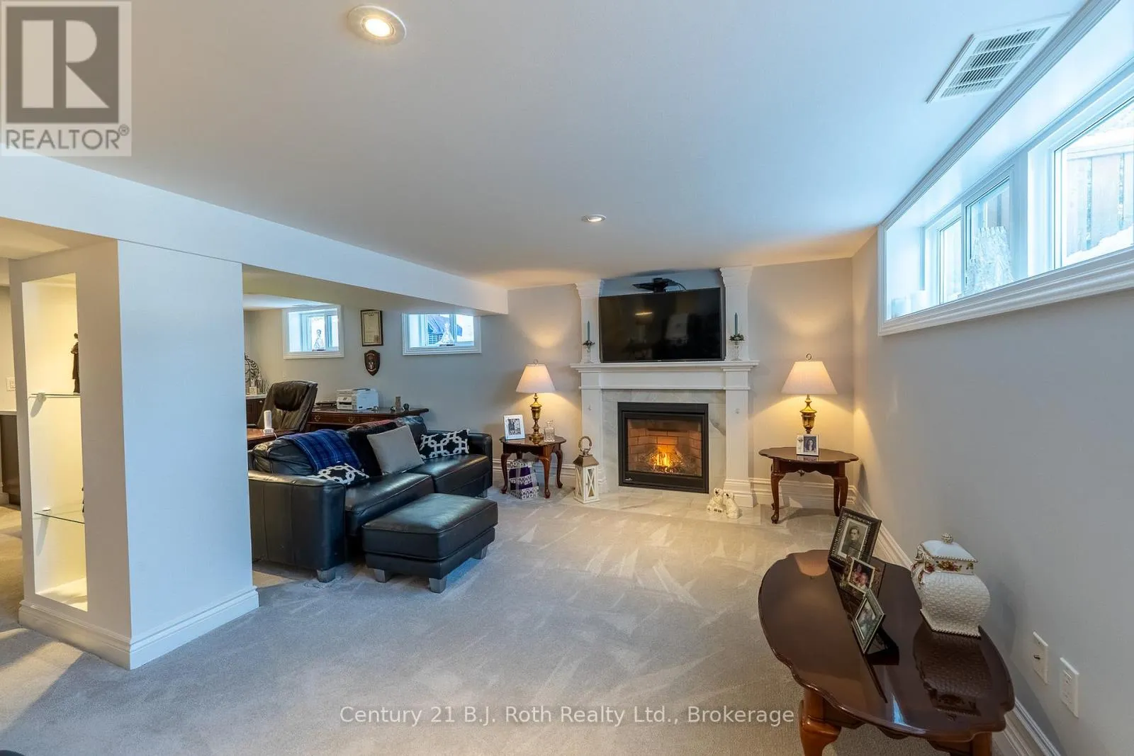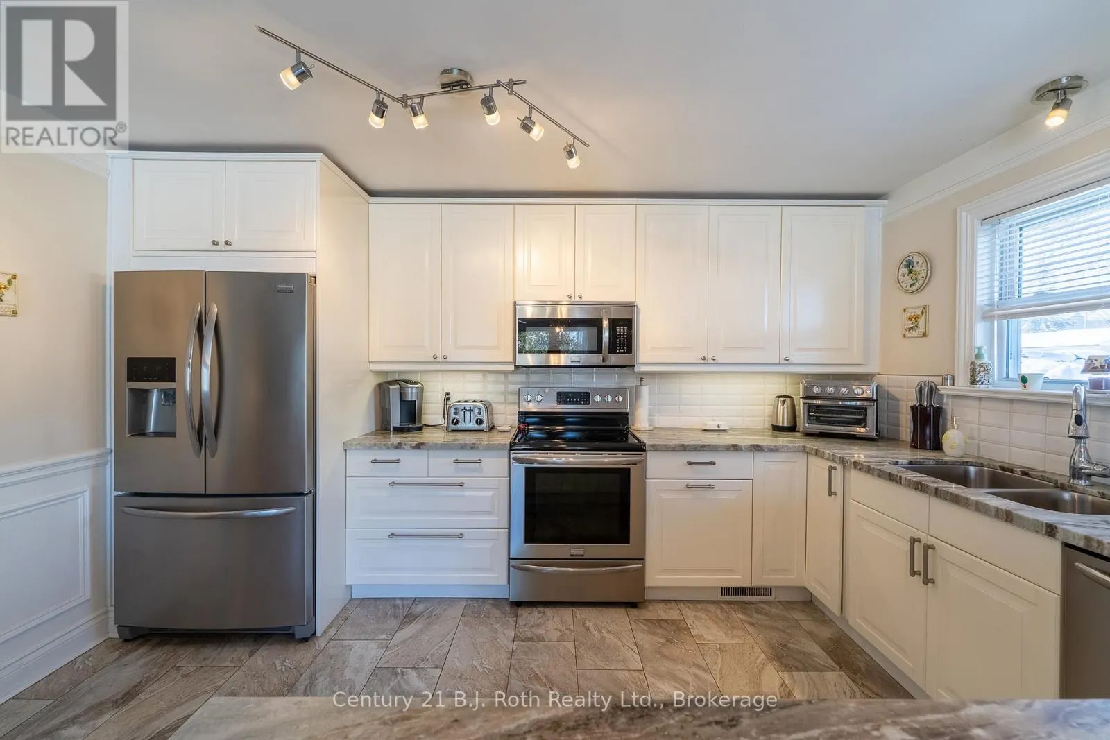 Cross Streets: Fittons Rd E / Highland Ave. ** Directions: Fittons Road E to Highland Ave. Beautifully maintained 3-bedroom brick bungalow situated on a meticulously landscaped 68' x 125' lot in the highly desirable North Ward neighbourhood. From the moment you enter, you'll appreciate the bright, open-concept main floor designed for comfortable everyday living and entertaining. The spacious living area features gunstock hardwood flooring, custom trim and large picture windows that flood the space with natural light and offer views of the private backyard. The updated kitchen is both functional and stylish, complete with ample cabinetry, breakfast bar seating, porcelain tile flooring and stainless steel appliances. Three bedrooms on the main floor feature original hardwood flooring and are served by an updated 4-piece bathroom. The fully finished basement offers exceptional additional living space and excellent potential for in-law or multi-generational living with its separate exterior access. Renovated to the exterior walls, waterproofed and foam insulated, this level provides a warm, dry and comfortable environment year-round. The lower level includes a large family room with gas fireplace and custom surround, wet bar, recessed lighting, office or games area, and a spacious, beautifully updated laundry room. The luxurious lower-level 4-piece bathroom features a walk-in tiled shower, in-floor heating and double vanity. Extensively renovated over the past 10 years, this home offers peace of mind with major upgrades including electrical panel, plumbing, on-demand hot water system, gas furnace, central air conditioning and updated ductwork, along with quality custom trim throughout. Outdoor living is equally impressive with updated decking, a 14' x 12' gazebo, covered BBQ area and unistone patio-perfect for relaxing or entertaining. Ideally located within walking distance to Lake Couchiching and downtown Orillia, and close to shopping, golf, pharmacy and everyday amenities. Single Garage & widened driveway w/updated walkway to front door. (id:27476)