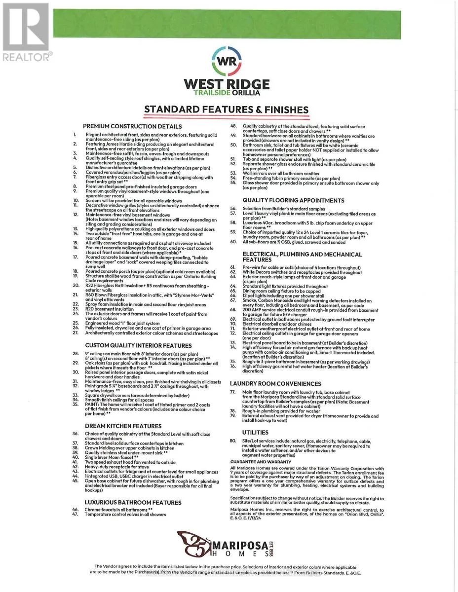 Cross Streets: Bass Lake Sideroad and Orion Blvd. ** Directions: Hwy 11 N to Hwy 12 W to Atlantis Dr. Right on Bass Lake Sr, House on the left at the corner of Bass Lake Sr and Orion Blvd. Located in Orillia's highly desirable West Ridge community, this brand-new home offers an exceptional opportunity to enjoy modern living in a prime location just minutes from a full range of amenities. From the moment you arrive the home's curb appeal stands out. Professionally landscaped grounds are complemented by an in-ground sprinkler system providing convenience for todays busy schedules. The exterior façades stone and Hardie board siding set the tone for the high level of finish and attention to detail found inside. The main level features a well-planned layout ideal for both daily living and entertaining. At the heart of the home the kitchen showcases ample cabinetry, quartz countertop and backsplash, and a 9' island perfect for gatherings. High end wide plank engineered hardwood floors seamlessly connect the dining and living area overlooking the 320 square foot covered deck in the backyard. Upstairs, the home offers four spacious bedrooms providing flexibility for families, guests, or home office needs. The primary bedroom serves as a private retreat complete with a beautifully finished ensuite that reflects the home's elevated standard of design. The additional bedrooms are generously sized and share a stylish full bathroom, completing the home's 2.5-bathroom layout. Complete with Tarion Warranty, this forever home is best appreciated in person. Schedule your private showing and experience everything this exceptional home has to offer. (id:27476)