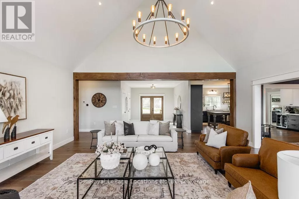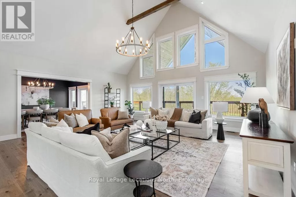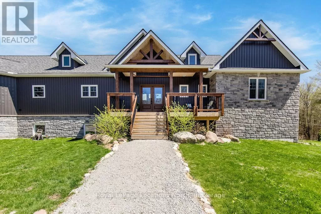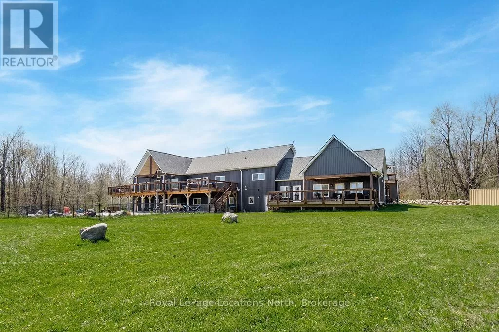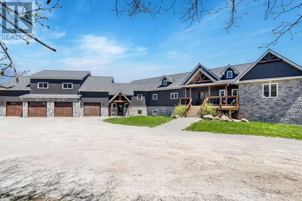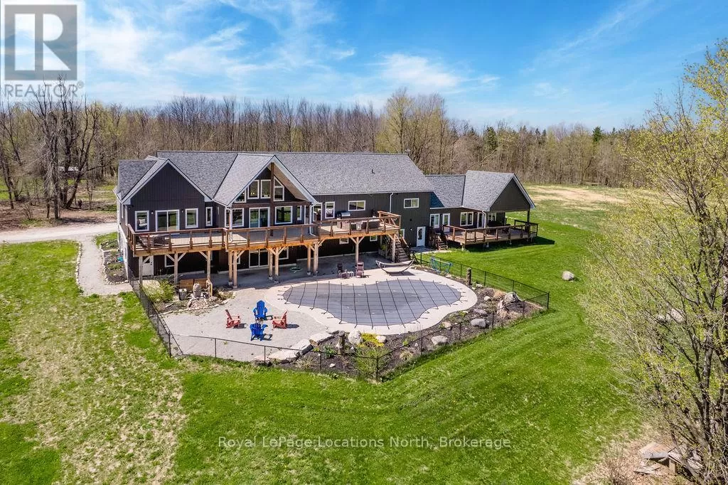 Moonstone Rd E/County Rd 19/Line 8 N FAMILY COMPOUND - Built in 2022, this expansive 9,000 sq ft home on 100 acres is perfect for multi-gen living or rental income. The property features a custom main house, a legal ranch-style apartment w/private laundry + a loft above a heated 4-car garage. As you enter the large foyer, you're greeted with panoramic views of the property through floor-to-ceiling windows. The main house features 3+2 bedrooms, 3 full and 2 half baths, 9' ceilings, and engineered hardwood on the main floor. A grand living room impresses with 19' vaulted ceilings and access to a covered deck overlooking the pool. The spacious kitchen and formal dining room are ideal for gatherings, boasting quartz countertops, a double farmhouse sink, premium stainless steel appliances and a large custom island. The primary suite offers a private retreat with deck access, dual walk-in closets, and a luxurious 5-piece ensuite featuring a soaker tub, walk-in shower, dual-sink quartz vanity, and private water closet. The expansive walk-out basement includes a recreation room, two additional bedrooms, and a salon with a powder room, perfect for a home business or studio complemented by durable vinyl plank flooring. The separate legal accessory apartment provides a modern living space with vaulted ceilings, open-concept design, quartz kitchen countertops, a private covered deck, and dedicated laundry, ideal for family or as an income opportunity. The loft features a bedroom, 4-piece bath, kitchenette, and private deck, suitable for guests or extended family. The garage boasts 4 bays with 10 and 14 ceilings, perfect for car enthusiasts or workshop space. Outside, the 100 acre property supports many activities, hiking, hobby farming, or a private nature retreat. Enjoy a private outdoor oasis w/ a heated 20' x 40' saltwater pool, multiple decks, and lush green space. For more details, please contact us directly. (id:27476)