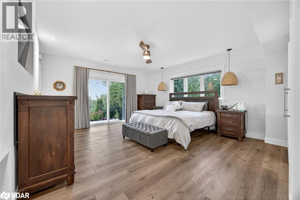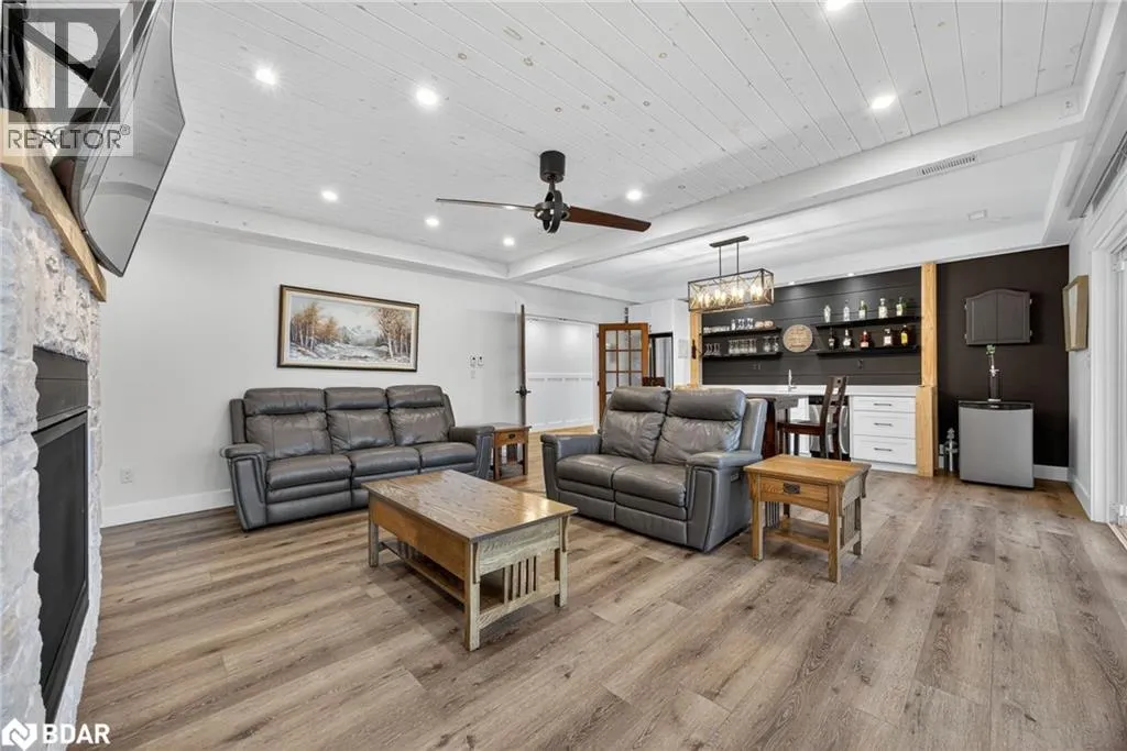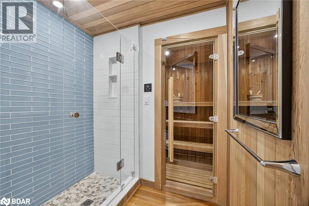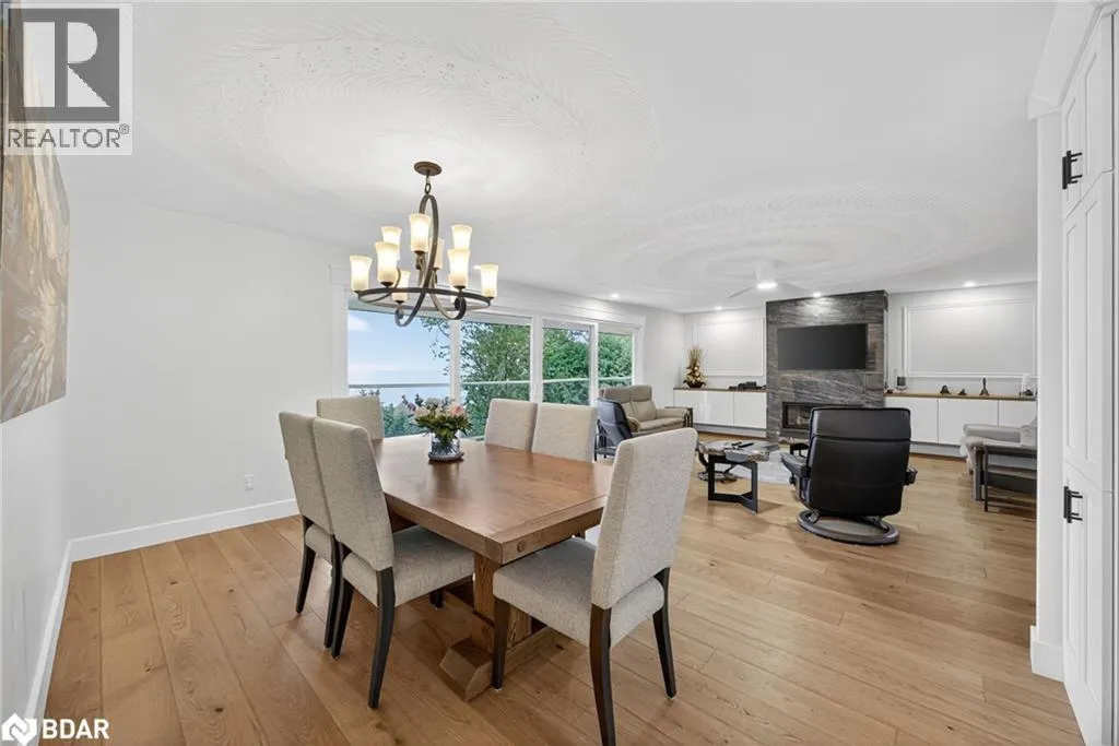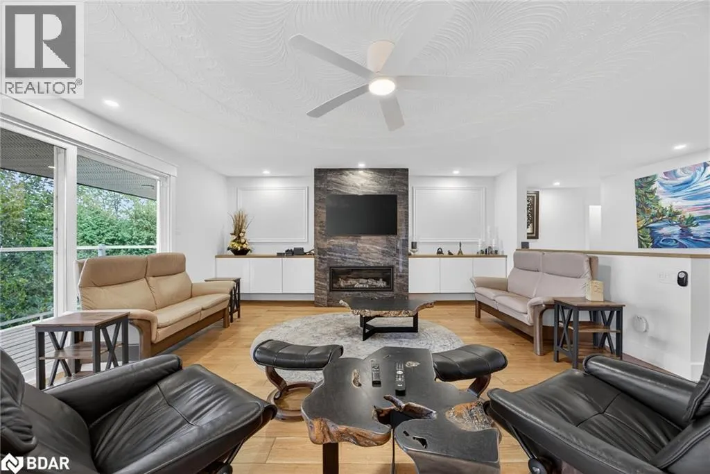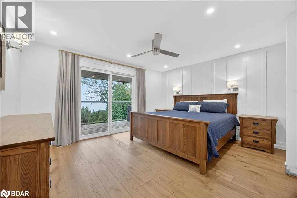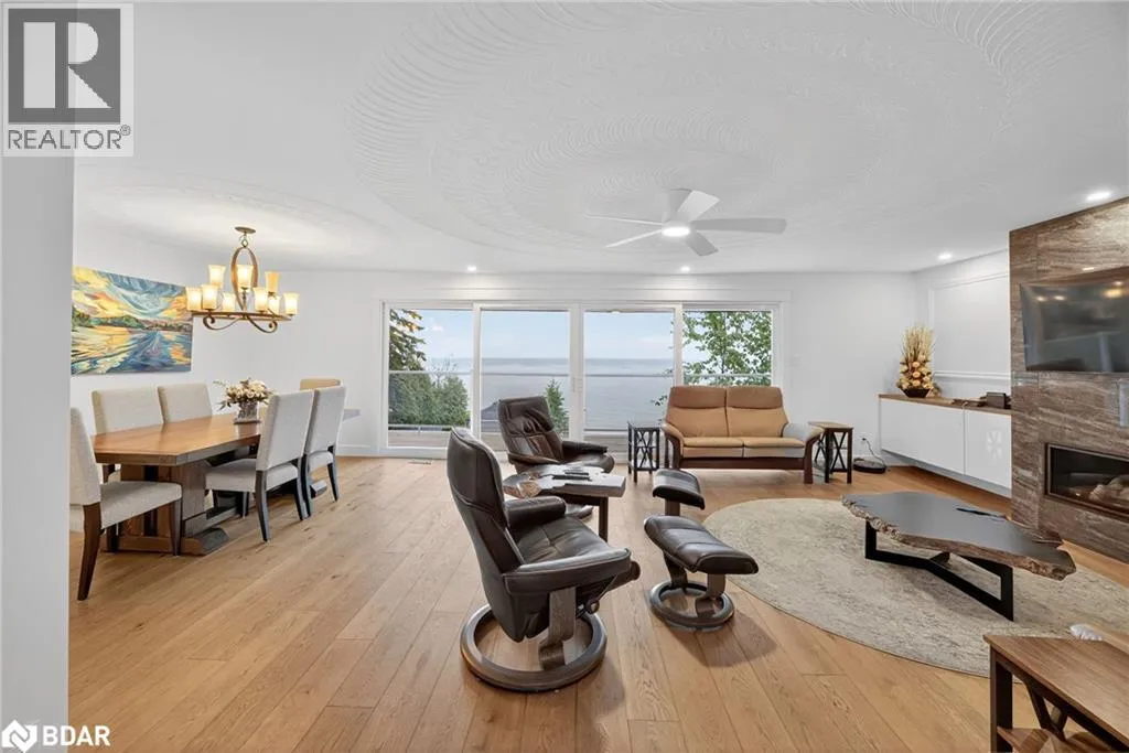 Hwy 11 to 14th Line South, left on Lakeshore to Eight Mile Point Road On a quiet, tree-lined crescent, this turnkey brick bungalow offers an exceptional lifestyle on one of Lake Simcoeâs most sought-after stretches of shoreline. 5 bedrooms, 4 bathrooms & a beautifully renovated bunkie above the single-slip boathouse, lakeside living at its finest.Professionally landscaped front and back with lush perennials, a full irrigation system. Engineered hardwood throughout the main floor. Kitchen with quartz countertops, Thermador WiFi-enabled gas range, pot filler & premium finishes. Living room with gas fireplace & dining area with walkout to a sprawling 75-ft deck (gas BBQ hookup)overlooking the lake - perfect for entertaining. Main floor primary features a luxurious ensuite with heated floors, large walk-in shower, Bluetooth in-wall speaker, in-suite laundry hook-up & a private walkout with water views. Two additional main floor bedrooms share a 4-piece bath.Recreation room with fireplace & walkout to a private hot tub area overlooking the water. Wet bar with fridge and dishwasher. 2nd primary with fireplace, built-ins, water views, walkout access & an opulent ensuite featuring a soaker tub on a solid walnut base, heated floors, double vanity & glass shower. Additional 5th bedroom, 2-piece powder room, laundry room, 6-person sauna with separate shower & mudroom with built-in dog bath. Renovated bunkie above the 26' x 12' boathouse, complete with kitchen & 3-piece bath â ideal for guests who won't want to leaveâ. Marine railway to the boathouse. Waterside 10' x 19' deck, concrete stairs, break wall & 100â of clean, hard-bottom pebble shoreline with approximately 5 feet of depth off the dock with hard bottom sandâ perfect for swimming & water activities. Association dues include access to 62 acres of private parkland with nature trails for walking, cross-country skiing, etc & two waterfront tennis courts. Minutes to the Simcoe Rail Trail for biking, running, walking, or snowmobiling. Close to Orillia for amenities. 1 hour to the GTA. (id:27476)