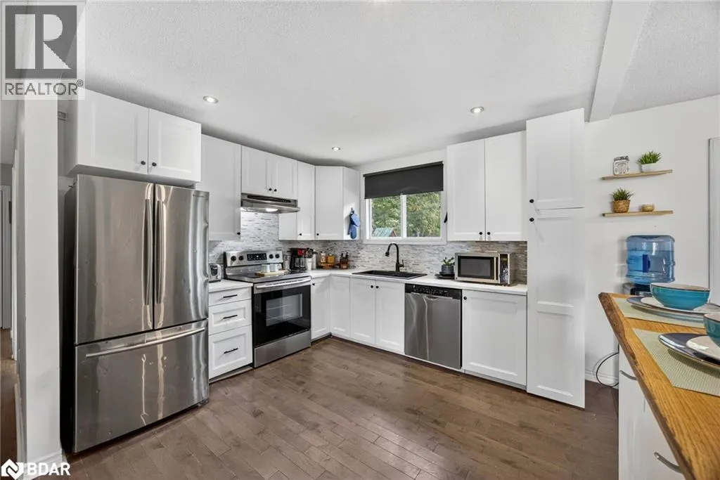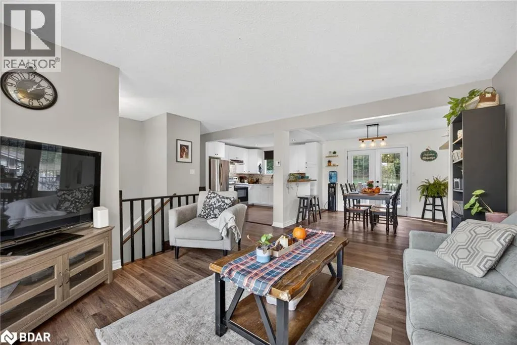 Highway 12 to Conder Dr Welcome to 10 Conder Drive, a charming 3+1 bedroom raised bungalow located on a quiet cul-de-sac just minutes west of Orillia. This property offers the perfect blend of serene country living and convenient access to amenities in Orillia, Coldwater, and Barrie via the 400 extension. This home sits on a gorgeous 0.947-acre, tree-lined lot, providing a private, park-like backyard oasis. The outdoor space features a pergola sitting area, a fire pit, a woodshed, and even a treehouse with a zipline for the kids! Additionally, there's a detached workshop/garage (12'6 Ã 24'5) with hydro. Step inside, and the main floor features a bright living room, an updated kitchen with hardwood flooring, and a dining room with a walkout to a BBQ deck. You'll find three cozy bedrooms and an updated four-piece bath on this level. The fully finished basement offers a huge family room with tile flooring, a woodstove, and abundant natural light from numerous windows. It also includes a beautifully finished laundry room, a fourth bedroom, and a recently added three-piece bath with a stand-up shower. This is an ideal home to start raising your family. (id:27476)