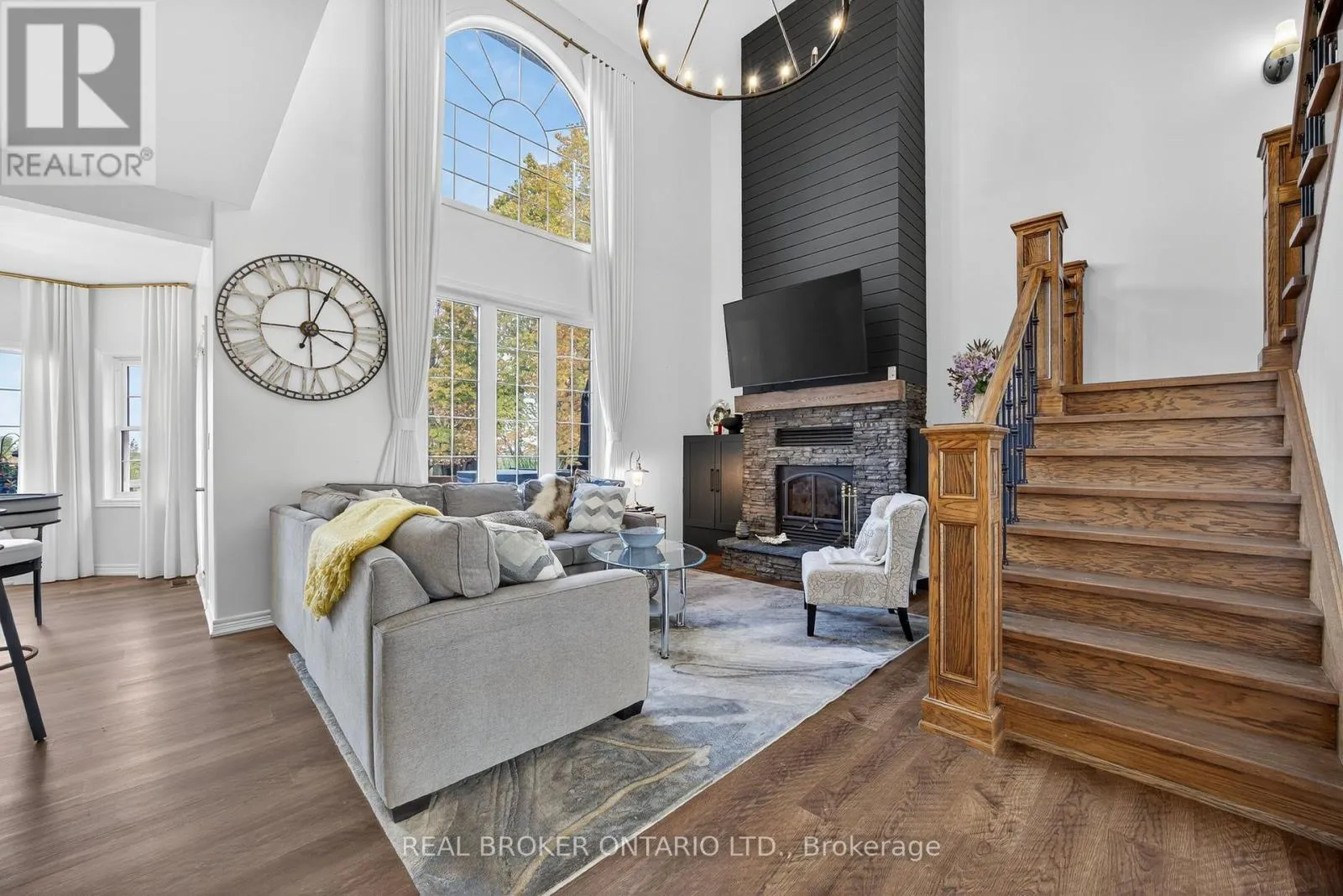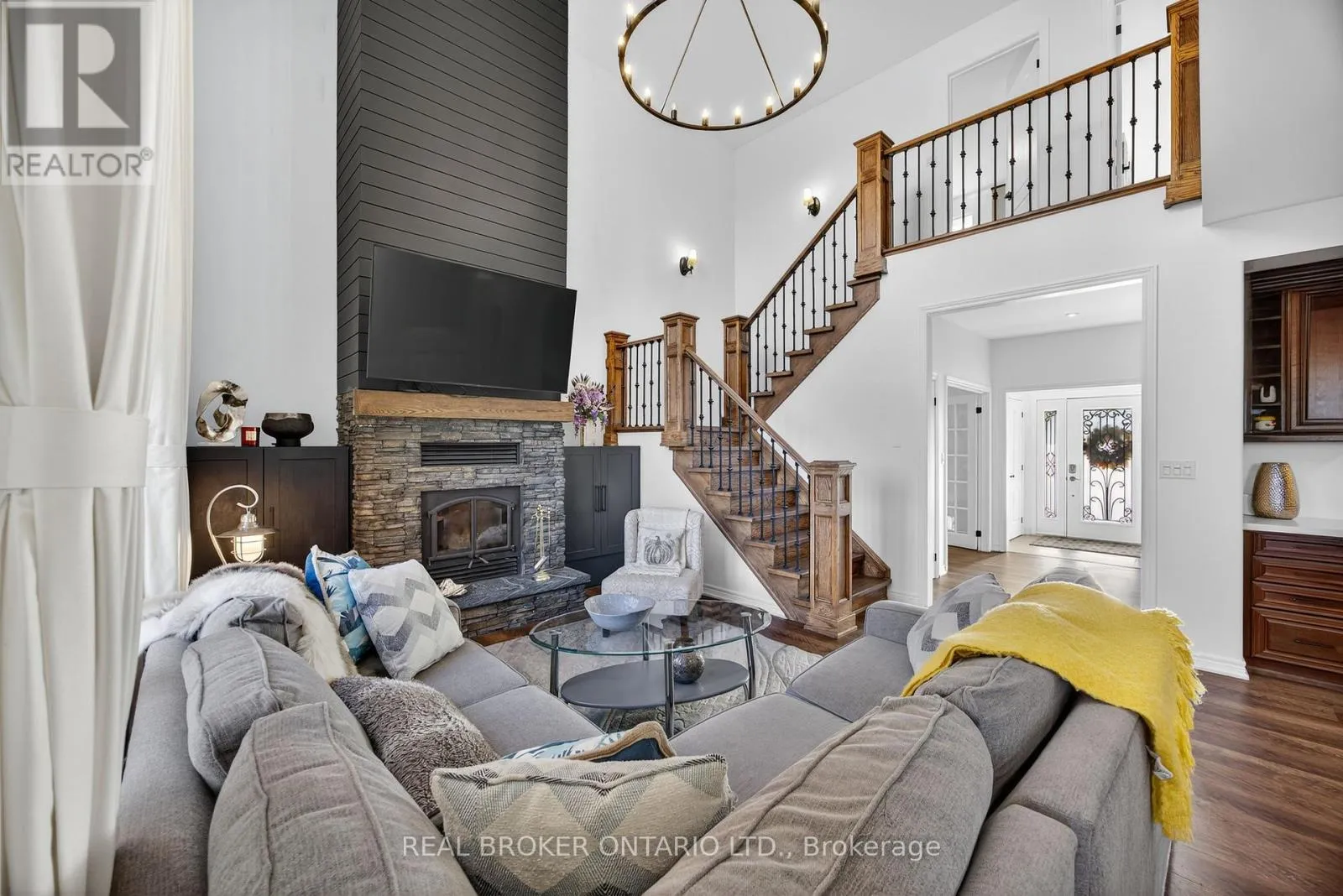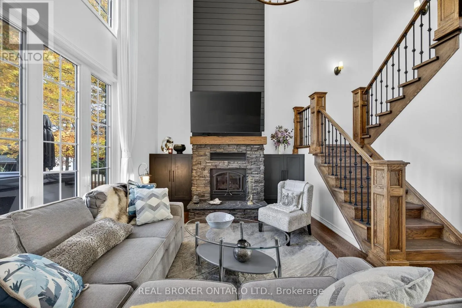 Cross Streets: Horseshoe Valley Rd/Line 10. ** Directions: Line 10. Tucked away on nearly 2 acres of private, tree-lined land, this one-of-a-kind custom home offers the ideal blend of luxury, space, and serenity. Surrounded by mature trees and cedars, the setting is peaceful and secluded, yet just minutes from all the essentials. With nearly 3,800 sq ft of beautifully finished living space, the home makes a statement from the moment you arrive. A paved driveway guides you to an oversized 3-car garage with convenient access to the laundry/mudroom-perfect for busy families. Step inside to a dramatic great room with soaring vaulted ceilings, a wood-burning fireplace, and floor-to-ceiling windows that bring the outdoors in. The kitchen is designed for both function and style, featuring stone countertops, a gas stove with hoodless venting, and a sunlit breakfast nook that flows into the outdoor entertaining space. On either side of the foyer, a formal dining room and a private office (or music room) offer flexibility. Upstairs, the primary suite feels like a private retreat, complete with a walk-in closet and spa-like 5-piece ensuite. Two more bedrooms share a luxurious full bath, and a cozy family room with a built-in office nook adds a bonus living space. The finished lower level is ideal for multi-generational living, with a 3-bedroom in-law suite, private entrance, full kitchen, and garage access. Outdoor living is a dream with a large back deck, a wrap-around front porch, a fire pit area, a vegetable garden, and fruit trees dotting the landscape. Backed by Braestone Golf Club and The Ktchn, and minutes to Horseshoe Valley, Bass Lake, Glen Oro Farm, Mount St. Louis Moonstone, and more. Just 10 minutes to Orillia and 20 to Barrie-this is luxury country living with city convenience. (id:27476)
