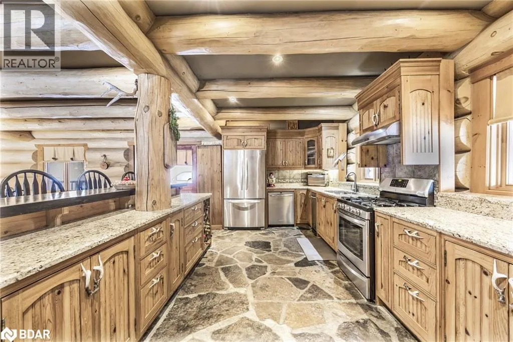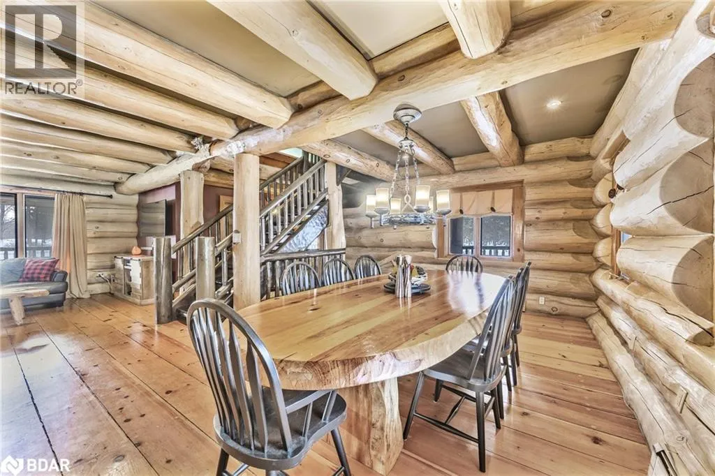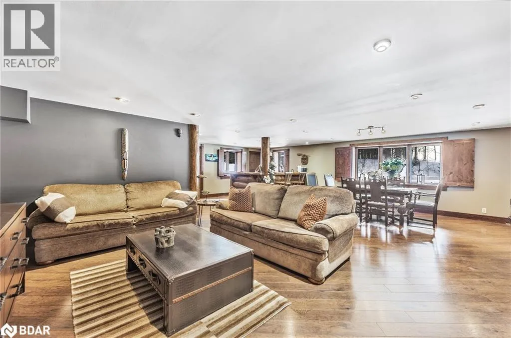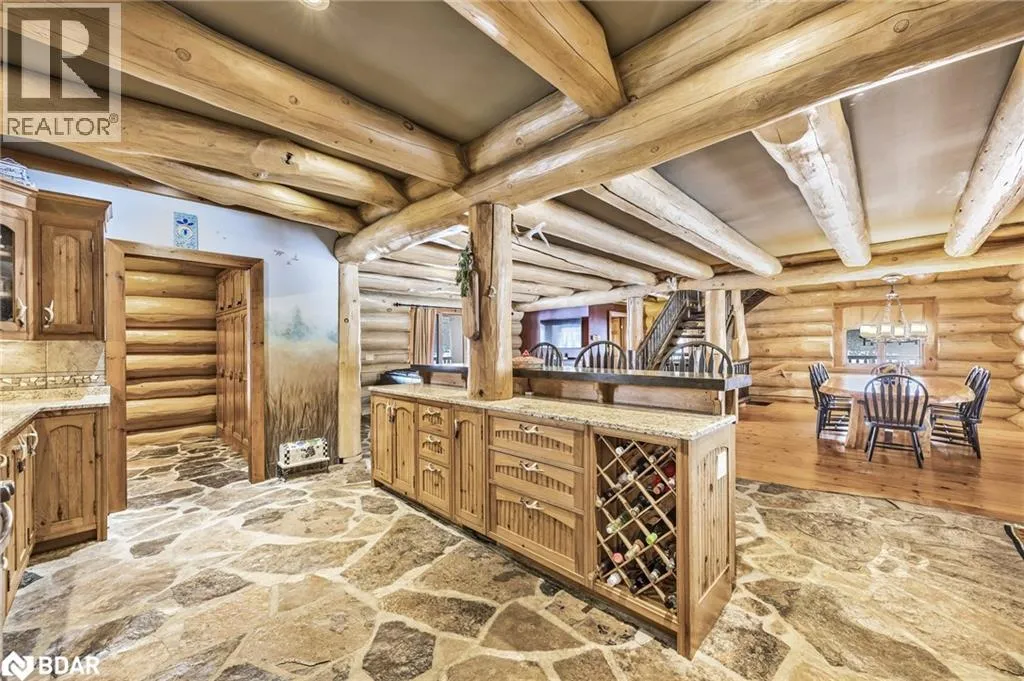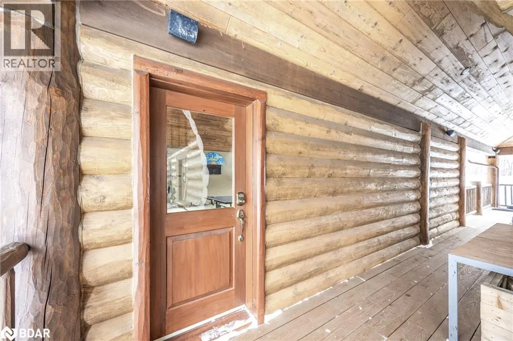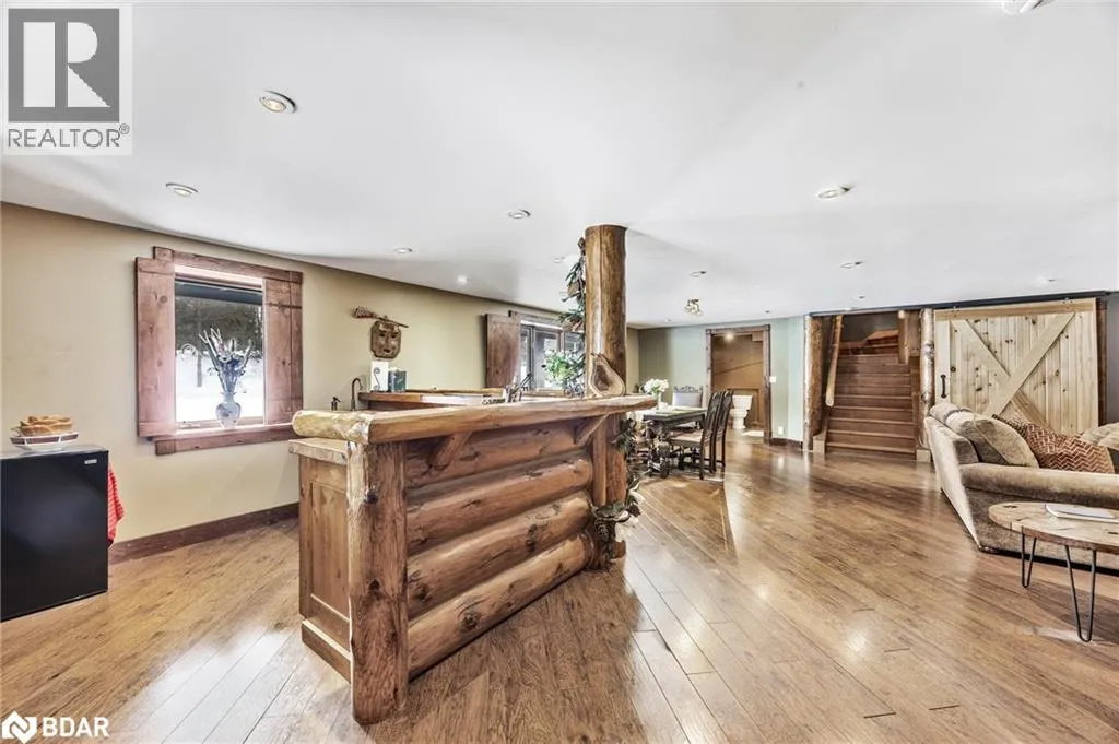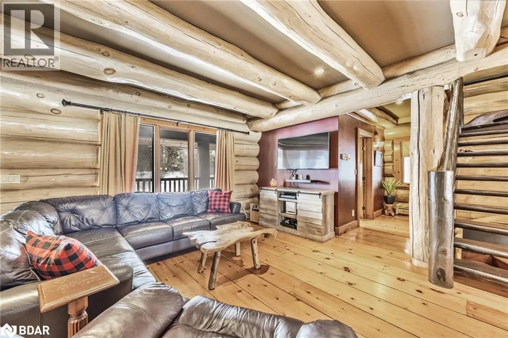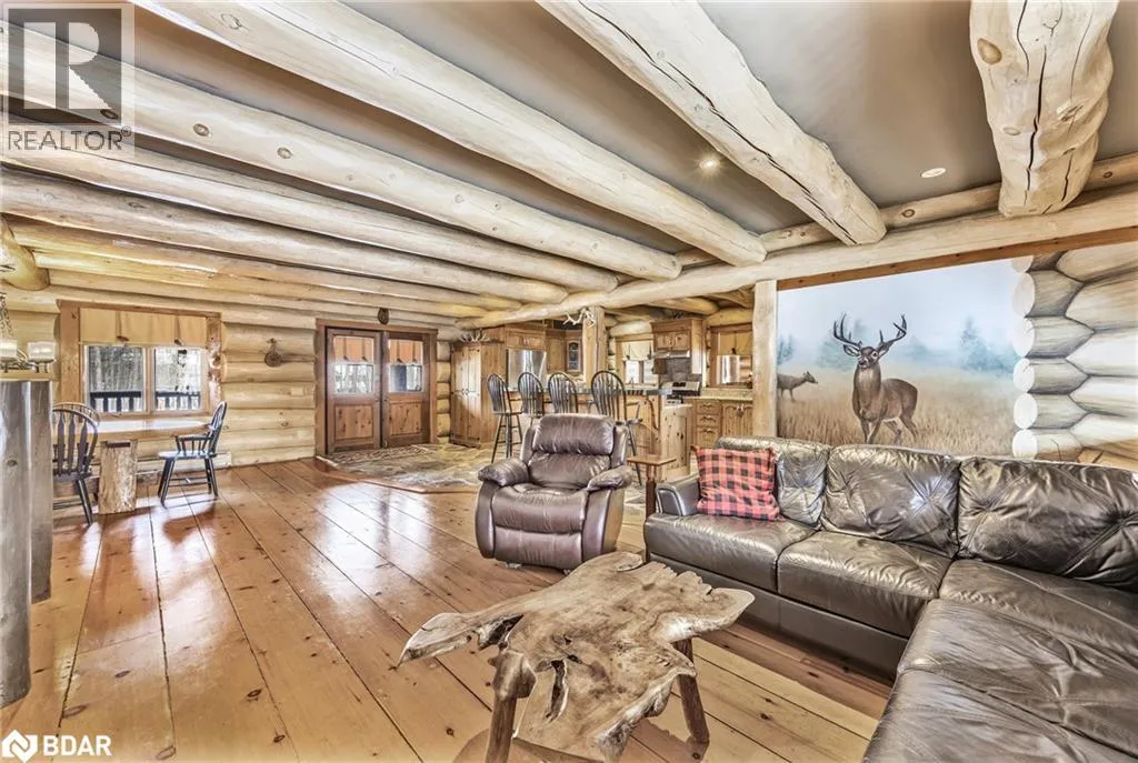 HORSESHOE VALLEY RD TO 3RD LINE N., LEFT ON HIGHLAND DR Welcome to 118 Highland Drive, Oro-Medonte. Discover the charm and craftsmanship of this stunning log home in the heart of Horseshoe Valley. Featured in the movie The Christmas Chronicles starring Kurt Russell, this home radiates warmth and comfort, complemented by award-winning landscaping and a breathtaking 3-tier pond a tranquil highlight of the property. Step inside to a spacious foyer with tile flooring which leads into a cozy yet expansive rec room with rich hardwood floors. This level also features a beautiful wet bar, a comfortable bedroom, and a 4-piece bathroom, ideal for entertaining or hosting guests.The open-concept main floor is designed for modern living. The kitchen dazzles with granite countertops, stainless steel appliances, and a breakfast bar, flowing effortlessly into the dining and living room. A walk-in pantry with a built-in freezer and second fridge provides exceptional storage, while a stylish powder room completes this level.The second floor offers two generously sized bedrooms, each with its own ensuite. The primary suite boasts a walkout to a private balcony overlooking the backyard and includes a convenient laundry area. A bright office space and soaring cathedral ceilings with wood beams enhance the airy ambiance of the home.The heated garage, complete with an entertainment room above, blends utility with style. Outdoor living is equally impressive, with multiple walkouts to covered porches, including a wrap-around porch and private balconiesperfect for soaking in the peaceful surroundings. You will love the cleanliness and efficiency of the water radiators and in-floor heating, ensuring consistent warmth and a clean, comfortable atmosphere throughout.Situated just one minute from Vetta Nordic Spa, five minutes from Horseshoe Valley Resort, and close to Craighurst amenities and major highways, this property offers a harmonious blend of natural beauty and unmatched convenience. (id:27476)