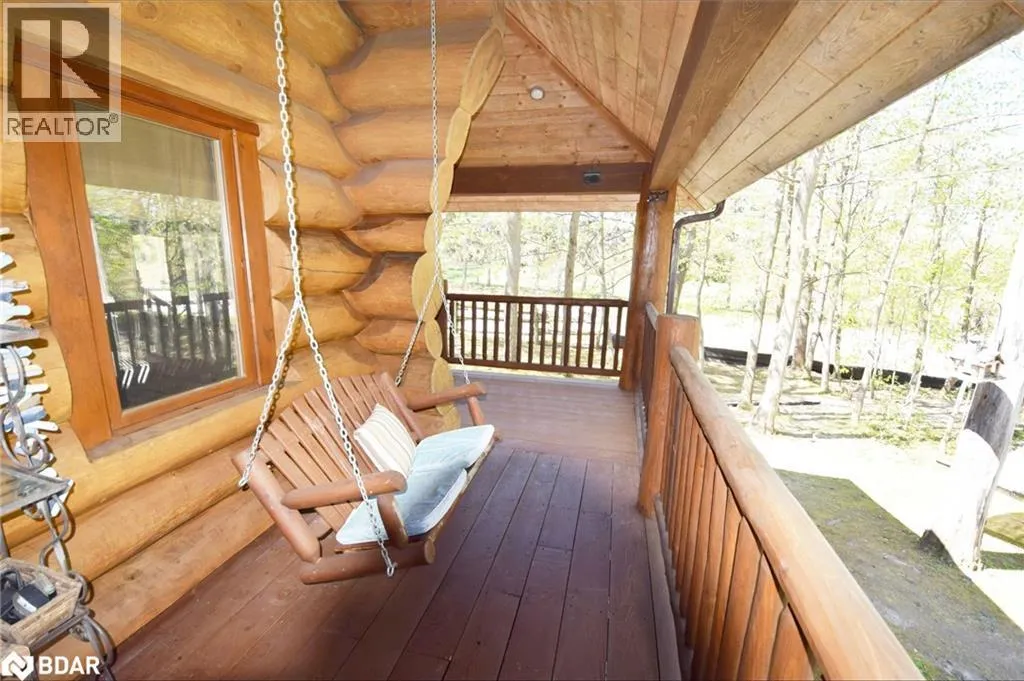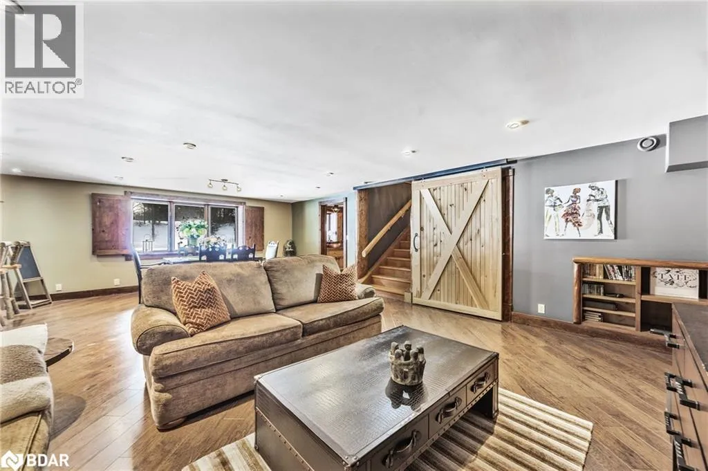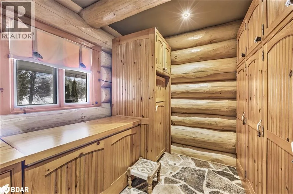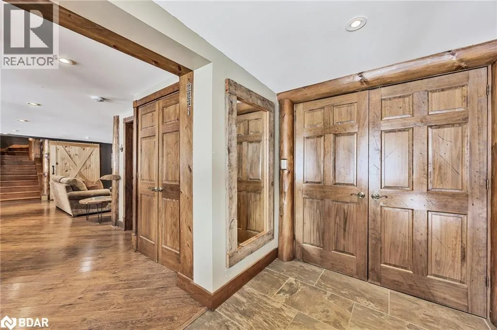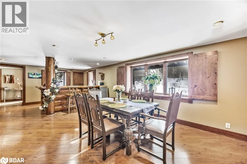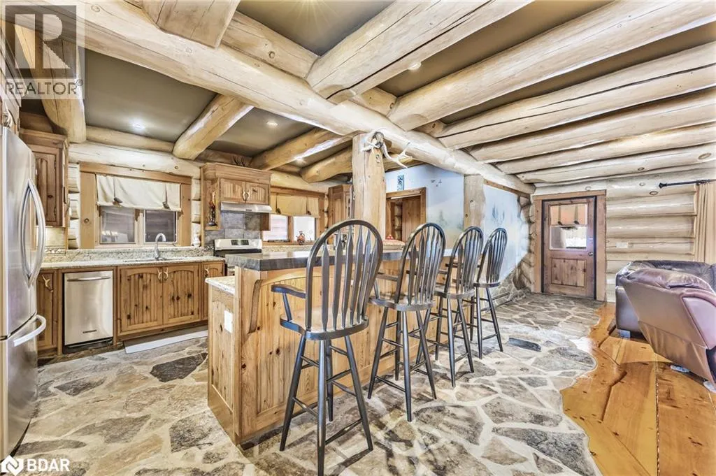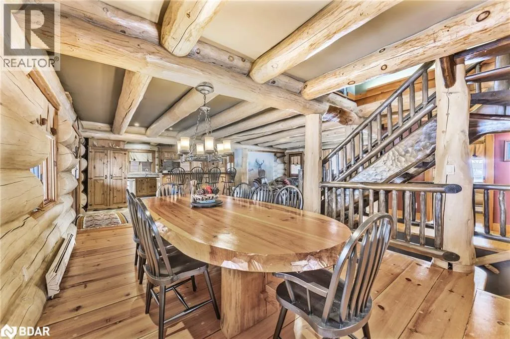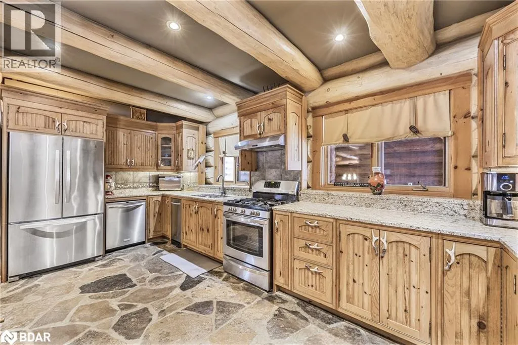 HORSESHOE VALLEY RD TO 3RD LINE N., LEFT ON HIGHLAND DR Welcome to 118 Highland Drive, Oro-Medonte. Discover the charm and craftsmanship of this stunning log home in the heart of Horseshoe Valley. Featured in the movie The Christmas Chronicles starring Kurt Russell, this home radiates warmth and comfort, complemented by award-winning landscaping and a breathtaking 3-tier pond a tranquil highlight of the property. Step inside to a spacious foyer with tile flooring which leads into a cozy yet expansive rec room with rich hardwood floors. This level also features a beautiful wet bar, a comfortable bedroom, and a 4-piece bathroom, ideal for entertaining or hosting guests.The open-concept main floor is designed for modern living. The kitchen dazzles with granite countertops, stainless steel appliances, and a breakfast bar, flowing effortlessly into the dining and living room. A walk-in pantry with a built-in freezer and second fridge provides exceptional storage, while a stylish powder room completes this level.The second floor offers two generously sized bedrooms, each with its own ensuite. The primary suite boasts a walkout to a private balcony overlooking the backyard and includes a convenient laundry area. A bright office space and soaring cathedral ceilings with wood beams enhance the airy ambiance of the home.The heated garage, complete with an entertainment room above, blends utility with style. Outdoor living is equally impressive, with multiple walkouts to covered porches, including a wrap-around porch and private balconiesperfect for soaking in the peaceful surroundings. You will love the cleanliness and efficiency of the water radiators and in-floor heating, ensuring consistent warmth and a clean, comfortable atmosphere throughout.Situated just one minute from Vetta Nordic Spa, five minutes from Horseshoe Valley Resort, and close to Craighurst amenities and major highways, this property offers a harmonious blend of natural beauty and unmatched convenience. (id:27476)
