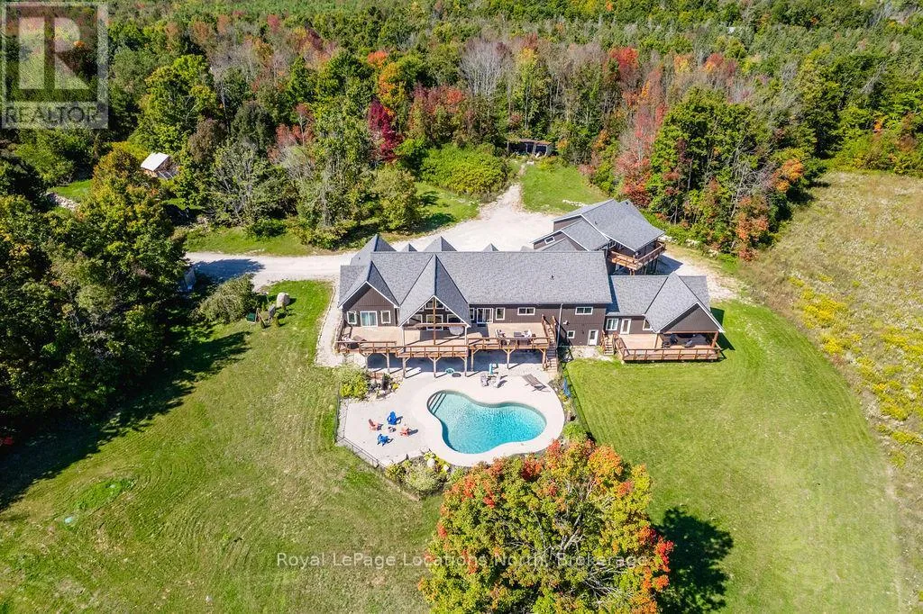 Moonstone Rd E/County Rd 19/Line 8 N FAMILY COMPOUND | Built in 2022, this expansive 9,000 sqft estate on 100 acres is ideal for multi-generational living, family compound use, or rental income potential. The property includes a custom main residence, a legal ranch-style accessory apartment with private laundry & a self-contained loft suite above a heated 4-car garage, offering exceptional flexibility. A grand foyer flows into a stunning living room featuring floor-to-ceiling windows & expansive panoramic views of the acreage. The main home features 3+2 bedrooms, 3 full & 2 half bathrooms, 9' ceilings & engineered hardwood throughout the main level. The great room showcases 19' vaulted ceilings with walk-out access to a covered deck overlooking the pool.The chef's kitchen & formal dining area are designed for entertaining, complete with quartz countertops, oversized custom island, double farmhouse sink, and premium stainless steel appliances. The primary suite is a private retreat with deck access, dual walk-in closets & a spa-inspired 5-piece ensuite featuring a soaker tub, walk-in shower, dual quartz vanity & private water closet.The walk-out lower level includes a large recreation room, two additional bedrooms & a dedicated salon with powder room, ideal for a home business, studio, or professional workspace, finished with durable vinyl plank flooring.The legal accessory apartment offers vaulted ceilings, an open-concept layout, quartz kitchen counters, private covered deck & in-suite laundry - perfect for extended family or income-generating rental use. The loft suite includes a bedroom, 4-piece bath, kitchenette & private deck for guests or independent living.The heated 4-car garage features 10' and 14' ceilings, ideal for car enthusiasts, storage, or workshop use. Outdoors, the 100-acre property supports hiking trails, hobby farming, recreational use, or a private nature retreat. Enjoy a resort-style outdoor setting with a heated 20' x 40' saltwater pool, multiple decks & expansive green space. (id:27476)