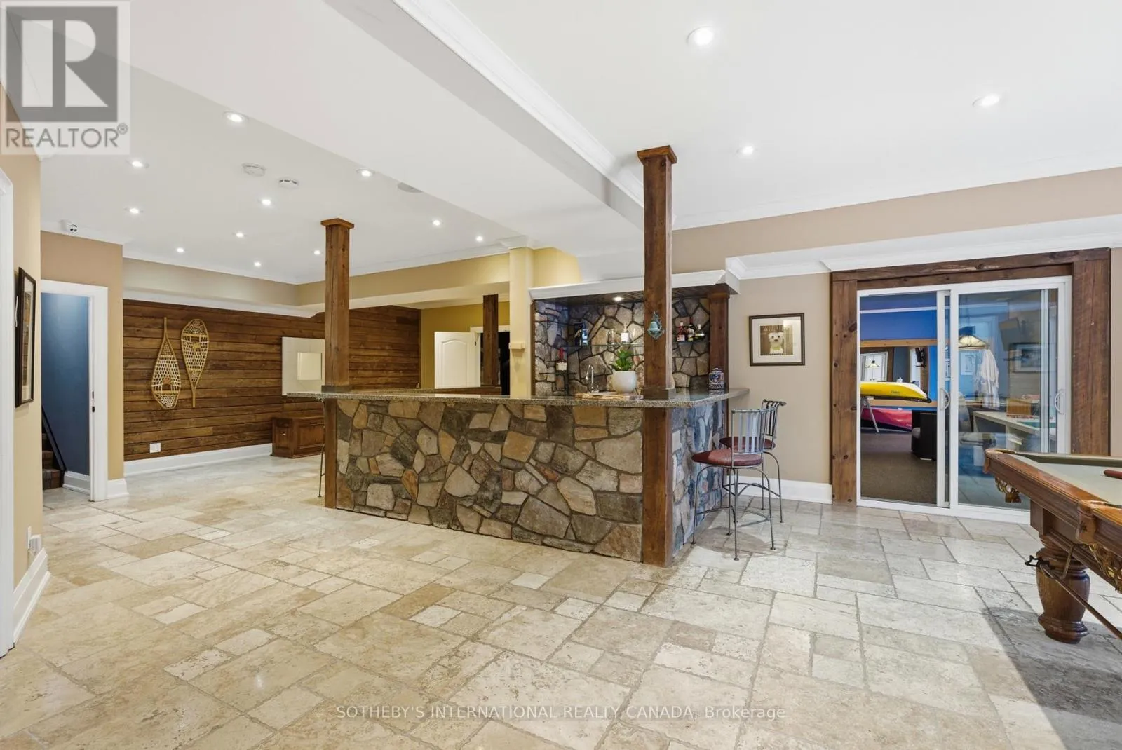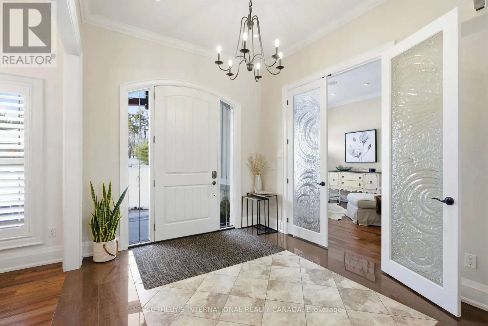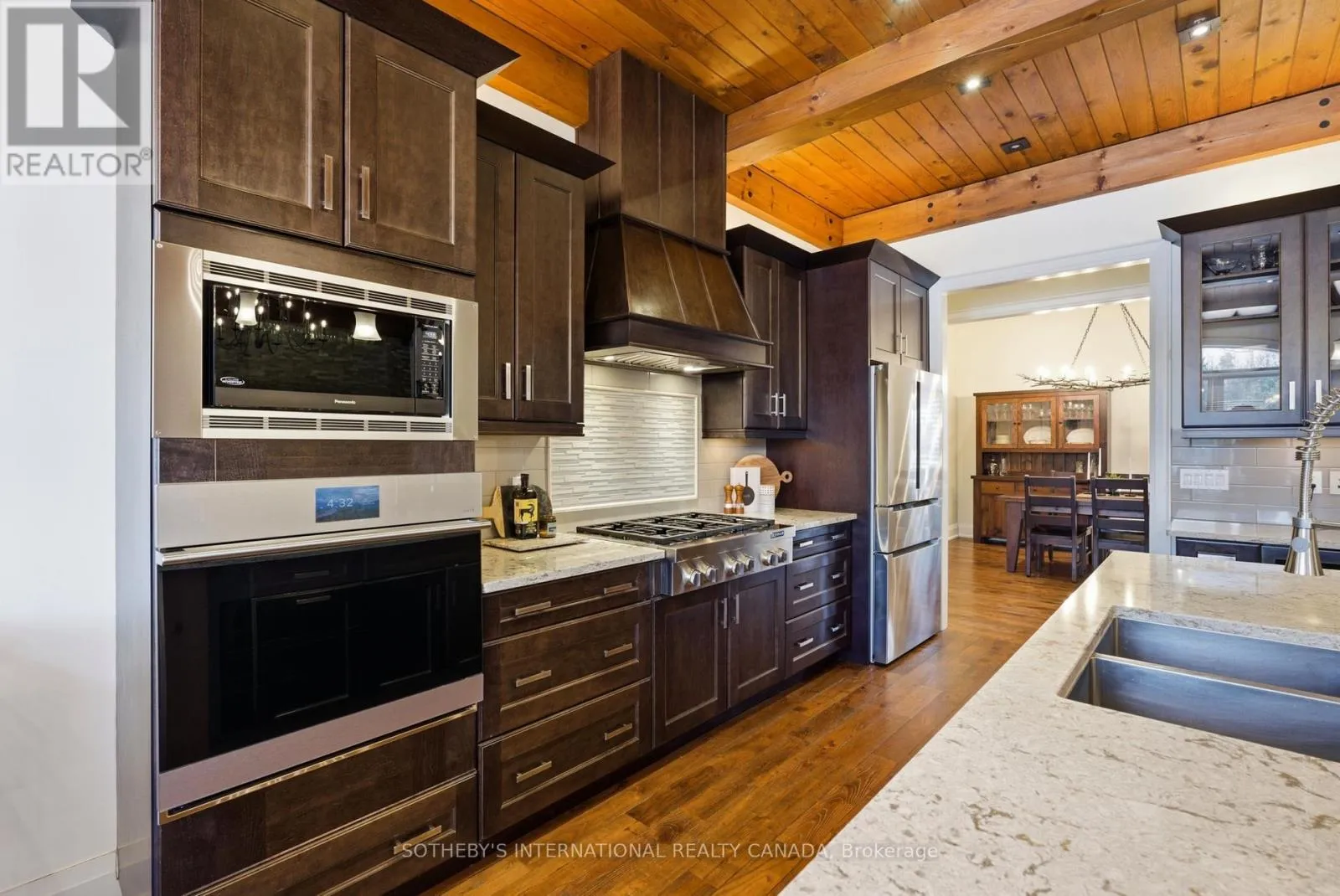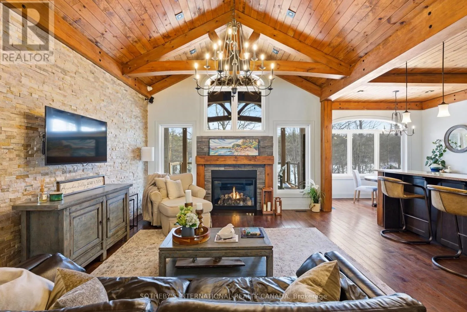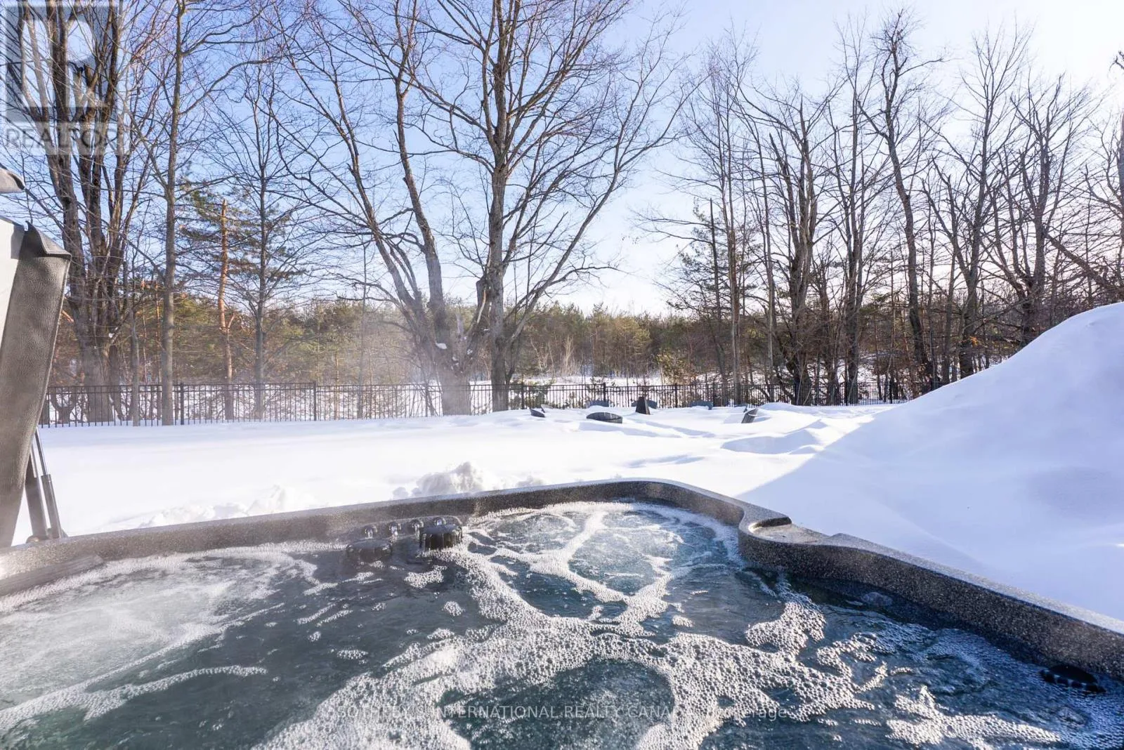 Cross Streets: Nordic Trail and Alpine. ** Directions: Hwy 400 to Horseshoe Valley Rd. towards Craighurst. Right on Line 4, Right on Highland, Left on Alpine, Right on Nordic Trail, Left on Ridgewood. Nestled in the prestigious Horseshoe Valley community, just steps from the resort, trails, and green space, this custom-built bungalow offers privacy, luxury, and stunning south-east views over nature. Situated on a quiet cul-de-sac, the home welcomes you with a grand covered porch entrance and an impressive 14 ft timber arch. Large windows throughout fill the home with natural light. Entertain effortlessly in the great room with a gas fireplace or in the gourmet kitchen featuring quartz counters, backsplash, premium appliances, and a walk-in pantry. The space opens to a large 400 sq.ft. covered deck with expansive views. A built-in surround sound system extends throughout the home, creating an immersive atmosphere for entertaining. The luxury primary suite showcases timber ceilings and a private walk-out to the back porch, along with a spa-like ensuite that includes a steam shower and walk-in closet. Two additional bedrooms, an office, and laundry complete the main level, where solid bamboo hardwood flooring runs throughout. The walk-out basement is a true retreat, featuring a wet bar, theatre room, gym/leisure area, sauna, heated floors, and a bedroom with its own ensuite bathroom. All bathroom floors in the home are heated for added comfort, and the remainder of the home features 10 ft ceilings, enhancing the sense of space and openness. Outdoor living shines with beautiful, professionally landscaped grounds featuring a stone patio, Arctic Spa hot tub, sprinkler system, and fire pit area - perfect for relaxing or hosting under the stars. The property backs onto recreational trails and forest, offering exceptional privacy and direct access to nature. Additional highlights include a heated driveway, a heated three-car garage, and a full Generac backup generator. With unmatched privacy, scenic views, and proximity to local amenities, schools, hospital, and major highways, this property represents a rare opportunity in a highly sought-after community. (id:27476)