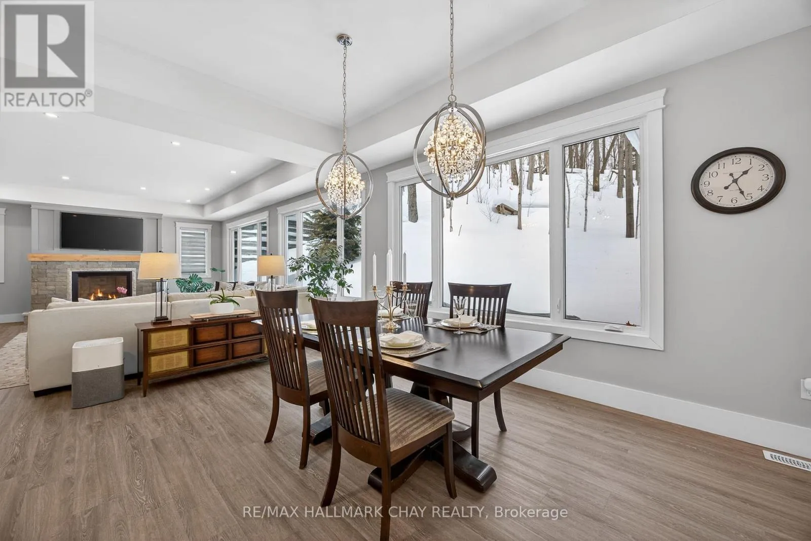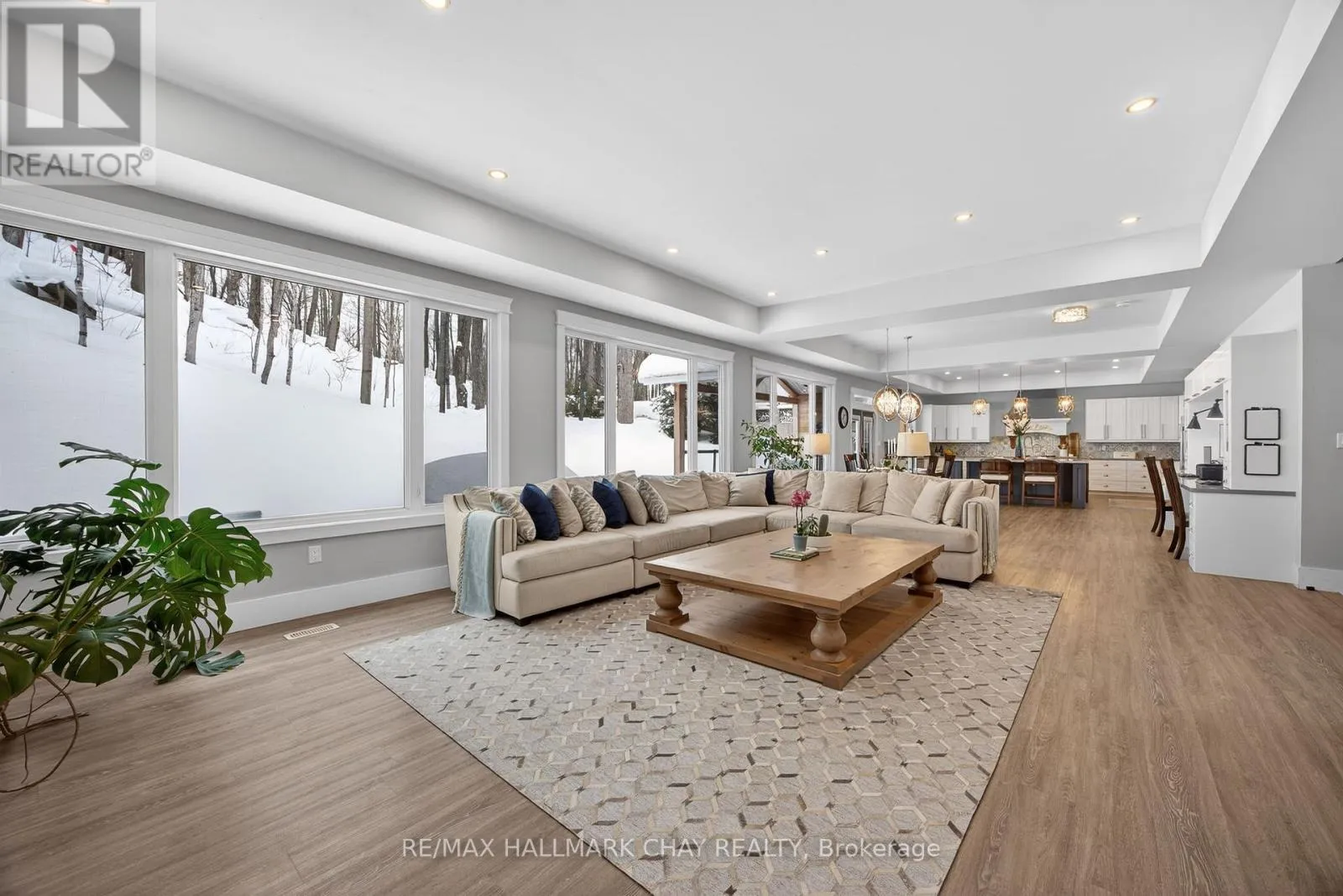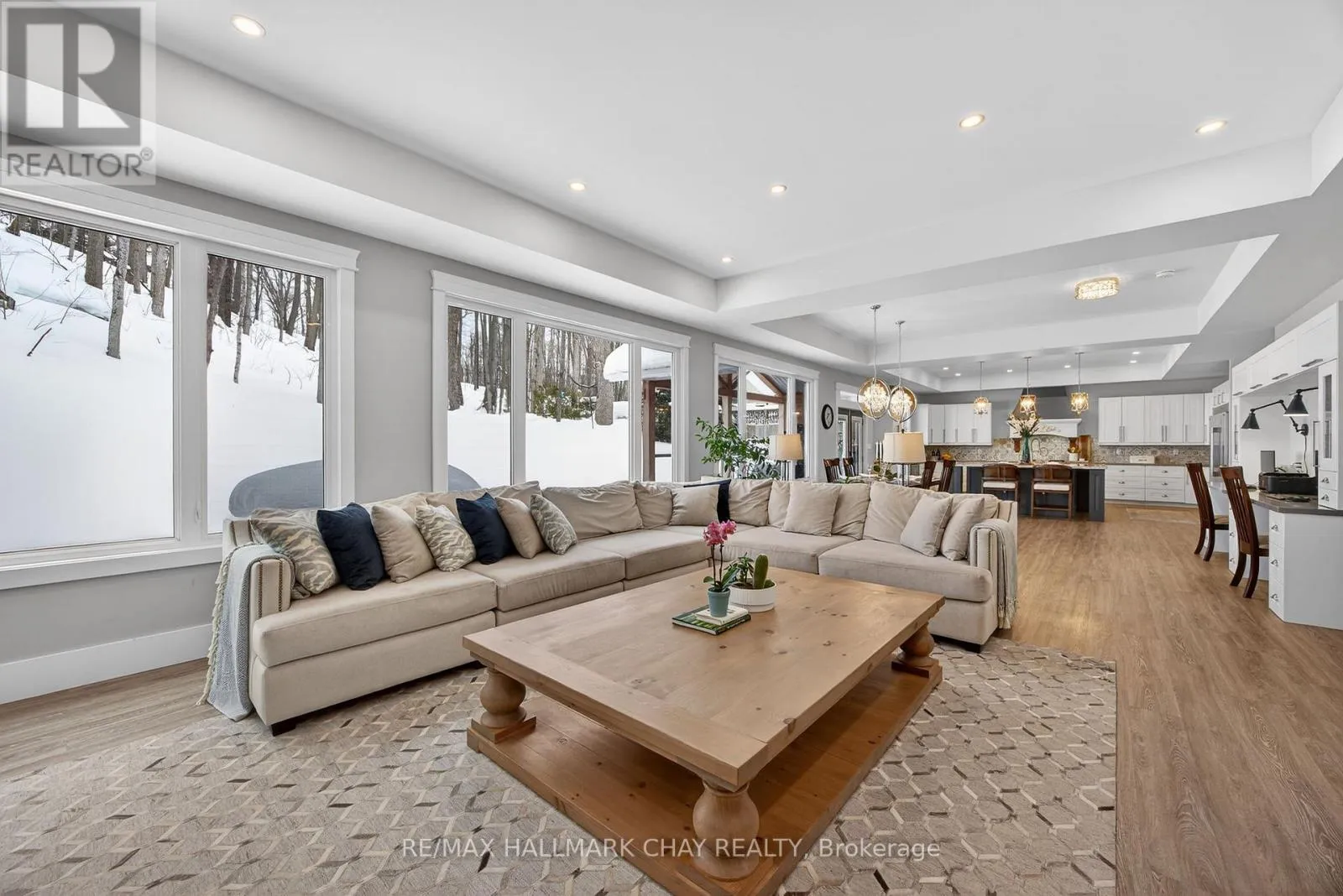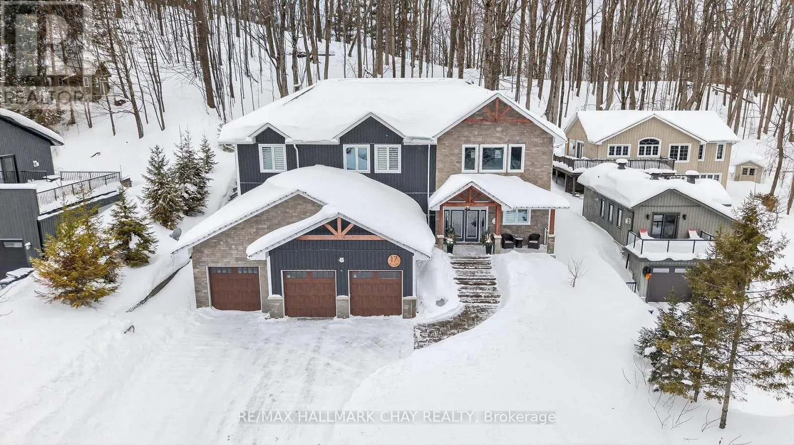 Cross Streets: Horseshoe Valley Rd/Pine Ridge. ** Directions: Horseshoe Valley Rd W to Pine Ridge Trail. Home on the Left (East). 17 Pine Ridge Trail offers luxury estate living in the heart of Horseshoe Valley, set on a private maple-treed lot backing onto forest on a quiet dead-end street. Step inside and you'll immediately appreciate the bright, open-concept design with high ceilings, pot lighting, and oversized rear windows that bring the outdoors in. The chef-inspired kitchen is truly the heart of the home, featuring a massive centre island with stone countertops, oversized double stainless fridge, gas range, dishwasher, bar fridge, and range hood-perfect for everyday living and entertaining. Between the kitchen and living room, you'll love the dedicated dining area with custom built-in cabinetry, this area is ideal for family meals, homework space, or a functional work-from-home setup, with walkout to the timber-framed covered porch complete with multiple gas lines for year-round outdoor enjoyment. The inviting living room is anchored by a stunning gas fireplace and views of the private backyard. Also on the main level is a versatile office, playroom, or potential additional bedroom, along with a 2-piece bath and oversized mudroom. The triple car garage offers two convenient interior access points-one into the mudroom and another directly to the basement stairway-providing exceptional everyday functionality. Upstairs features four spacious bedrooms including a primary suite with vaulted ceilings, walk-in closet with direct access to the laundry room, and a spa-like 5-piece ensuite with soaker tub, separate shower, and double sinks. A guest bedroom includes its own 4-piece ensuite, while bedrooms two and three share a semi 5 piece ensuite. Located minutes to Horseshoe Resort, Vettä Nordic Spa, trails, the new school, and recreation centre, you'll enjoy privacy, comfort, and true four-season living. Property has available - Residential Building / Apartment Dwelling (Finished Basement) Permit. (id:27476)