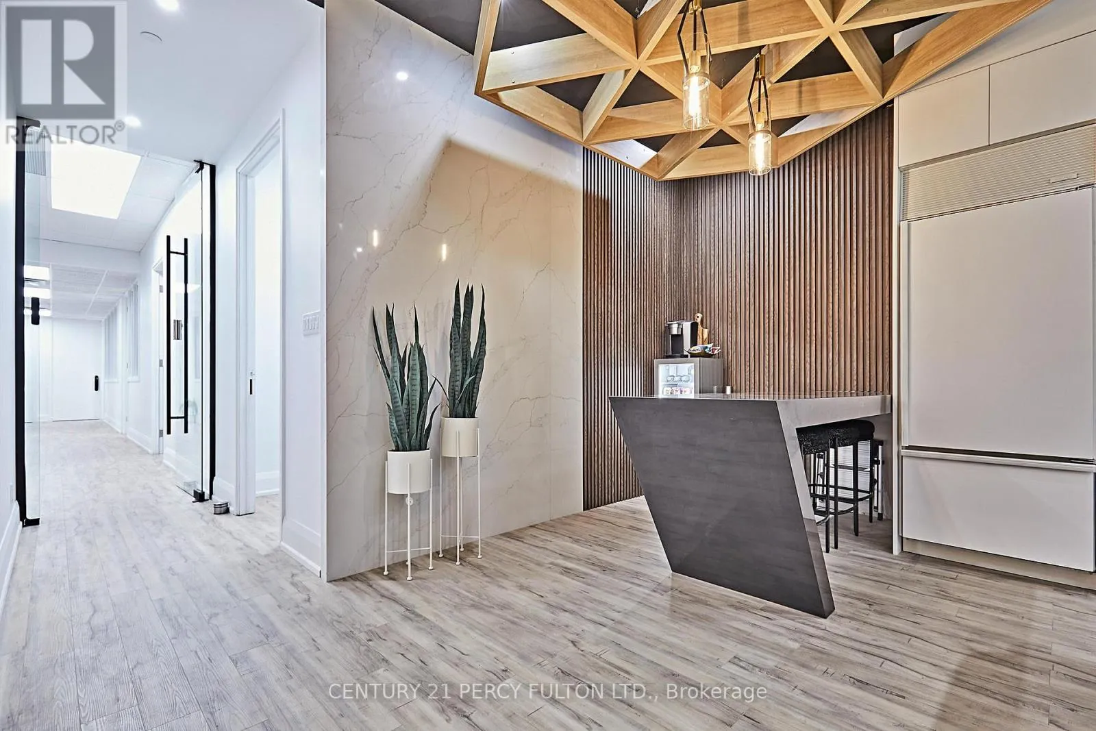 Cross Streets: Simcoe St & Richmond St E. ** Directions: from 401 via Simcoe St S - Head north toward Toronto Ave, Continue onto Drew St, Turn left onto First Ave, Turn right onto Simcoe St S, Turn right onto Richmond St E. This beautifully renovated space epitomizes modern elegance & functionality. It features ultrawide hallways with ten private offices, a sophisticated boardroom, & a state-of-the-art professional print room. There's an ultra-modern washroom with porcelain walls in the front & a second washroom near the back. The reception area has a rich, inviting, welcoming ambiance with warm wood-textured high-traffic waterproof vinyl floors. There are high-end finishes, including striking 10-foot high floor-to-ceiling quartz stone walls with new modern Fluted accent panels & custom ceiling features such as 3D graphic mosaic panels that would challenge any award-winning architectural designs. It also sports a top-of-the-line kitchenette with designer quartz counters & backsplash, a hideaway Sub-Zero fridge with freezer, a low profile one-touch microwave, a hideaway Meili super quiet dishwasher, a Miel coffee and beverage maker with instant hot water & built-in Milk Steamer, turns full beans into freshly ground and compacted, perfectly brewed duel cups of java. The Functional shelving with hideaway outlets & contemporary cabinetry all help to enhance the aesthetic appeal, creating an inspiring environment. Whether you're hosting clients in the elegant reception/lounge or boardroom, this office space is designed for productivity & style. Discover a workspace where innovation meets sophistication, renovated in 2024 from top to bottom with high-end fingerprint, access card, passcode & facial recognition locks on all doors. There are 13 extra large east-facing windows on Mary St. across from the YMCA, yielding Fantastic marketing potential. Ownership includes Access to condo amenities including, a pool, sauna, gym, workshop, library & more. It also includes a/c, heat, water, fast optical internet & bell fibre TV. (id:27476)