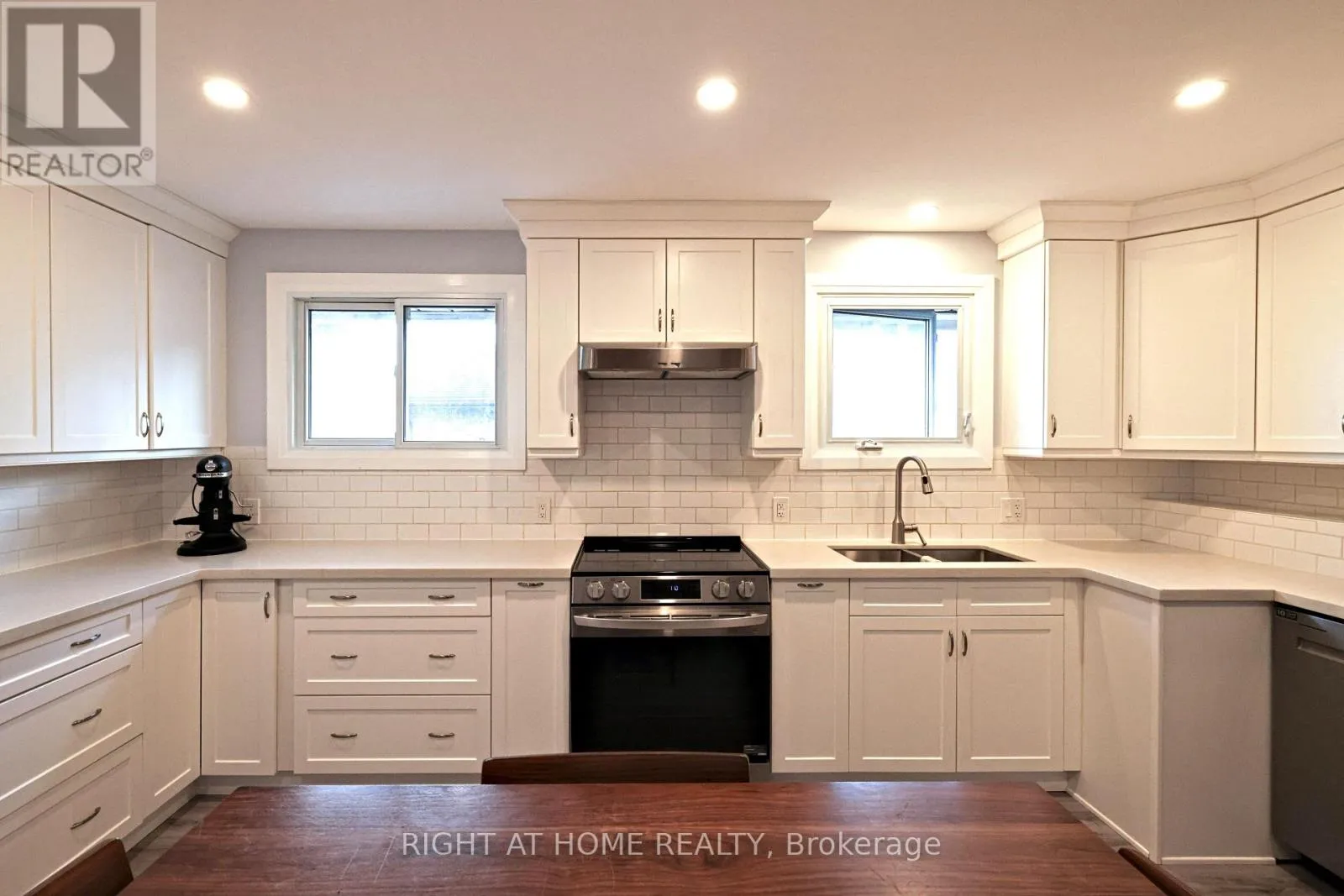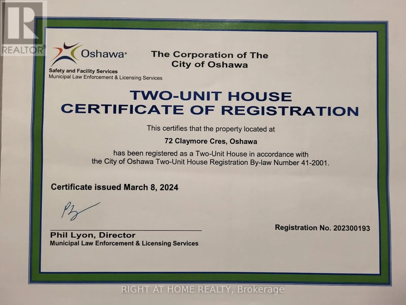Bond and Wilson Hard to find Bungalow with a legal second unit; great two family home or investment, Quiet Crescent, great area of Oshawa on a tree lined street. 3 bedrooms and main floor updates in 2024 include: Kitchen and bathroom, doors, laminate flooring, trim, pot lights, soft close doors in kitchen and bathroom, windows updated from original windows. Basement updates in 2024: 2 bedroom, full washroom with porcelain tile, soft close doors in bathroom, doors, trim, baseboards, laminate flooring, pot lights, closet and a storage room. Alos it is vacant so you can set your own rent. Detached two car garage was built in 2012 has its own 60 amp panel, man door, concrete floor and storage in the rafters. Additional features include 8 appliances, central air, forced air gas, fully fenced yard, 8 car paved double wide drive, small patio stone are in back, separate and private side entrance. Great area, with steps to transit, short walk to Harmony Trail, short walk to shopping. nearby schools and churches. (id:27476)
