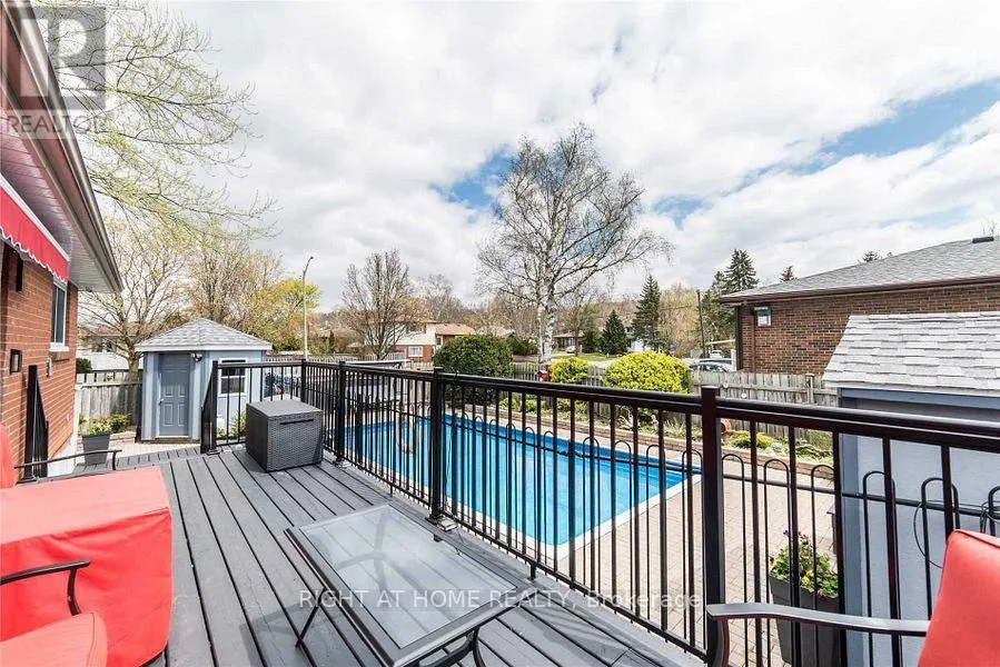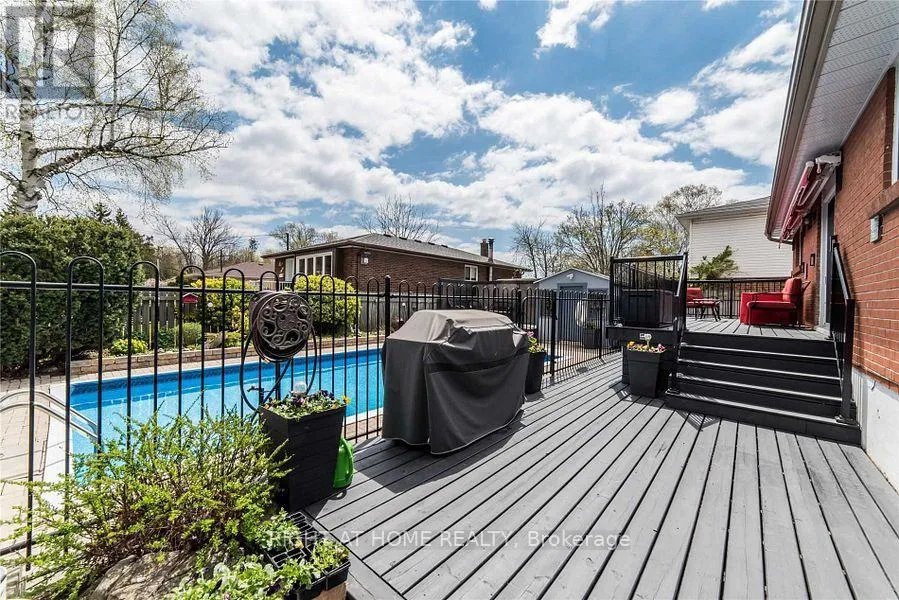 Grandview/Olive Pride of ownership on a quiet, tree-lined street in highly sought-after Donevan. This bright raised bungalow offers 3+2 bedrooms, 2 baths and a functional layout with hardwood floors on the main level. Updated eat-in kitchen with upgraded counters and stainless steel appliances opens to a warm living room with large picture window. Finished lower level with above-grade windows, 2 additional bedrooms, spacious rec room with fireplace and workshop - ideal for extended family, home office or hobby space. Step outside to your entertainer's backyard with inground pool, 2-tier deck and covered awning - perfect for summer BBQs and gatherings. Private driveway fits 4 cars. Close to schools, parks, transit, 401 and all amenities. A move-in ready home with a fantastic family lifestyle. (id:27476)