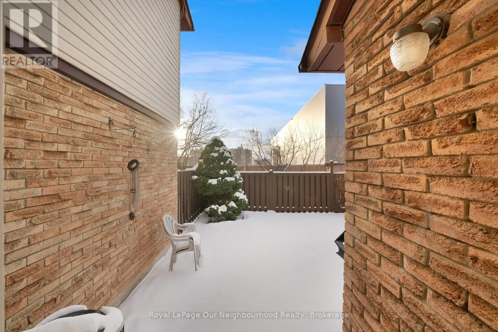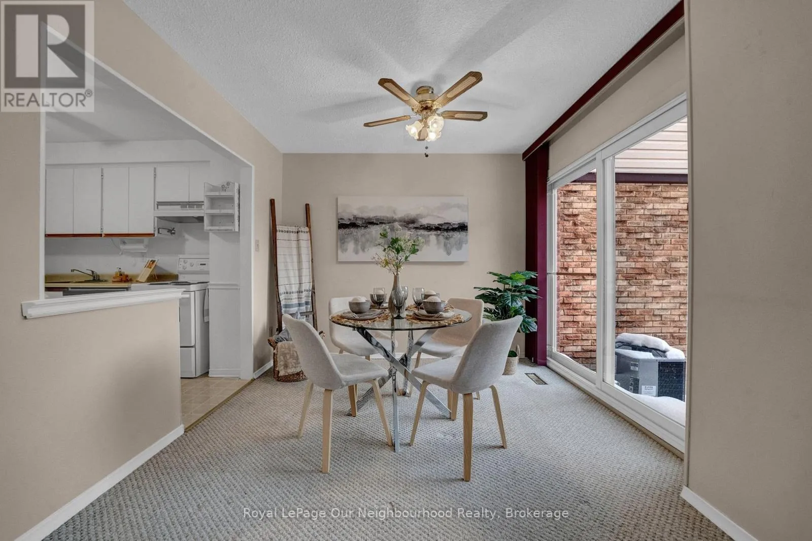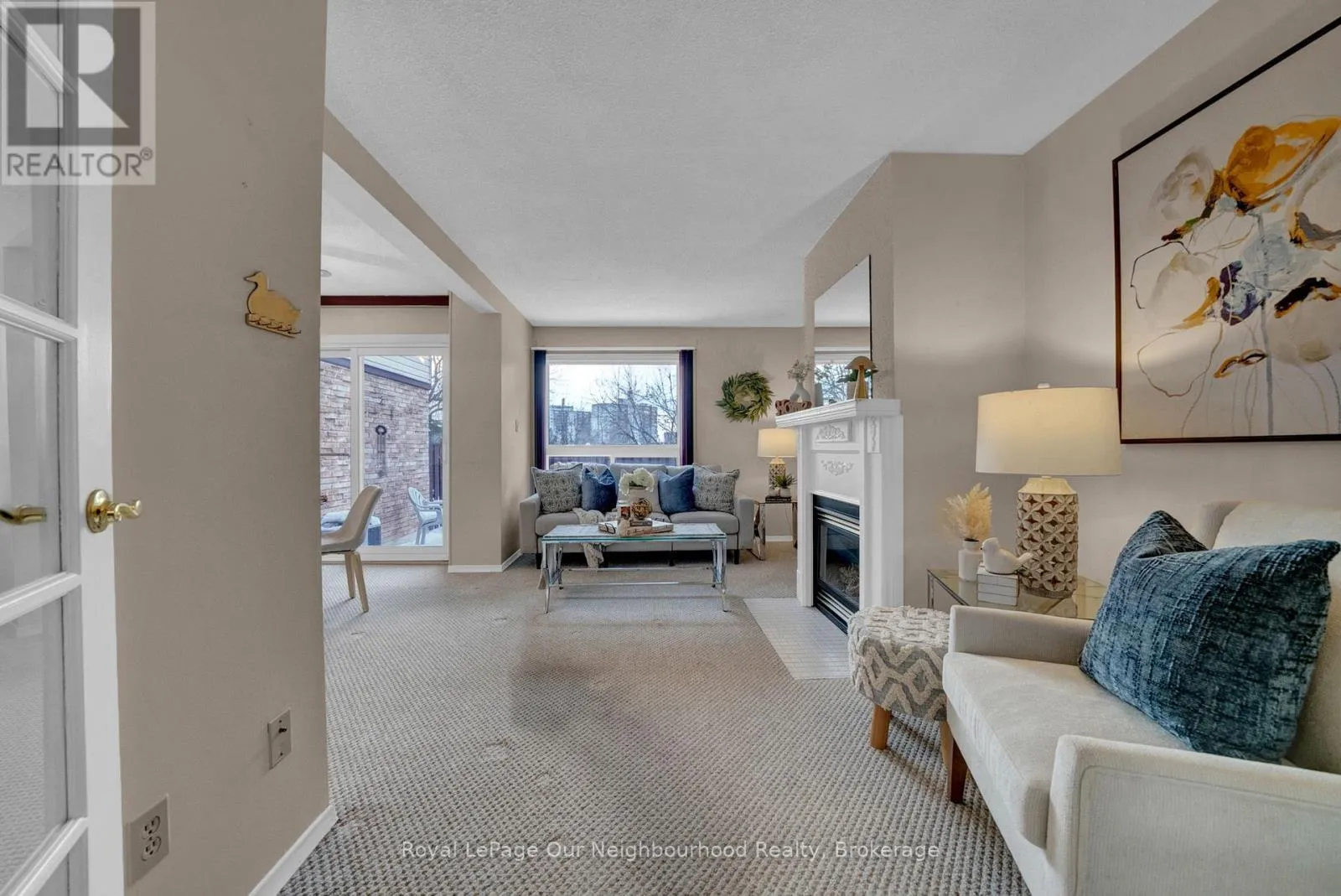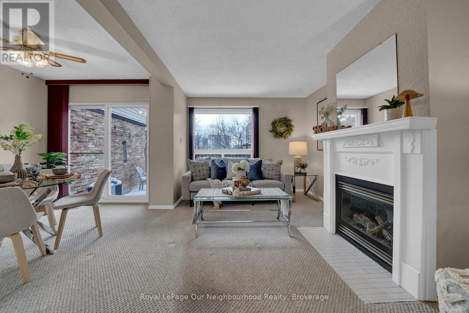 Cross Streets: Ritson/Beatrice. ** Directions: Beatrice St E to North on Trowbridge Dr. Warm and welcoming 2-storey condo townhouse in a family-friendly neighbourhood. Lovingly maintained and full of potential, this home offers an eat-in kitchen overlooking the dining room, with a sliding door walkout to a private patio, a great place for morning coffee or summer BBQs. The dining area flows into the living room featuring a cozy gas fireplace & French doors, an inviting layout for everyday living. Upstairs you will find three bedrooms, including a spacious primary with an oversized closet and 4pc semi ensuite. The lower level offers a partially finished basement with a rec room and retro bar area - ideal for movie nights, hobbies, or hosting friends. (id:27476)