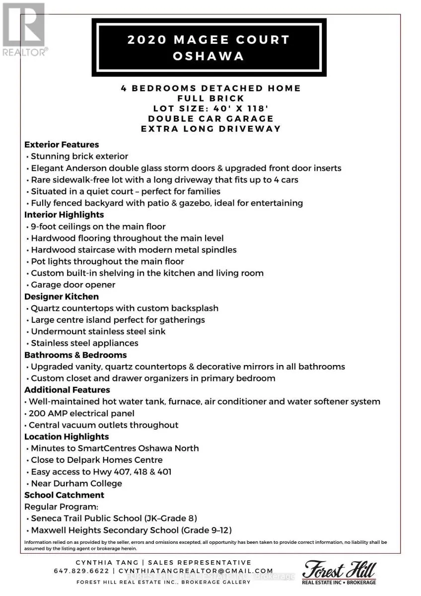 Grandview St N/Conlin Rd E Nestled on a quiet family-friendly court in desirable North Oshawa, this beautifully upgraded 4-bedroom detached home offers the perfect blend of style, comfort, and convenience. Situated on a generous 40' x 118' lot, the home showcases a full brick exterior, double car garage, and an extra-long driveway on a rare sidewalk-free lot, providing ample parking for 6 vehicles. Inside, the home features 9-foot ceilings, rich hardwood flooring throughout the main level, a hardwood staircase with modern metal spindles, and pot lights across the main floor, creating a bright and sophisticated living space.The designer kitchen serves as the heart of the home, beautifully appointed with quartz countertops, a custom backsplash, stainless steel appliances, a large centre island perfect for gatherings, and an undermount stainless steel sink, complemented by stylish custom built-in shelving in the kitchen and living room. All bathrooms are thoughtfully upgraded with quartz countertops, modern vanities, and decorative mirrors, while the spacious primary bedroom features custom closet and drawer organizers for optimal storage and functionality. Step outside to your fully fenced backyard oasis, complete with a patio and gazebo, perfect for summer entertaining, family gatherings, or simply unwinding in a private outdoor setting. Ideally located just minutes from SmartCentres Oshawa North, Delpark Homes Centre, major highways 407, 418 and 401, and Durham College, this exceptional home offers the perfect balance of peaceful suburban living with outstanding everyday convenience. (id:27476)