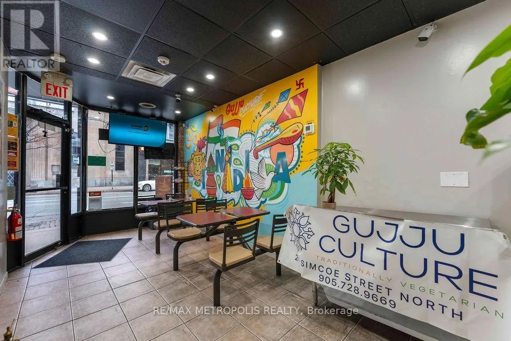 Simcoe & Bond Don't miss this turnkey restaurant opportunity in a prime Oshawa location. Fully built-out and currently operating, this space comes with a complete kitchen and equipment, allowing you to step in and start immediately with your own concept. Excellent exposure on a busy street with steady foot traffic, surrounded by residential and commercial density. The flexible setup supports a wide range of cuisines-perfect for rebranding or continuing the existing operation. (id:27476)