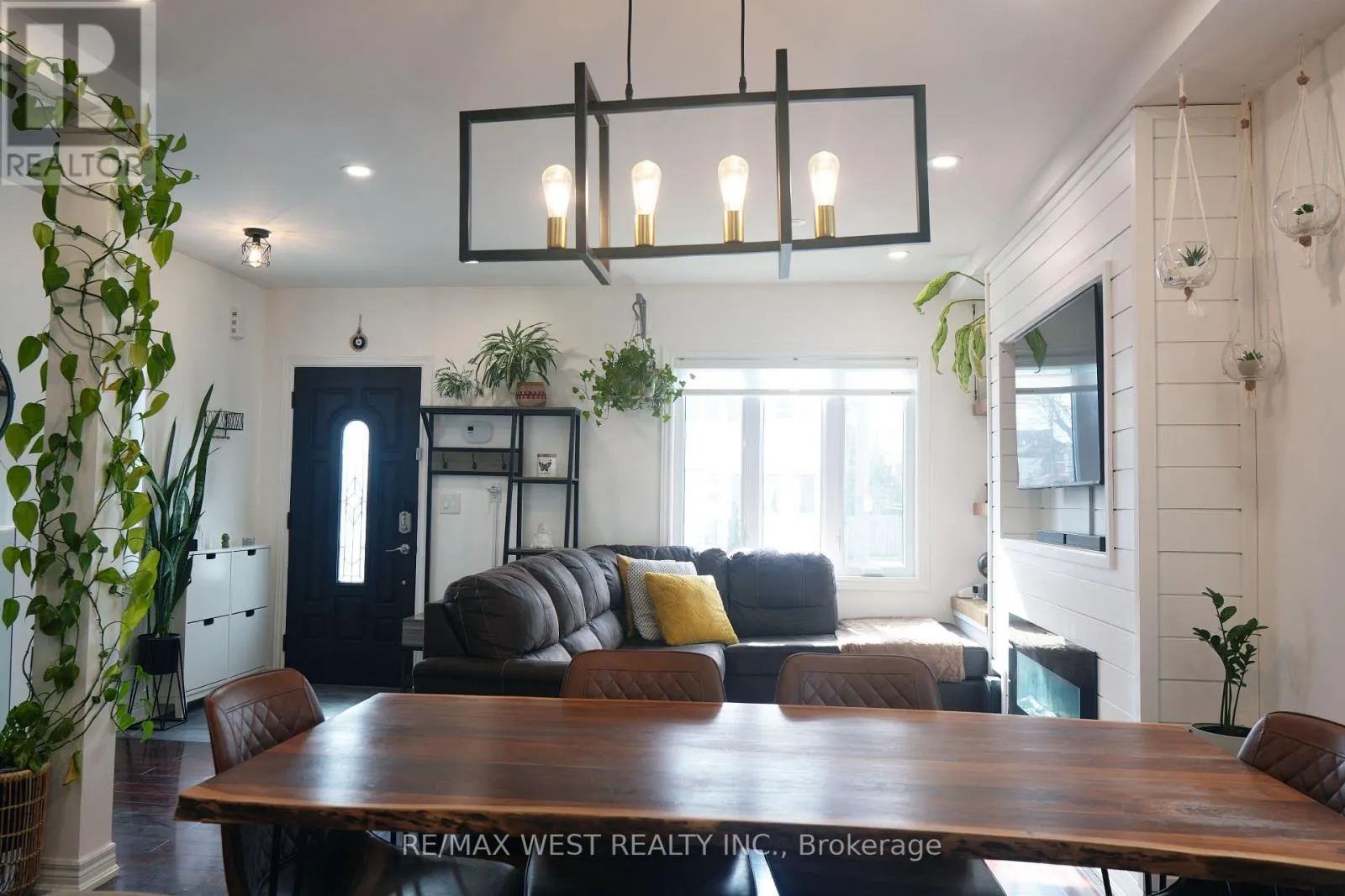 Court/Stacey Welcome to this well-maintained property featuring an inviting living area with a large window overlooking the front yard, pot lights, and laminate flooring throughout. The renovated kitchen offers stainless steel appliances and a cozy breakfast area with a walkout to a private backyard complete with a brand-new, full-length deck, perfect for entertaining. Enjoy added privacy with no neighbours behind. This home also features a newer asphalt driveway accommodating up to six vehicles, outdoor security cameras, a Ring doorbell, an alarm system, elegant glass handrails, and an indoor electric fireplace for added comfort and style. Conveniently located just steps from public transit, restaurants, schools, and parks, and only minutes from Highway 401 and shopping. Close to the Tribute Communities Centre. (id:27476)