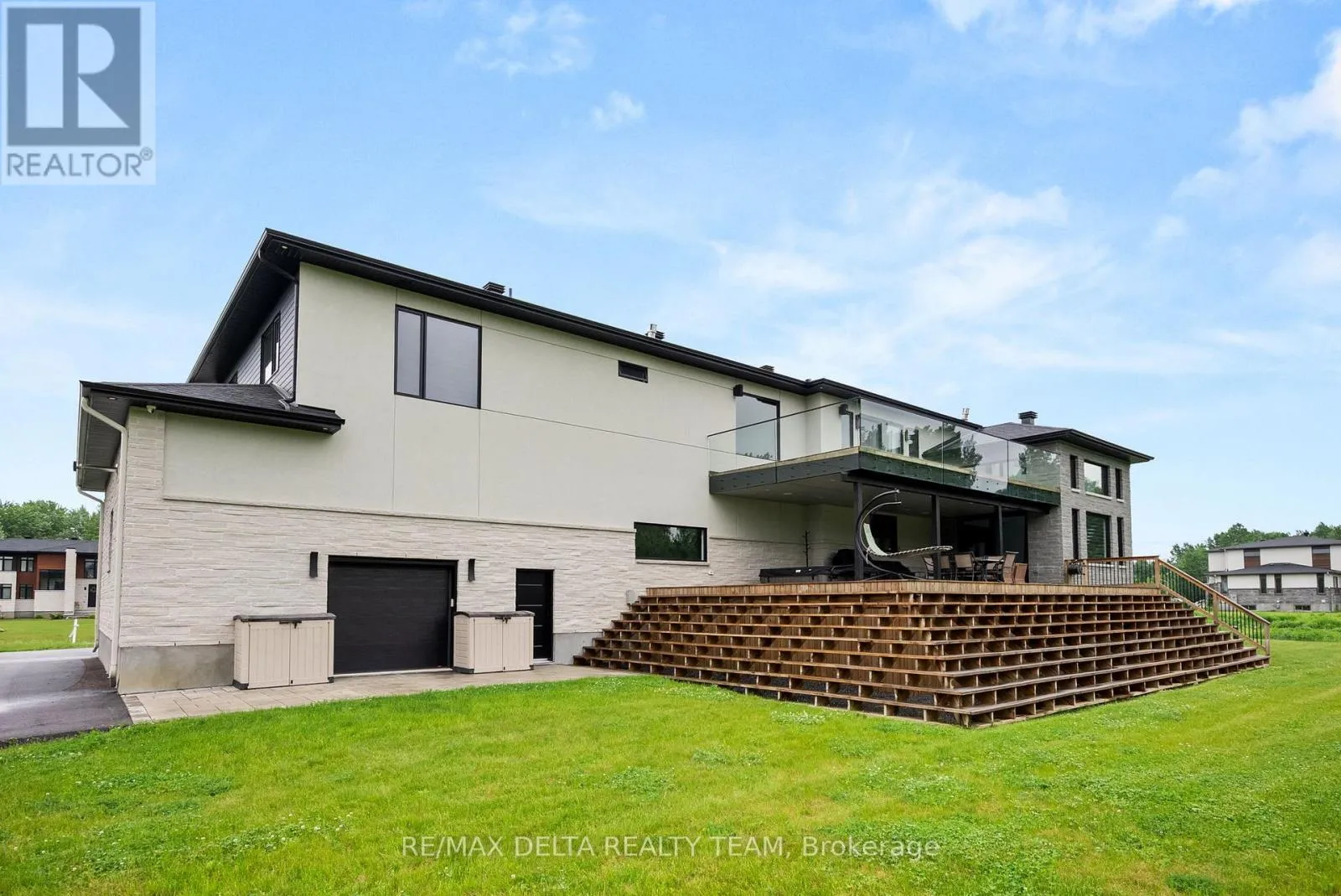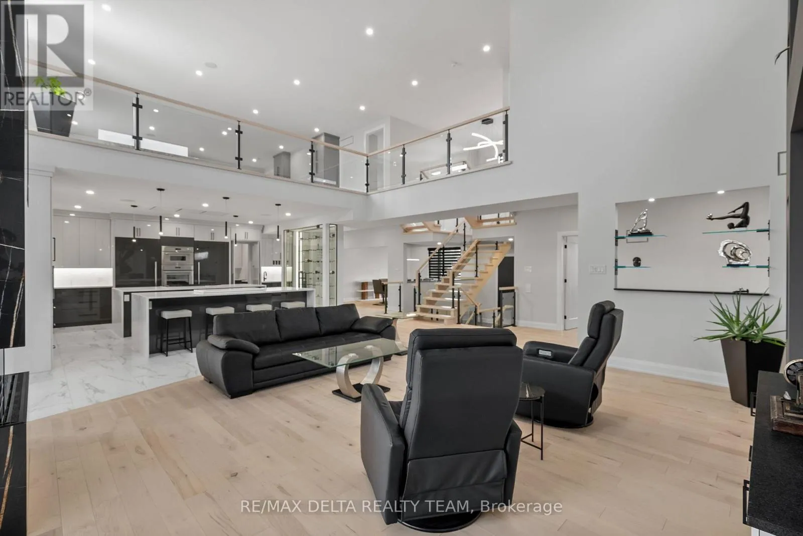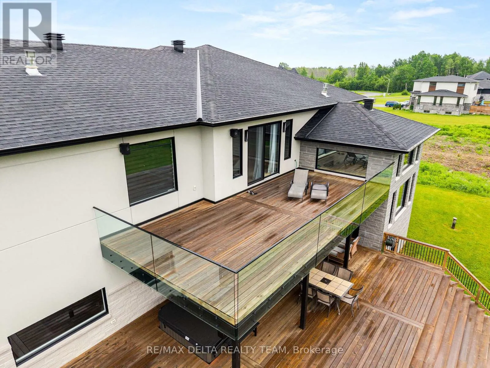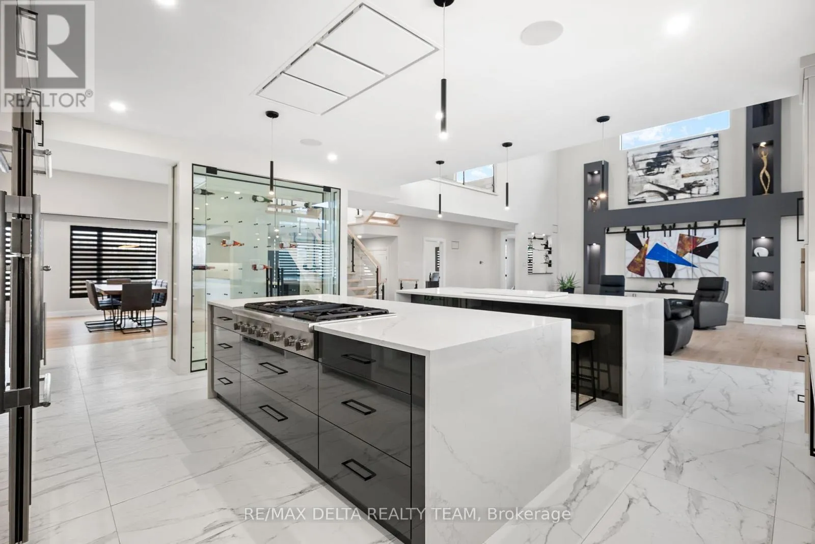 Cross Streets: Albion Rd & Mitch Owens Dr. ** Directions: From Manotick follow Mitch Owens Dr to Albion Road. Turn north and then west onto Killymoon Way then left onto Ballycastle. Located in Emerald Creek Estates near the intersection of Albion Rd & Mitch Owens Dr. Tailored for the executive lifestyle, perfected for family living. Welcome to 663 Ballycastle Crescent a showstopping modern residence with commanding curb appeal, set on a quiet crescent lined with prestigious homes and backing onto peaceful open space. With over 5,700 sq. ft. of refined living space, this 5-bedroom, 6-bathroom home is a true architectural statement. The exterior offers bold, clean lines and grand scale, while inside, elegance meets innovation. Soaring 20-foot ceilings and a dramatic open-riser staircase set the tone in the main living area anchored by a double-sided porcelain-wrapped fireplace and lighted artwork niches. Maple and leather-finished porcelain floors run throughout the main level. The kitchen is both luxurious and functional, with dual waterfall quartz islands, Thermador appliances, a walk-in pantry, and a striking glass wine feature. A spacious main floor suite with walk-in closet and ensuite offers flexible comfort for guests or extended family. Upstairs, an 830 sq. ft. loft overlooks the great room, connecting two bedrooms each with private ensuites and walk-ins plus a bar area. The 540 sq. ft. primary suite offers a dream walk-in closet with quartz island and a spa-inspired ensuite with freestanding tub, porcelain finishes, and custom-lit glass shower with rain heads and jets. The lower level features radiant-heated floors, a fireplace lounge, wet bar, theater, fifth bedroom and full bath, and a 900 sq. ft. commercial-grade gym with mirrors and glass dividers. Built-in media and smart systems run throughout. A 1,200 sq. ft. triple garage offers an oversized bay, loft storage, and backyard access. Two expansive decks add outdoor living space. Minutes from the new Hard Rock Casino and surrounded by luxury. This is a home that makes a statement. (id:27476)