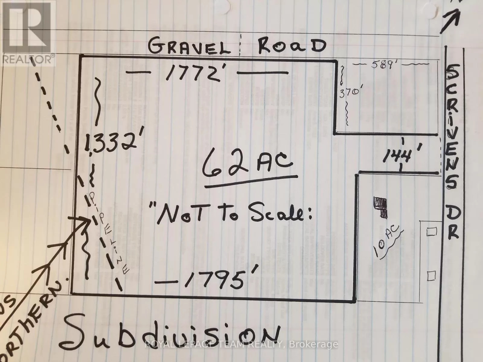 Cross Streets: Snake Island road. ** Directions: South of Stone School Rd on Bank St -Scrivens Dr on West side-follow Scrivens South 2 KMs-property on West side across from Roads Dept garage. Rare opportunity of 62 acres!-quiet unspoiled tract of land on Scrivens Dr-Rural zoning-Estate lot subdivision to the South-Fine homes are adjacent along paved road which has residential,local traffic.Idyllic rural setting with frontage on two roads.May be future potential for development.Scattered woods and open meadows await your ideas! No viewings /entry without an appointment please.Trans Northern Pipeline easement across S/W corner of land (id:27476)