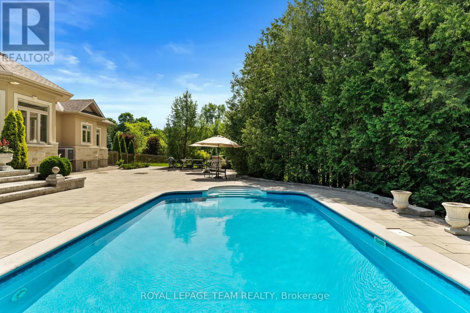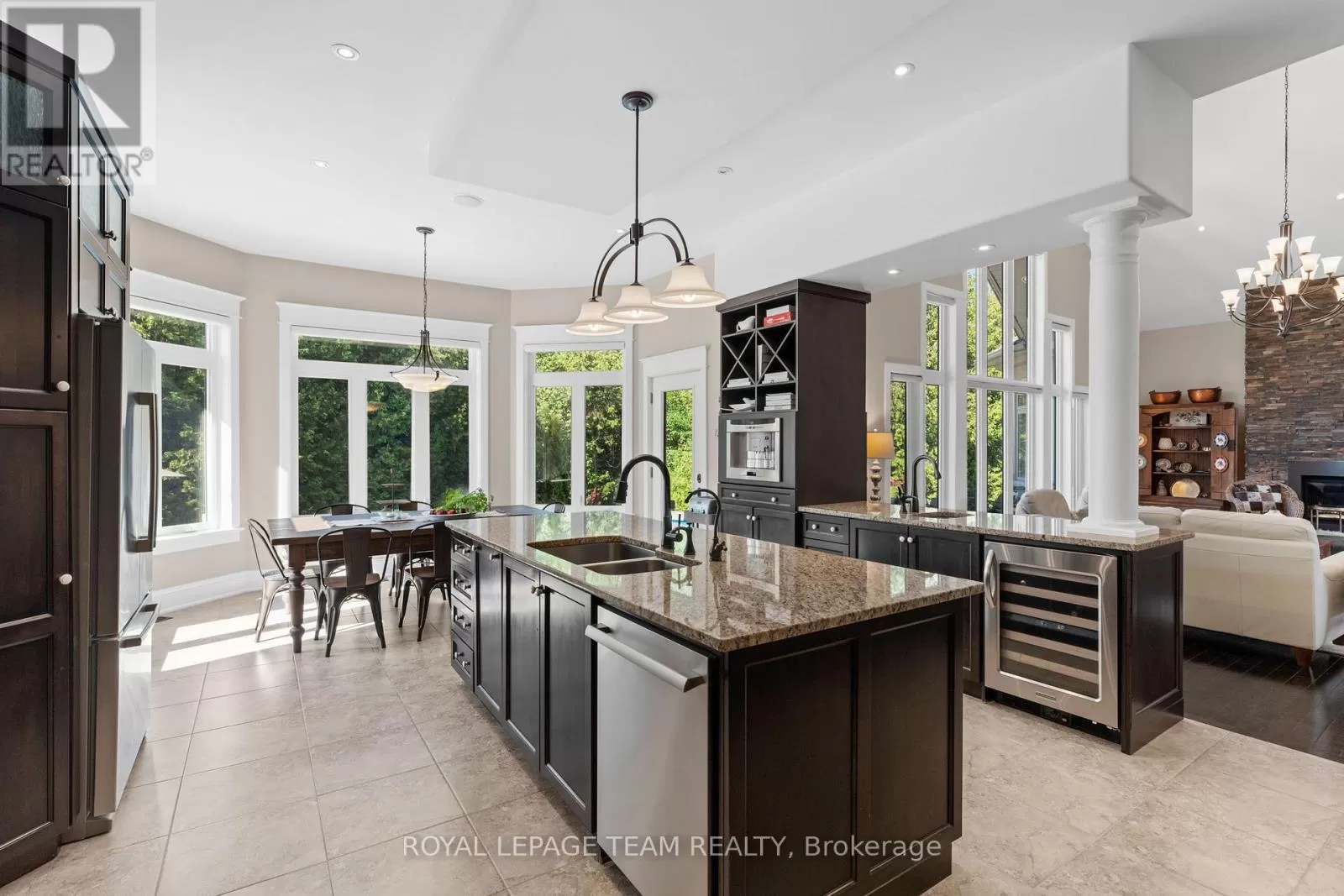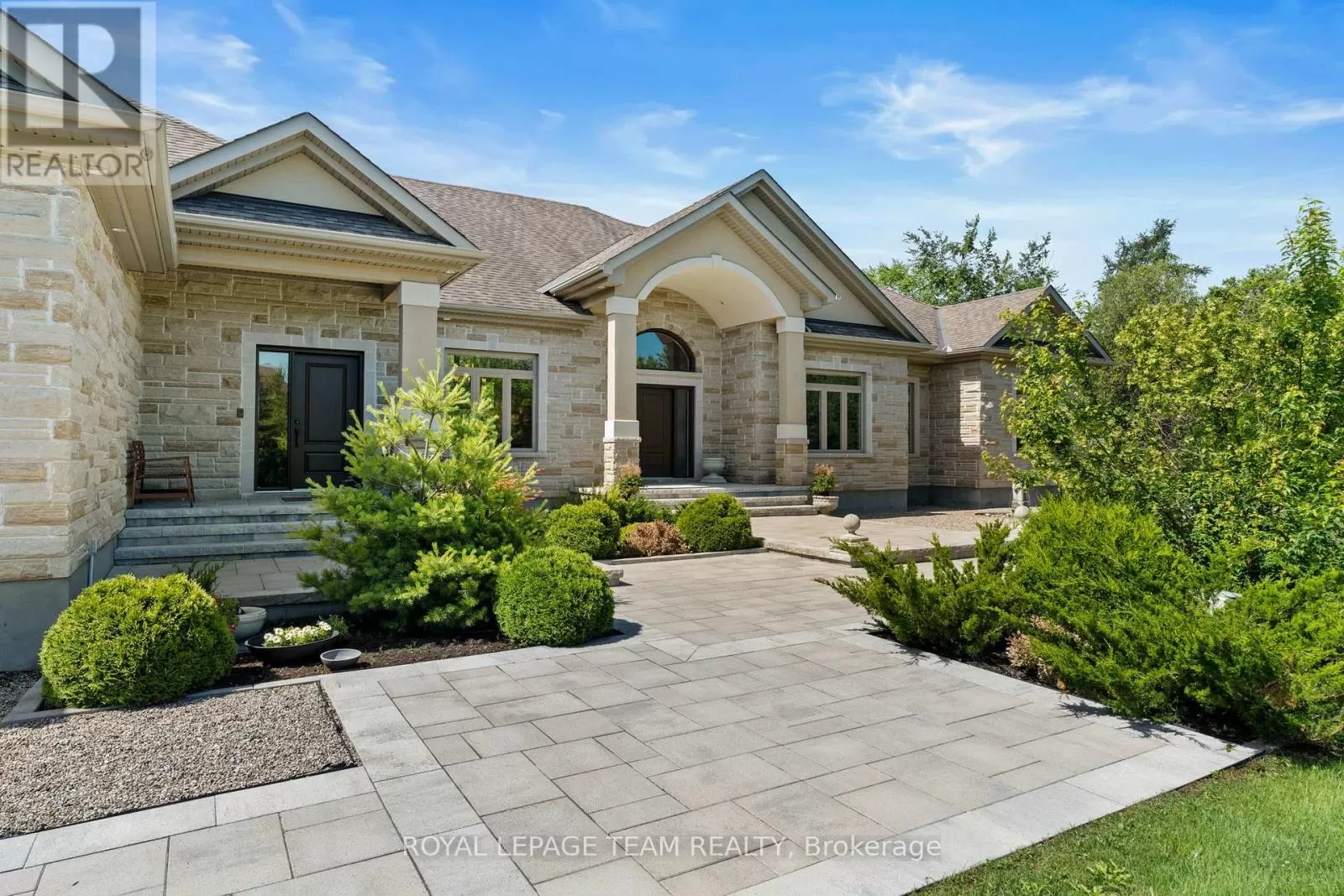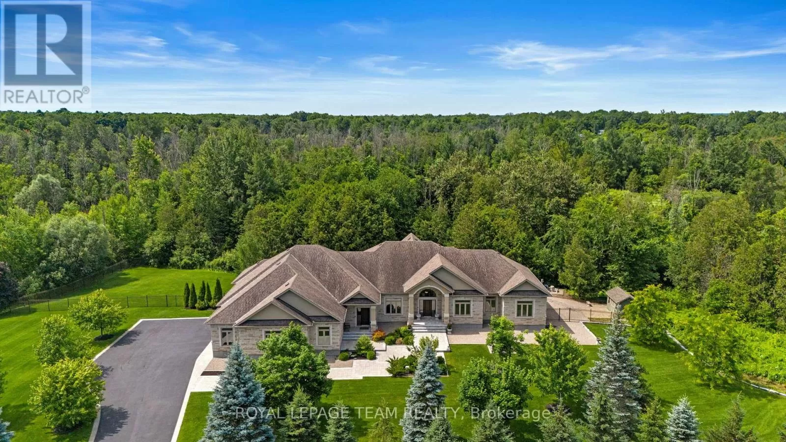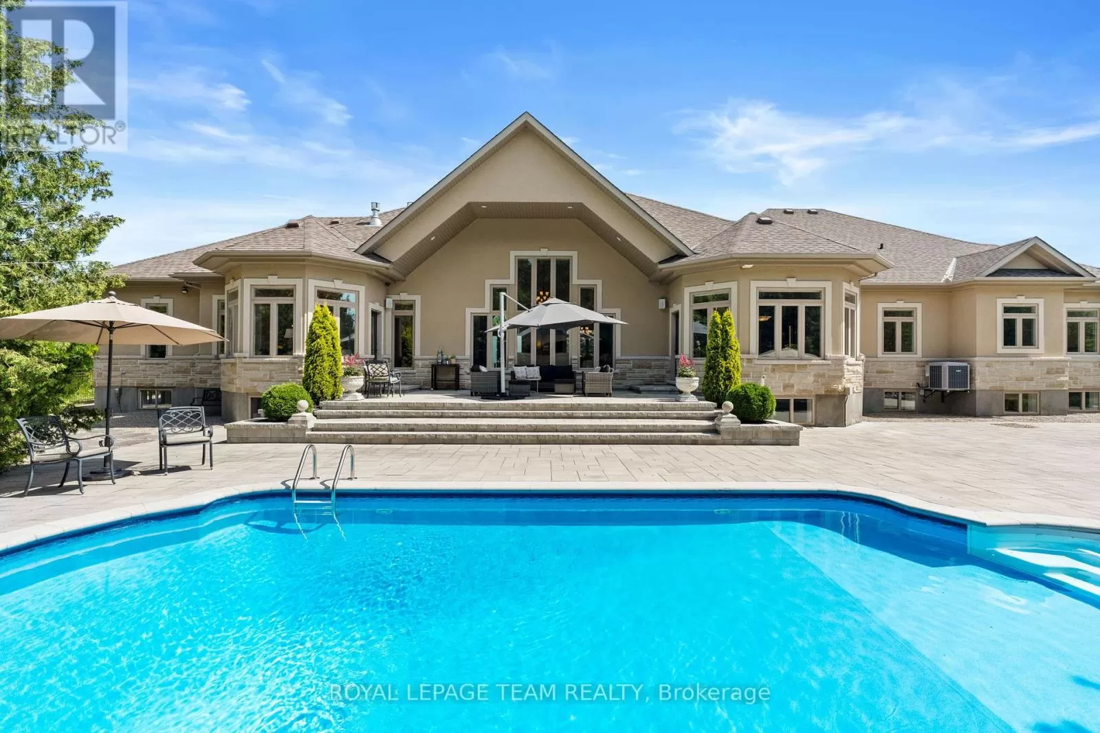Cross Streets: Dozois Road. ** Directions: From Mitch Owens Road, turn onto Dozois Rd. Turn left onto Knights Dr. Set on a sprawling 2.5-acre estate lot in Manotick's Rideau Forest, this custom-built bungalow offers an exceptional lifestyle in a setting defined by mature trees and natural beauty. The property seamlessly blends timeless design with a thoughtful layout ideal for both relaxed family living and refined gatherings. Inside, the home features elegant architectural elements, including cathedral and tray ceilings, hardwood flooring, recessed lighting, and a striking fireplace that anchors the main living area. Expansive windows fill the interior with natural light and offer peaceful views of the surrounding landscape. The eat-in kitchen is beautifully appointed with rich wood cabinetry, granite countertops, stainless steel appliances, a centre island, a distinctive backsplash, and a walk-in pantry. Adjacent formal and informal living areas offer flexibility for everyday living and hosting. Three bedrooms are located on the main level, including a private primary suite with its own fireplace, walk-in closet, and a luxurious five-piece ensuite. The fully finished lower level offers impressive space and mirrors the quality of the main floor. It features a large recreation room with a refreshment station/wet bar, two additional bedrooms, a full bathroom, a home office, and flexible areas that can adapt to a variety of needs. Outdoors, the property unfolds into a private oasis that invites you to unwind. Professionally landscaped, it features multiple patios and an inground saltwater pool, all surrounded by a backdrop of mature woodland that ensures privacy. A truly exceptional residence, located just moments from amenities in the charming village of Manotick. (id:27476)
