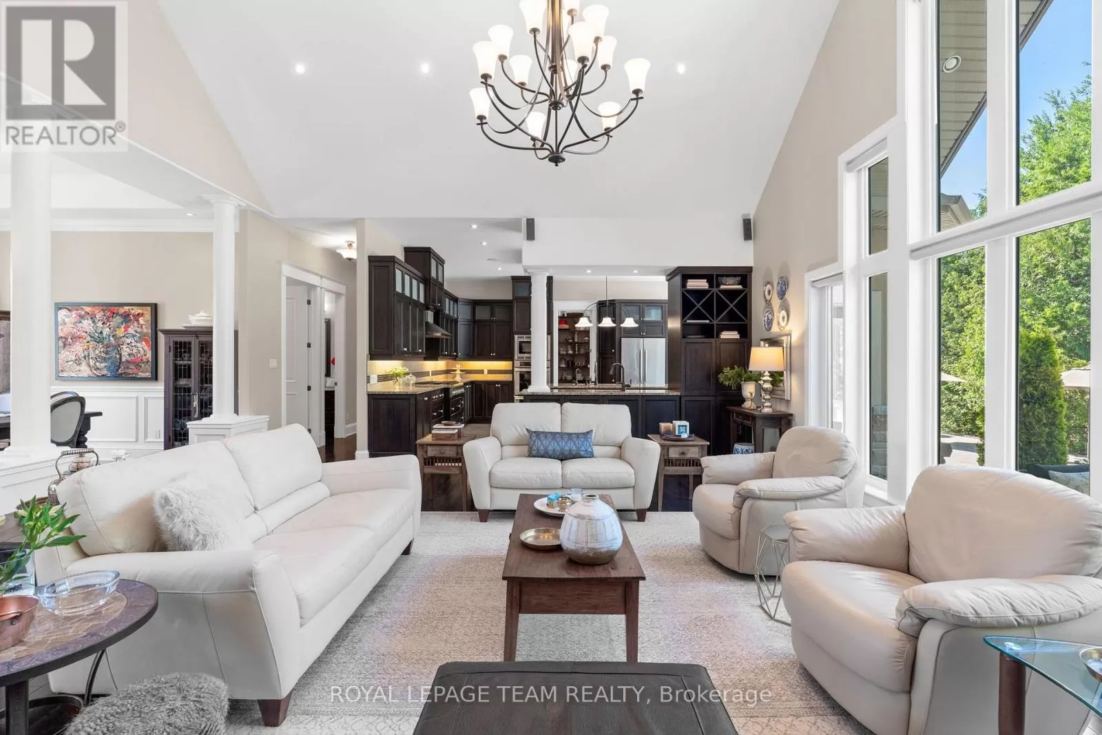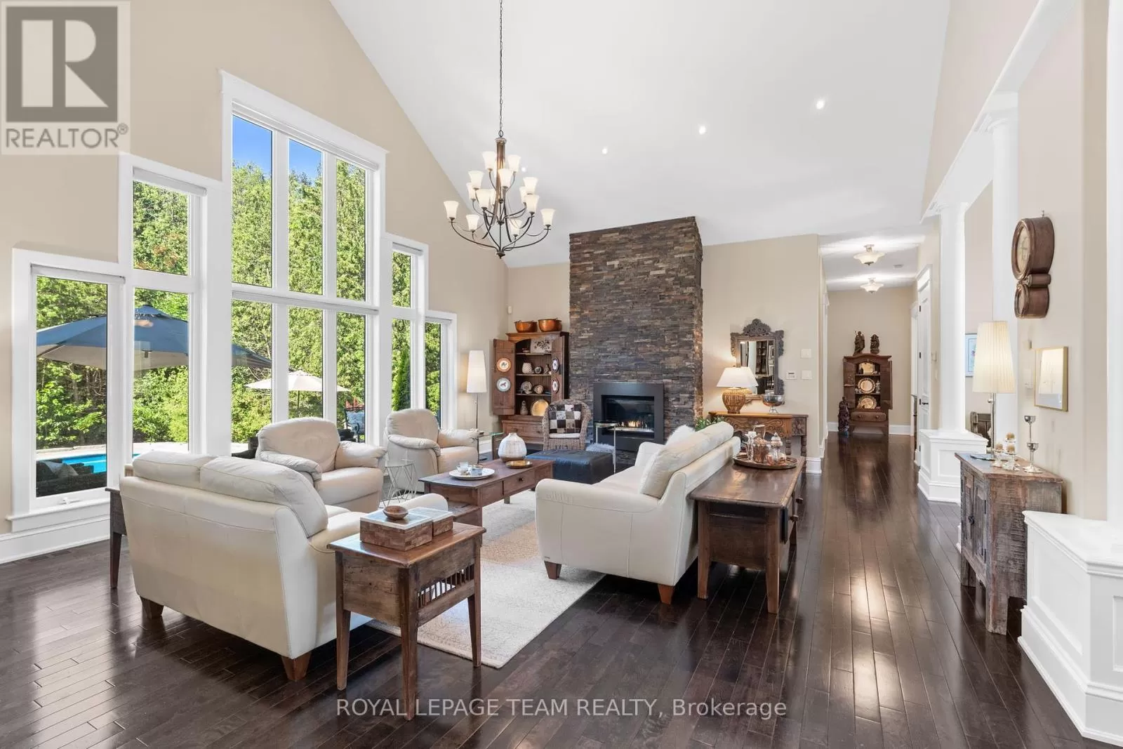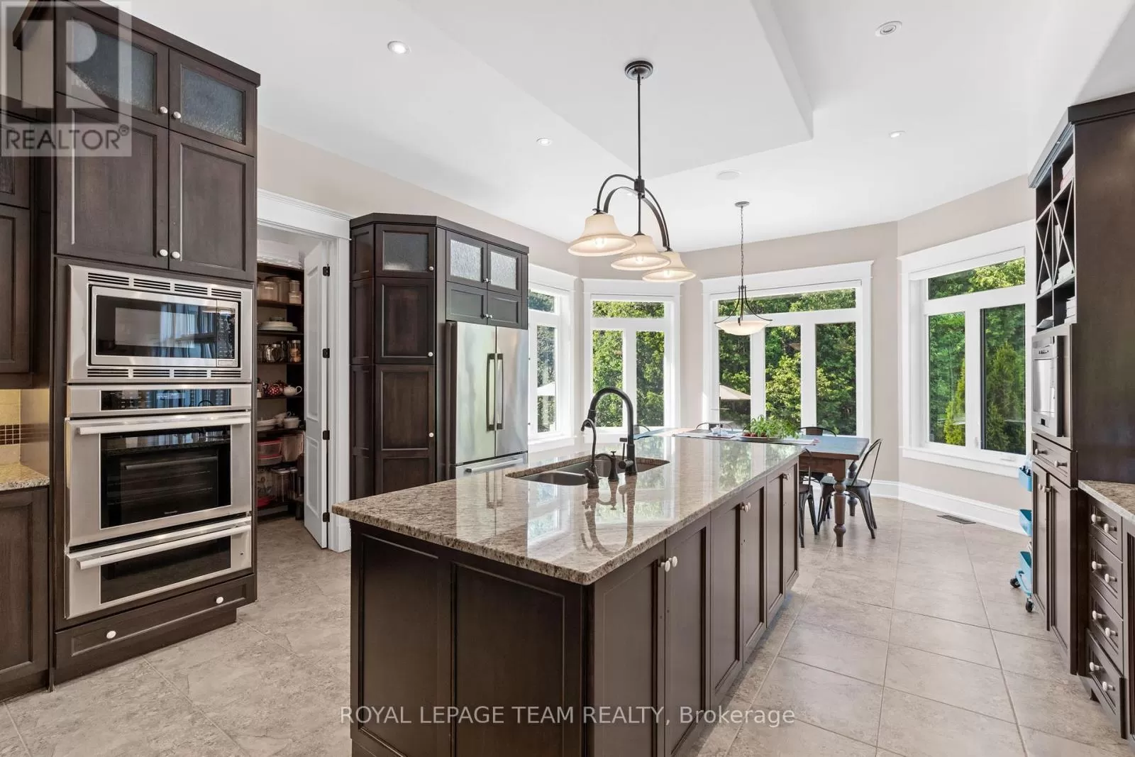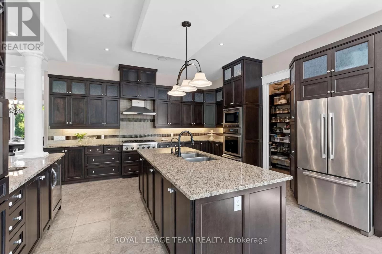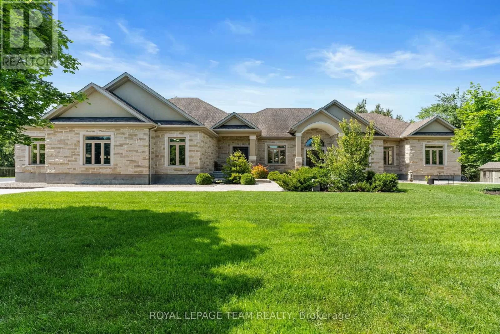 Cross Streets: Dozois Road. ** Directions: From Mitch Owens Road, turn onto Dozois Rd. Turn left onto Knights Dr. Set on a sprawling 2.5-acre estate lot in Manotick's Rideau Forest, this custom-built bungalow offers an exceptional lifestyle in a setting defined by mature trees and natural beauty. The property seamlessly blends timeless design with a thoughtful layout ideal for both relaxed family living and refined gatherings. Inside, the home features elegant architectural elements, including cathedral and tray ceilings, hardwood flooring, recessed lighting, and a striking fireplace that anchors the main living area. Expansive windows fill the interior with natural light and offer peaceful views of the surrounding landscape. The eat-in kitchen is beautifully appointed with rich wood cabinetry, granite countertops, stainless steel appliances, a centre island, a distinctive backsplash, and a walk-in pantry. Adjacent formal and informal living areas offer flexibility for everyday living and hosting. Three bedrooms are located on the main level, including a private primary suite with its own fireplace, walk-in closet, and a luxurious five-piece ensuite. The fully finished lower level offers impressive space and mirrors the quality of the main floor. It features a large recreation room with a refreshment station/wet bar, two additional bedrooms, a full bathroom, a home office, and flexible areas that can adapt to a variety of needs. Outdoors, the property unfolds into a private oasis that invites you to unwind. Professionally landscaped, it features multiple patios and an inground saltwater pool, all surrounded by a backdrop of mature woodland that ensures privacy. A truly exceptional residence, located just moments from amenities in the charming village of Manotick. (id:27476)