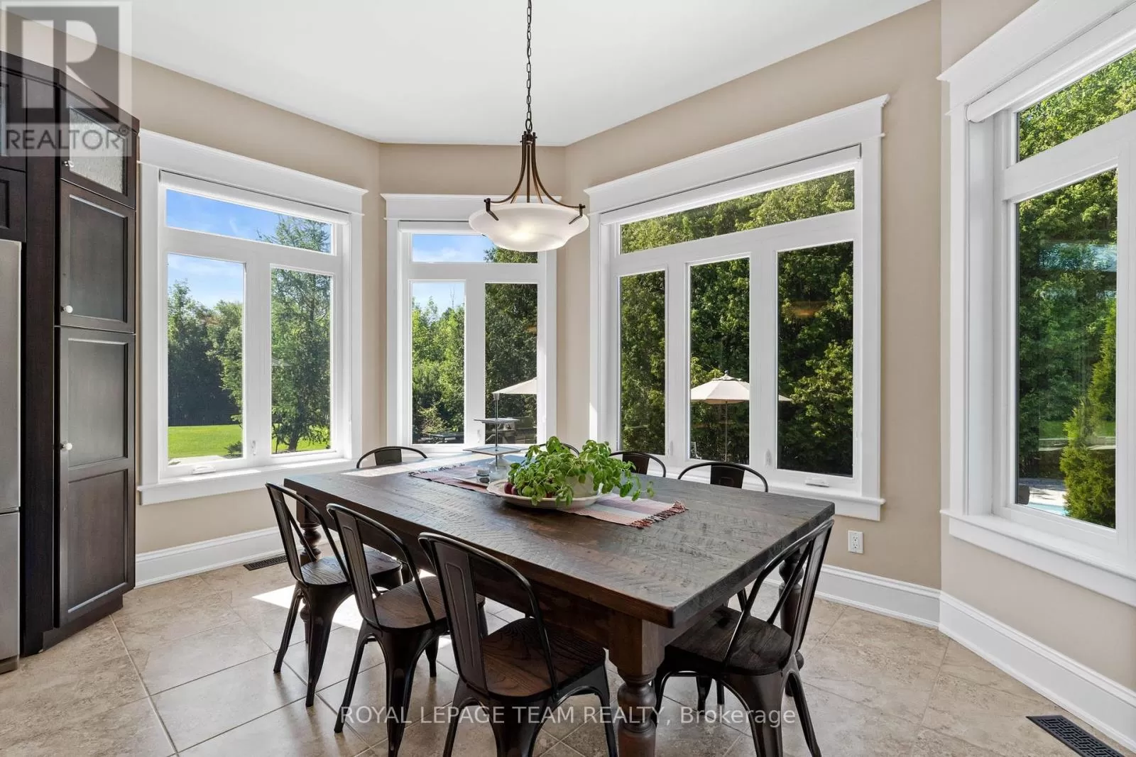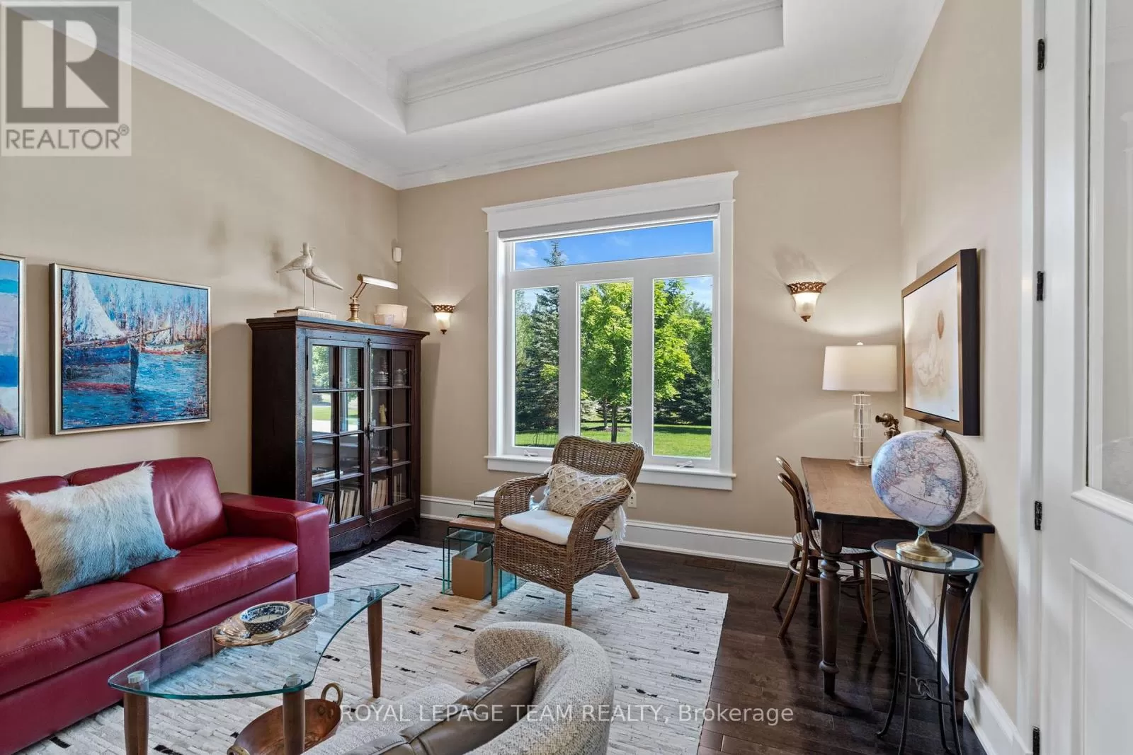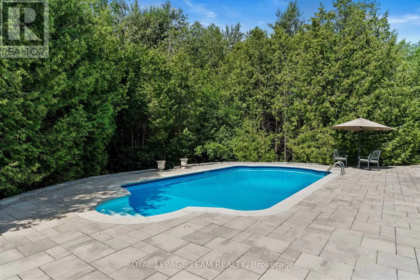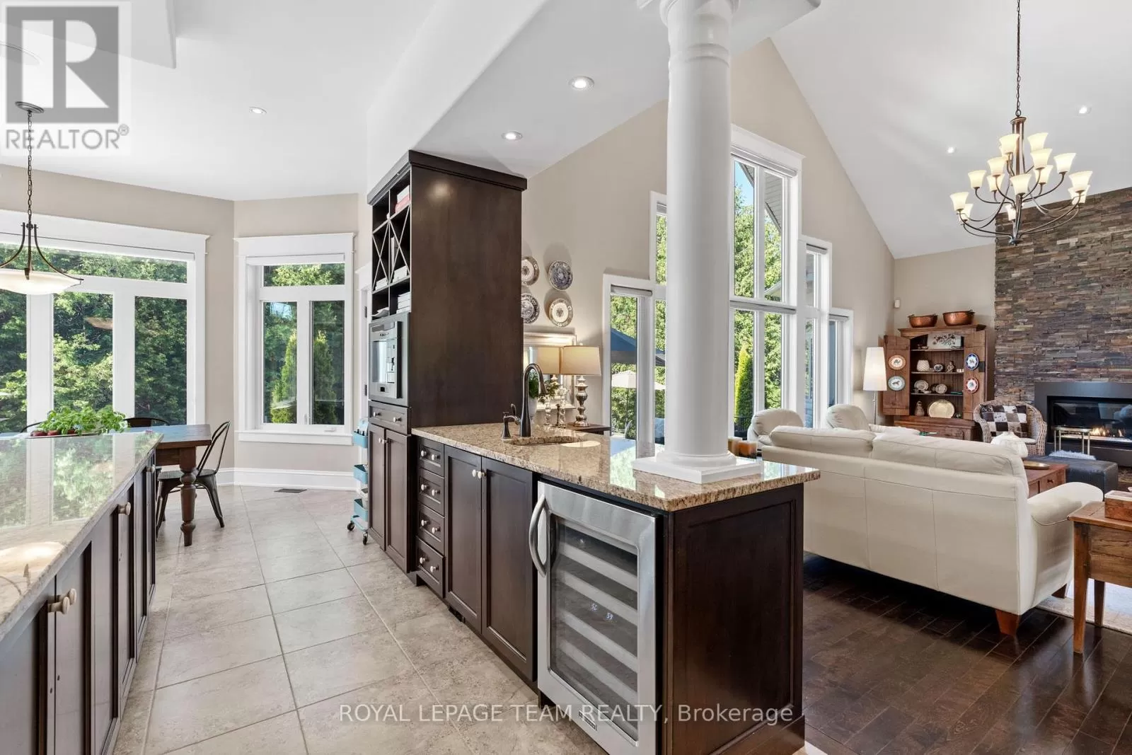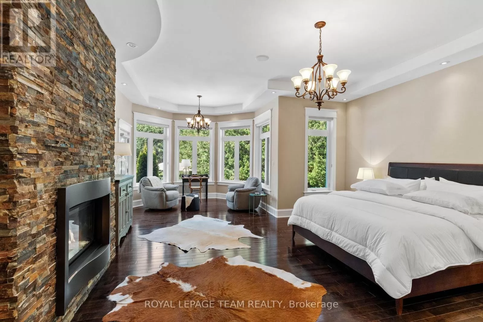 Cross Streets: Dozois Road. ** Directions: From Mitch Owens Road, turn onto Dozois Rd. Turn left onto Knights Dr. Set on a sprawling 2.5-acre estate lot in Manotick's Rideau Forest, this custom-built bungalow offers an exceptional lifestyle in a setting defined by mature trees and natural beauty. The property seamlessly blends timeless design with a thoughtful layout ideal for both relaxed family living and refined gatherings. Inside, the home features elegant architectural elements, including cathedral and tray ceilings, hardwood flooring, recessed lighting, and a striking fireplace that anchors the main living area. Expansive windows fill the interior with natural light and offer peaceful views of the surrounding landscape. The eat-in kitchen is beautifully appointed with rich wood cabinetry, granite countertops, stainless steel appliances, a centre island, a distinctive backsplash, and a walk-in pantry. Adjacent formal and informal living areas offer flexibility for everyday living and hosting. Three bedrooms are located on the main level, including a private primary suite with its own fireplace, walk-in closet, and a luxurious five-piece ensuite. The fully finished lower level offers impressive space and mirrors the quality of the main floor. It features a large recreation room with a refreshment station/wet bar, two additional bedrooms, a full bathroom, a home office, and flexible areas that can adapt to a variety of needs. Outdoors, the property unfolds into a private oasis that invites you to unwind. Professionally landscaped, it features multiple patios and an inground saltwater pool, all surrounded by a backdrop of mature woodland that ensures privacy. A truly exceptional residence, located just moments from amenities in the charming village of Manotick. (id:27476)