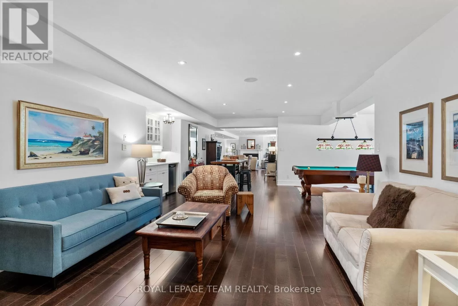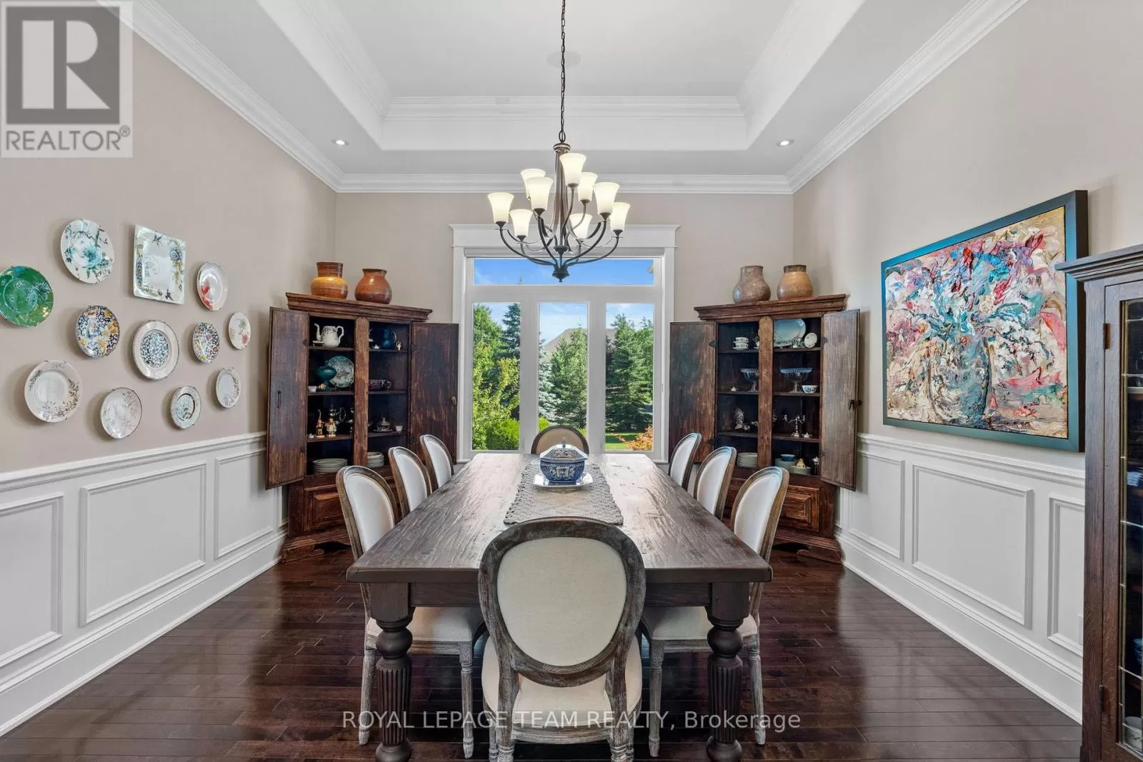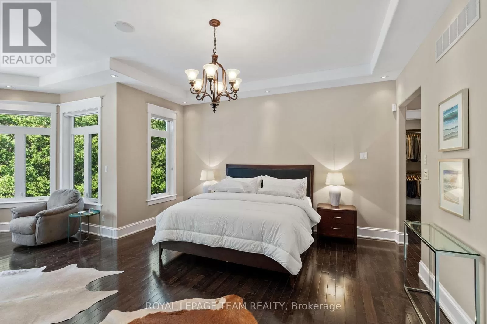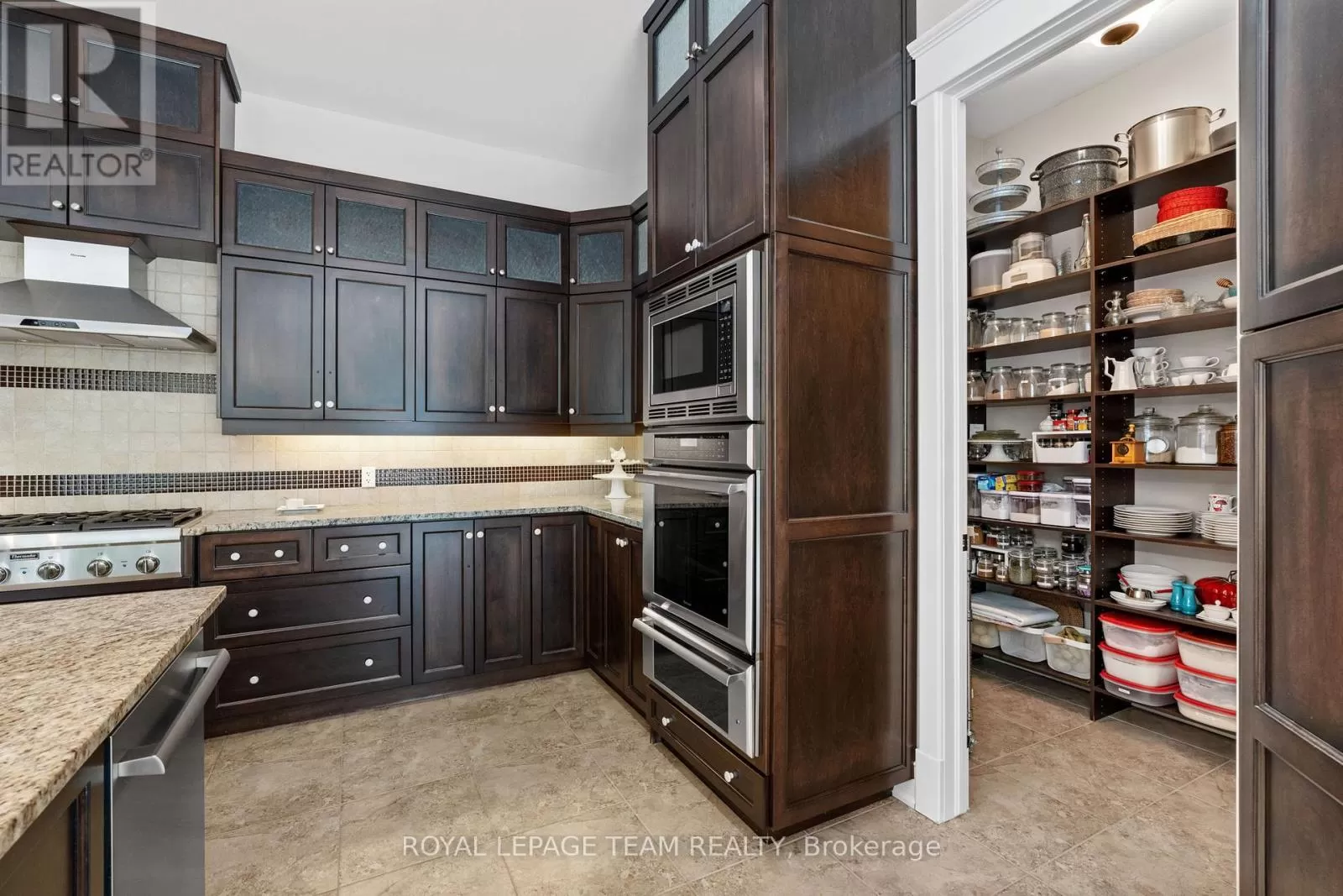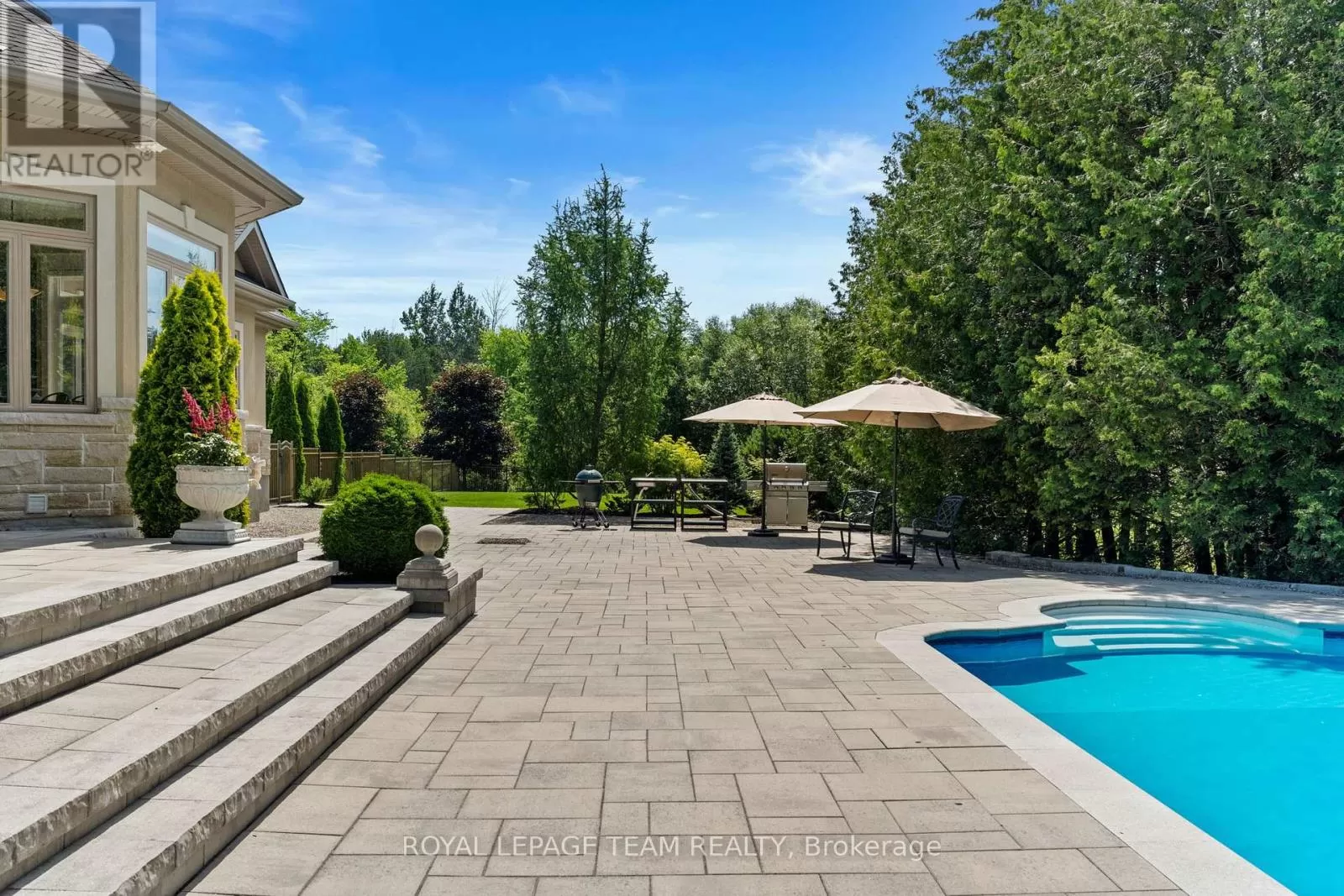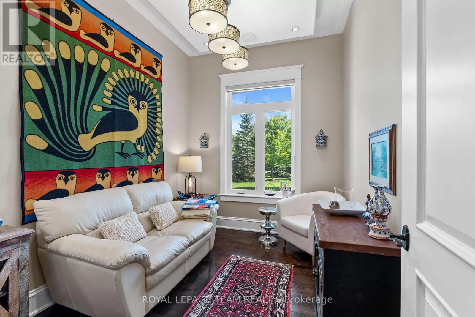 Cross Streets: Dozois Road. ** Directions: From Mitch Owens Road, turn onto Dozois Rd. Turn left onto Knights Dr. Set on a sprawling 2.5-acre estate lot in Manotick's Rideau Forest, this custom-built bungalow offers an exceptional lifestyle in a setting defined by mature trees and natural beauty. The property seamlessly blends timeless design with a thoughtful layout ideal for both relaxed family living and refined gatherings. Inside, the home features elegant architectural elements, including cathedral and tray ceilings, hardwood flooring, recessed lighting, and a striking fireplace that anchors the main living area. Expansive windows fill the interior with natural light and offer peaceful views of the surrounding landscape. The eat-in kitchen is beautifully appointed with rich wood cabinetry, granite countertops, stainless steel appliances, a centre island, a distinctive backsplash, and a walk-in pantry. Adjacent formal and informal living areas offer flexibility for everyday living and hosting. Three bedrooms are located on the main level, including a private primary suite with its own fireplace, walk-in closet, and a luxurious five-piece ensuite. The fully finished lower level offers impressive space and mirrors the quality of the main floor. It features a large recreation room with a refreshment station/wet bar, two additional bedrooms, a full bathroom, a home office, and flexible areas that can adapt to a variety of needs. Outdoors, the property unfolds into a private oasis that invites you to unwind. Professionally landscaped, it features multiple patios and an inground saltwater pool, all surrounded by a backdrop of mature woodland that ensures privacy. A truly exceptional residence, located just moments from amenities in the charming village of Manotick. (id:27476)