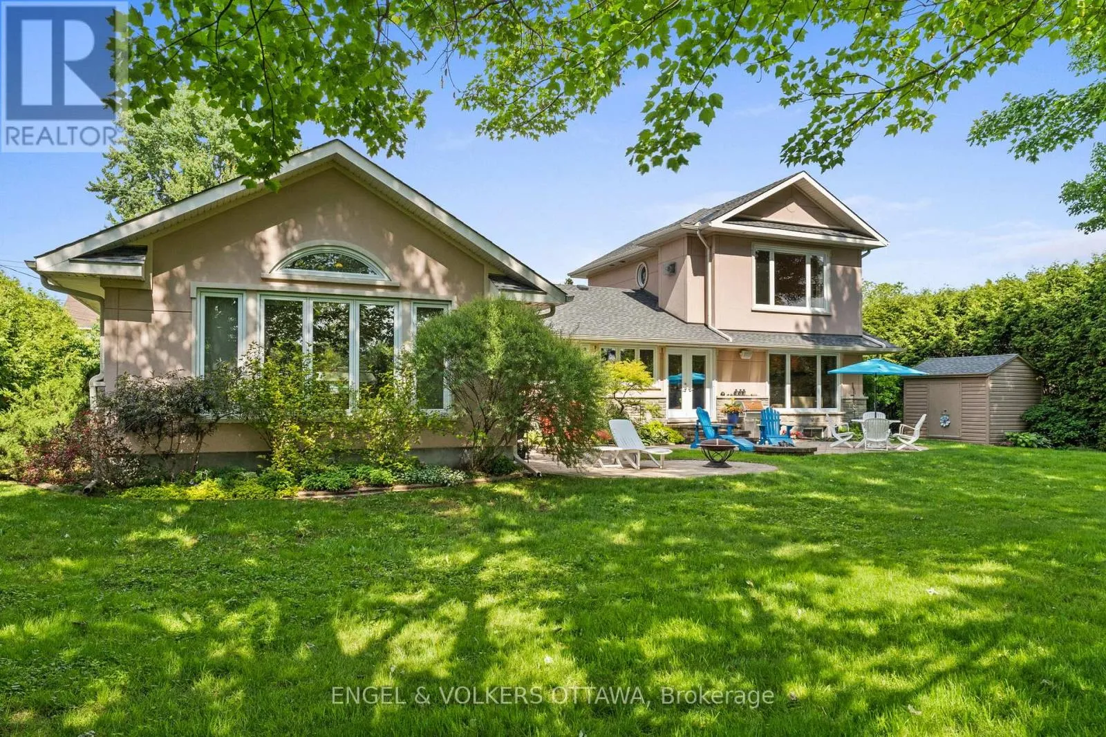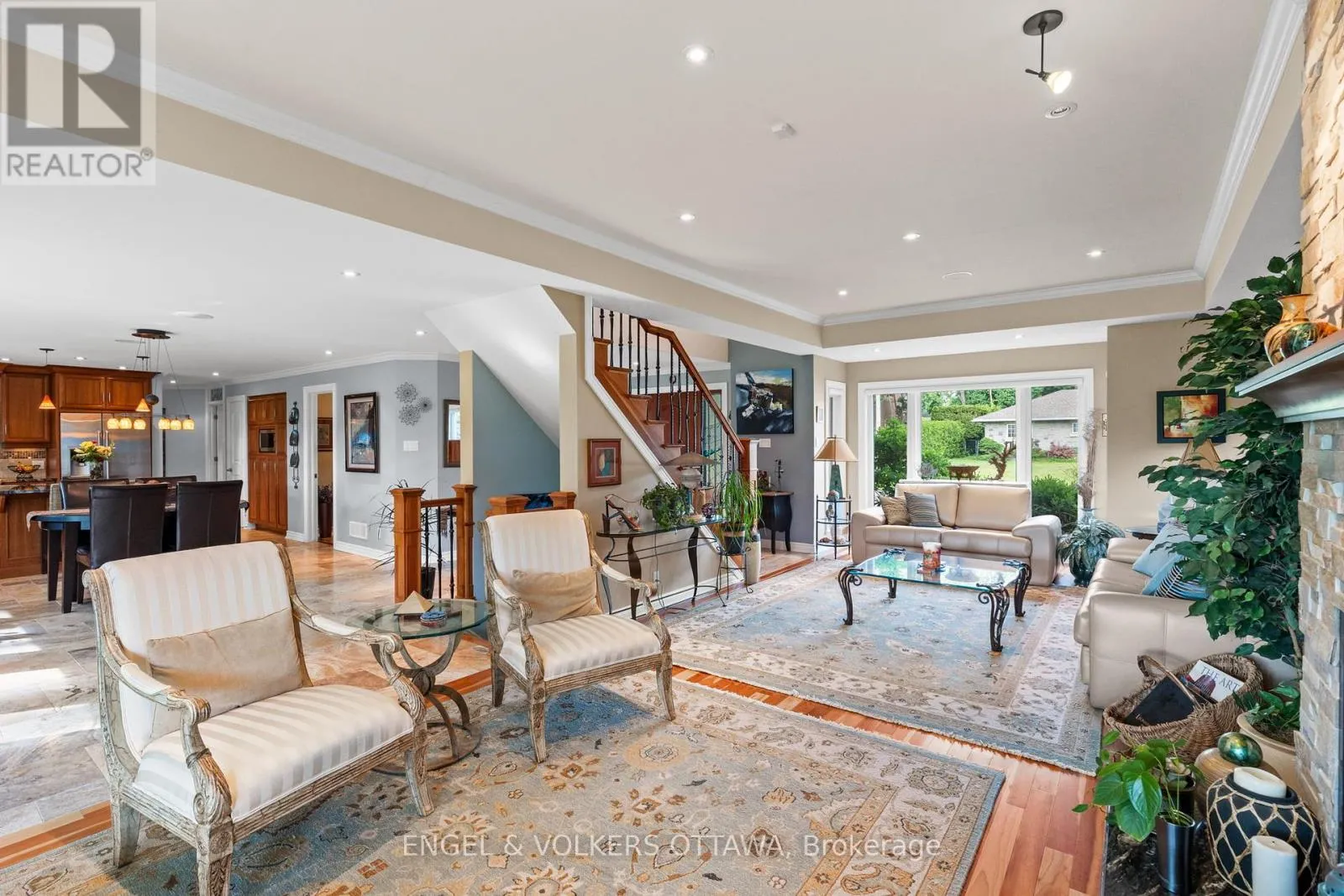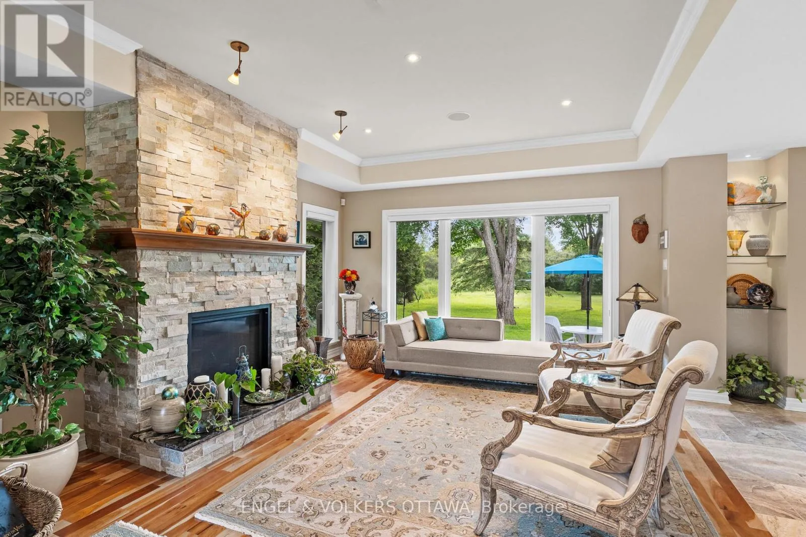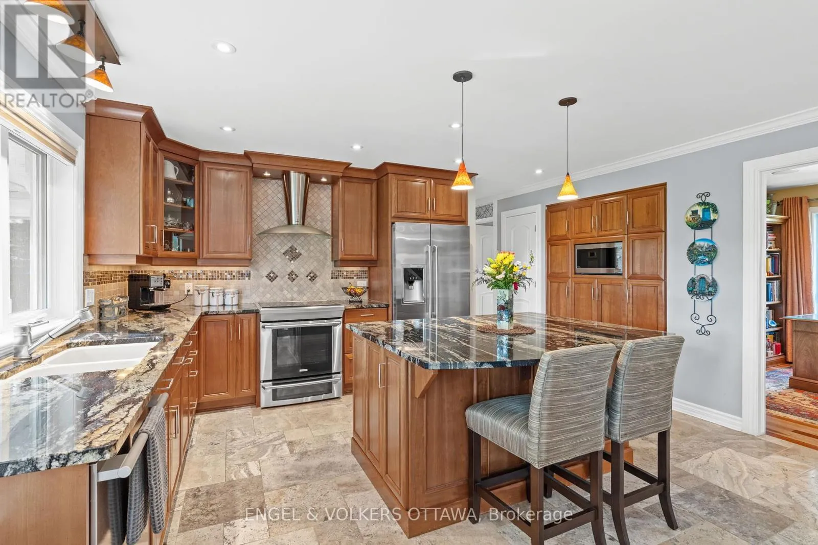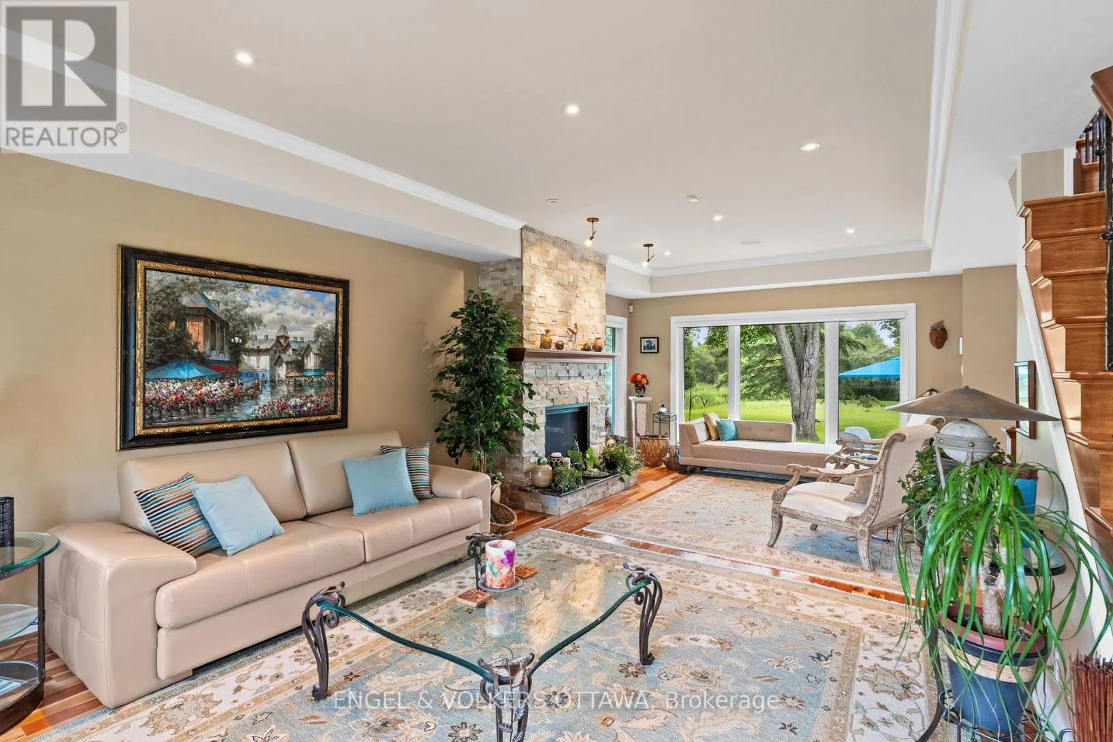 Bank Street south right on Kemp Drive and left on Doris Avenue. Situated on a private, tree-lined lot backing onto NCC greenspace, 24 Doris Avenue offers $100,000+ in custom stained glass and over $100,000 in landscaping. This custom home sits in the heart of Kemp Park, surrounded by an enclave of fellow expansive custom homes. The main level welcomes you with an elegant stone-clad portico and arched entry, opening to a grand foyer with custom stained glass and rich cherry wood floors. At the heart of the home, a spacious open-concept living and dining area features a floor-to-ceiling stone fireplace, coffered ceiling, and oversized windows framing the serene backyard. The chef's kitchen is equally impressive, boasting an oversized island with black-and-gold granite, extensive cherry wood cabinetry, and premium stainless steel appliances - perfect for hosting or casual family meals. Off the kitchen, a dedicated office provides an ideal workspace, while a full steam room with shower offers a spa-like experience. Two generous main floor bedrooms, a beautifully appointed full bath, and a laundry area just off the garage complete this level. Upstairs, the private primary suite with vaulted ceilings, a natural gas fireplace, expansive windows, and tranquil views is designed for relaxation. The ensuite features a deep soaker tub, walk-in glass shower, dual vanities with granite counters, and elegant finishes throughout. The fully finished lower level offers exceptional flexibility. A bright recreation room, dedicated home theatre, and gym accommodate a variety of lifestyle needs. Outdoors, the landscaped backyard is an entertainer's dream. A large interlock patio, outdoor fireplace, and natural gas BBQ connection make outdoor living seamless. The property spans over a third of an acre, offering privacy and a rare connection to surrounding greenspace. With close proximity to schools, parks, the Airport Parkway, and South Keys Shopping Centre, this exceptional home offers luxurious city living in a tranquil, sought-after setting. (id:27476)