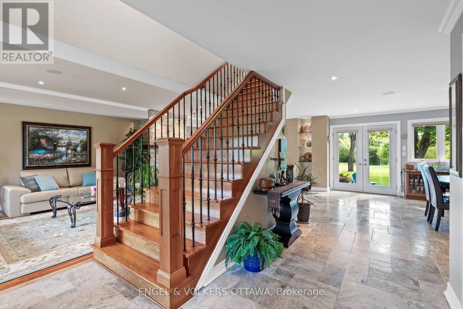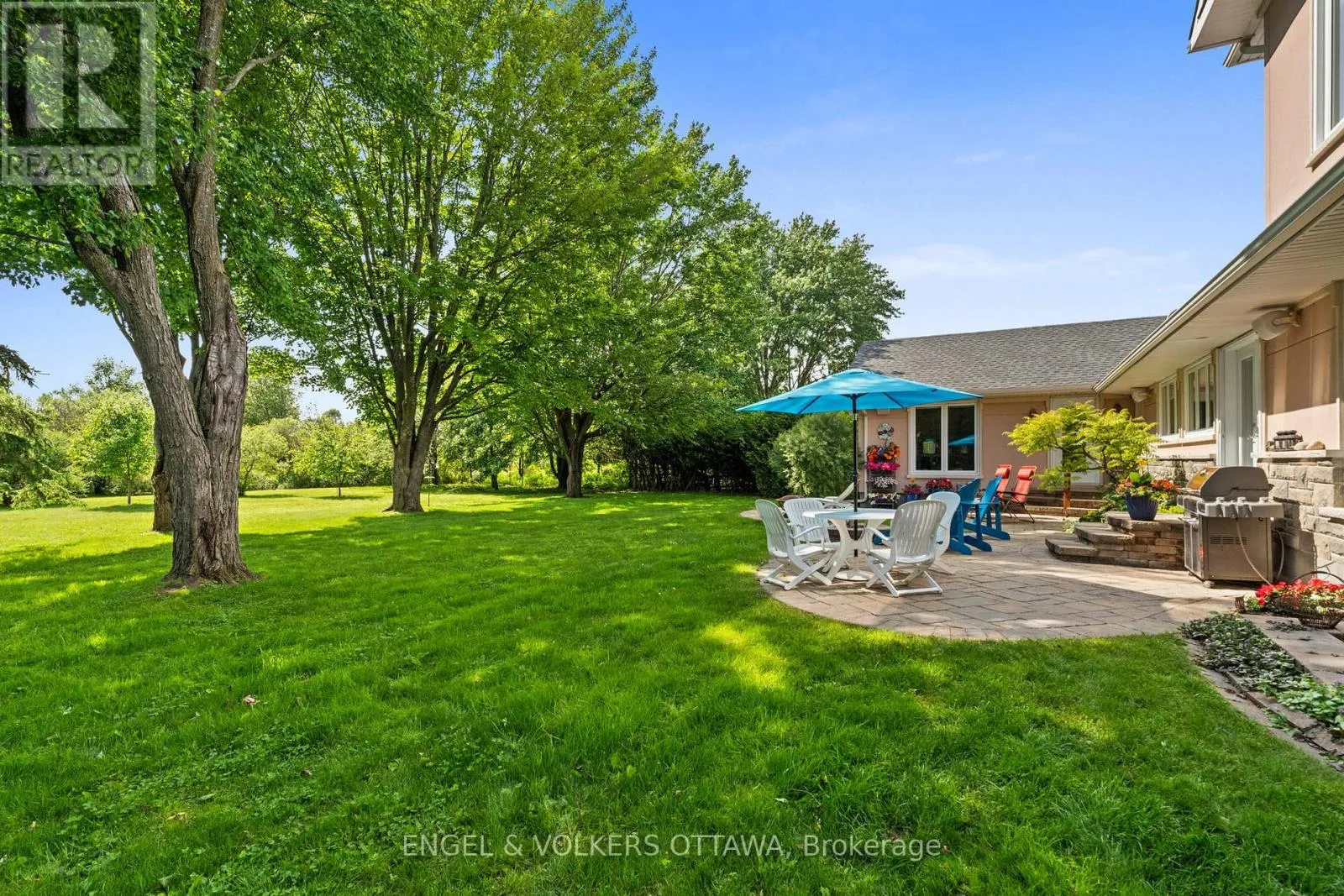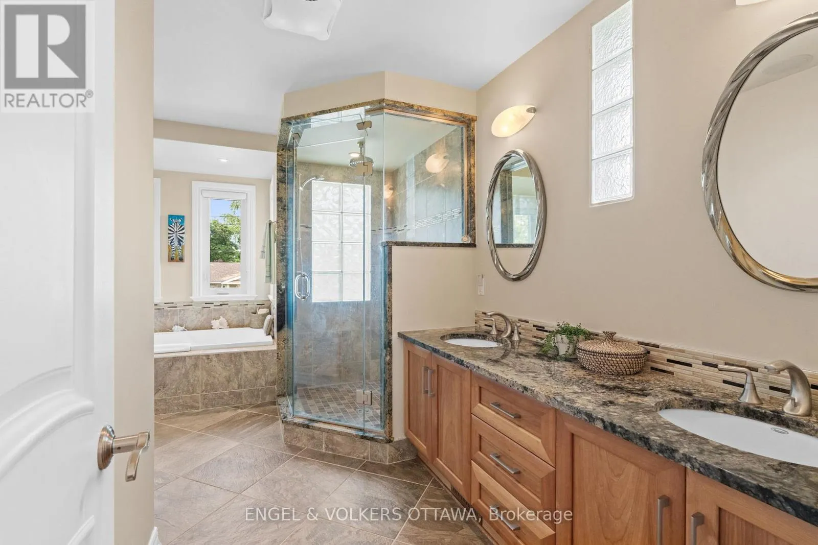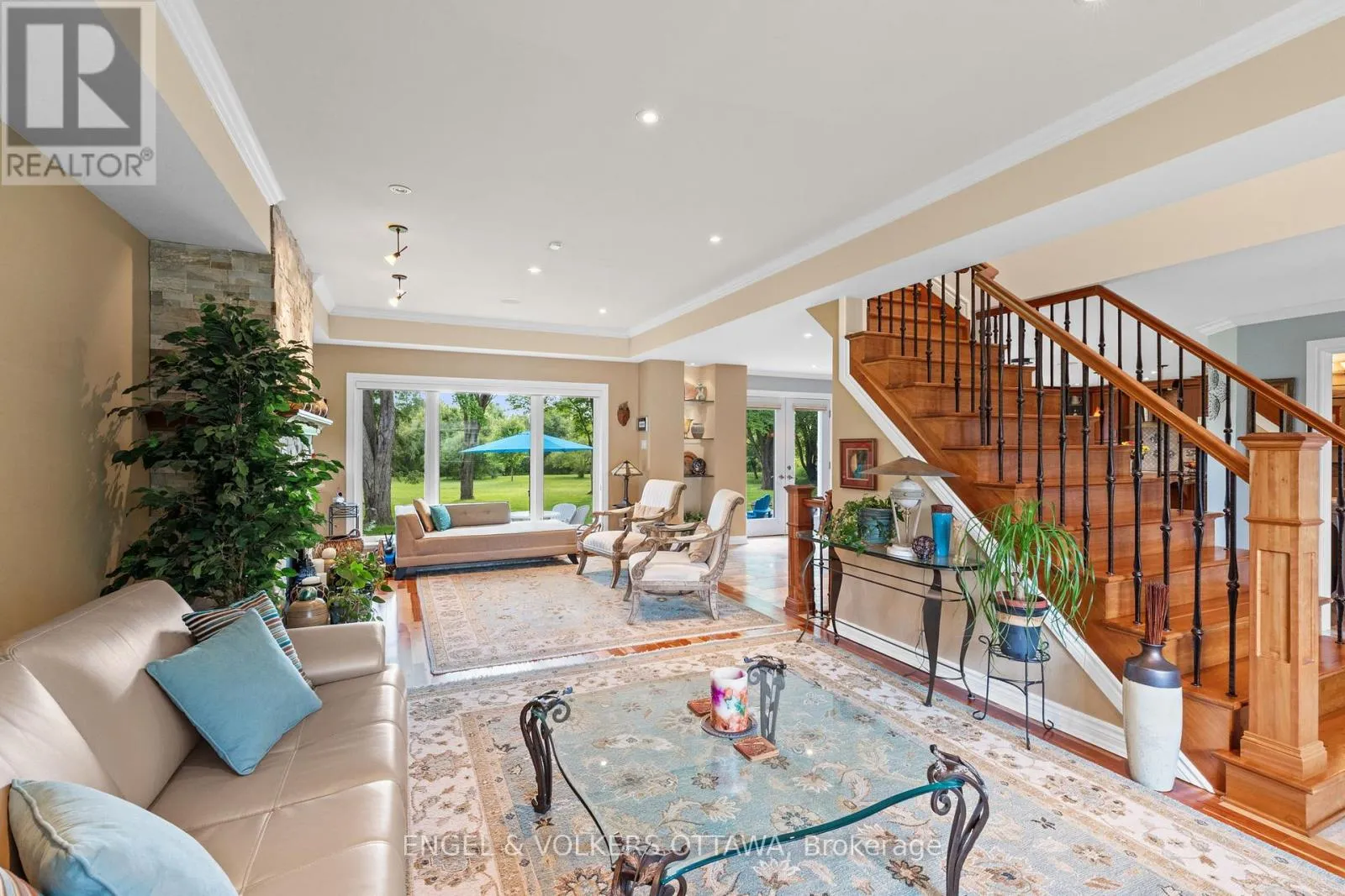 Bank Street south right on Kemp Drive and left on Doris Avenue. Situated on a private, tree-lined lot backing onto NCC greenspace, 24 Doris Avenue offers $100,000+ in custom stained glass and over $100,000 in landscaping. This custom home sits in the heart of Kemp Park, surrounded by an enclave of fellow expansive custom homes. The main level welcomes you with an elegant stone-clad portico and arched entry, opening to a grand foyer with custom stained glass and rich cherry wood floors. At the heart of the home, a spacious open-concept living and dining area features a floor-to-ceiling stone fireplace, coffered ceiling, and oversized windows framing the serene backyard. The chef's kitchen is equally impressive, boasting an oversized island with black-and-gold granite, extensive cherry wood cabinetry, and premium stainless steel appliances - perfect for hosting or casual family meals. Off the kitchen, a dedicated office provides an ideal workspace, while a full steam room with shower offers a spa-like experience. Two generous main floor bedrooms, a beautifully appointed full bath, and a laundry area just off the garage complete this level. Upstairs, the private primary suite with vaulted ceilings, a natural gas fireplace, expansive windows, and tranquil views is designed for relaxation. The ensuite features a deep soaker tub, walk-in glass shower, dual vanities with granite counters, and elegant finishes throughout. The fully finished lower level offers exceptional flexibility. A bright recreation room, dedicated home theatre, and gym accommodate a variety of lifestyle needs. Outdoors, the landscaped backyard is an entertainer's dream. A large interlock patio, outdoor fireplace, and natural gas BBQ connection make outdoor living seamless. The property spans over a third of an acre, offering privacy and a rare connection to surrounding greenspace. With close proximity to schools, parks, the Airport Parkway, and South Keys Shopping Centre, this exceptional home offers luxurious city living in a tranquil, sought-after setting. (id:27476)