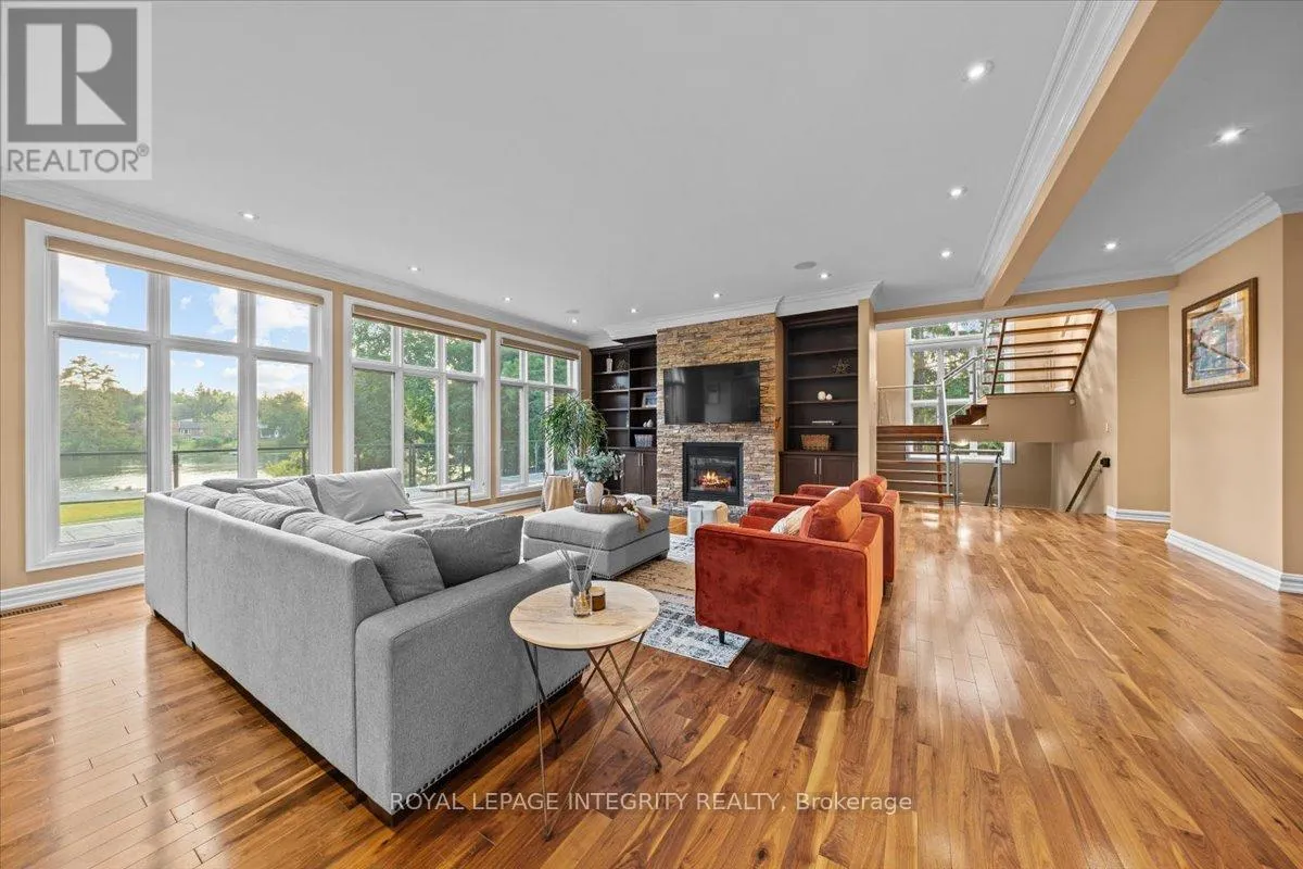 Cross Streets: River Rd & Mitch Owens Rd. ** Directions: River Road past Mitch Owens. Property is on the right side of the road. Perched along the serene Rideau River, this magnificent Italian-style villa seamlessly blends timeless elegance with modern luxury. Spanning over 7,400 sq. ft. of meticulously crafted living space, the residence delights at every turn with breathtaking river views, exquisite craftsmanship, and luxurious amenities. Beyond the dramatic 20-foot marble foyer that makes an unforgettable first impression, the home unfolds with graceful elegance. Soaring 10-foot ceilings and rich hardwood flooring flow throughout the main level, while multiple rooms showcase exquisite tray ceilings with recessed lighting, creating an ambiance of refined warmth. The formal dining room impresses with its 14-foot arched ceiling and stunning arched window that fills the space with natural light while framing picturesque outdoor views. The gourmet kitchen features a 13-foot granite island, top-tier Viking appliances, and custom walnut and Pashmina White cabinetry, complemented by a walk-in pantry for effortless entertaining. The adjoining breakfast area and family room bathe in natural light and offer panoramic water views, enhanced by a convenient wet bar and rough-in elevator. The main floor also includes a spacious executive office with private balcony access, along with a full bathroom that doubles as a guest suite. Upstairs, four bedroom suites each boast generous walk-in closets and spa-like Ensuite offers a massage shower & granite counter tops. The walkout basement serves as a versatile retreat, featuring high ceilings, oversized windows, a fifth bedroom, and a full bath. Enjoy whole-home indoor & outdoor audio system. Outside, the home's full stone façade exudes sophistication, while the expansive 650 sq. ft. balcony and private dock invite you to enjoy the breathtaking riverfront setting. Every detail of this exceptional residence has been thoughtfully designed to deliver an extraordinary living experience. (id:27476)